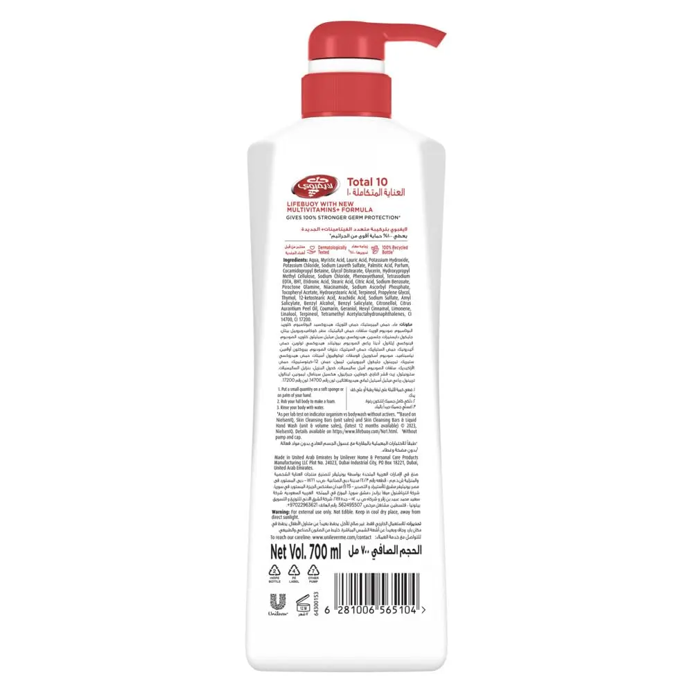 Lifebuoy Total 10 Antibacterial Body Wash provides 100% stronger germ protection* for up to 10 hours with a new multivitamin formula. Dermatologist approved and trusted globally.