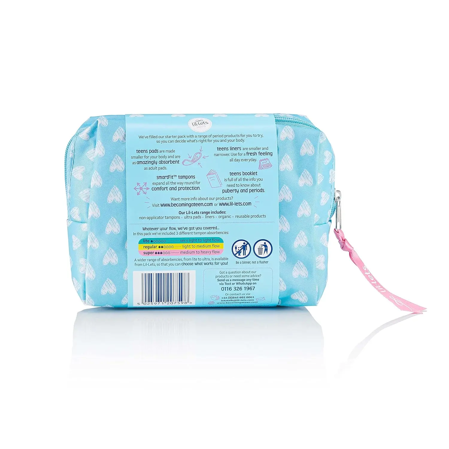 The Lil-Lets Teens Starter Pack includes pads, liners, and non-applicator tampons in a handy cosmetic bag with a useful period guide. Perfectly sized for teens!