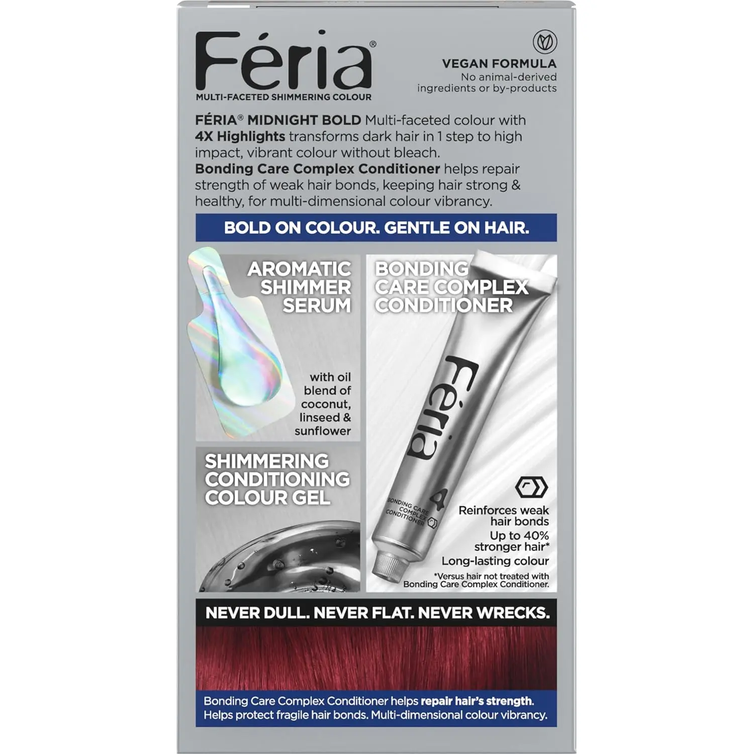 Transform your dark hair with L’Oreal Feria Midnight Hair Dye in Blood Moon and experience a vibrant, high-impact color transformation! This permanent hair color kit is designed to deliver multi-faceted shimmering tones that enhance your natural beauty. The formula is crafted for normal hair and free from gluten. Each kit includes everything you need for a salon-quality experience at home: Vibrant Permanent Hair Color Gel, Shimmering Conditioning Developer Crème, Aromatic Shimmer Serum, and our Bonding Care Complex Conditioner. The Aromatic Shimmer Serum adds a delightful scent to the coloring process, making it a more enjoyable experience. Our Bonding Care Complex Conditioner works to seal and smooth your hair after coloring, leaving it feeling soft, healthy, and looking radiant. Enjoy shimmering, multi-faceted color that will last. Feria is known for its bold, trendsetting colors. Get ready to turn heads with your Blood Moon transformation! This kit provides a complete coloring experience, ensuring optimal color deposition and conditioning. The unique formula of Feria Midnight delivers intense color without compromising the health of your hair. You’ll love the way your hair looks and feels after using this premium hair dye kit. Bring out the hidden beauty of your dark hair with L’Oreal Feria. This kit offers a convenient and effective way to achieve professional-looking results in the comfort of your own home.