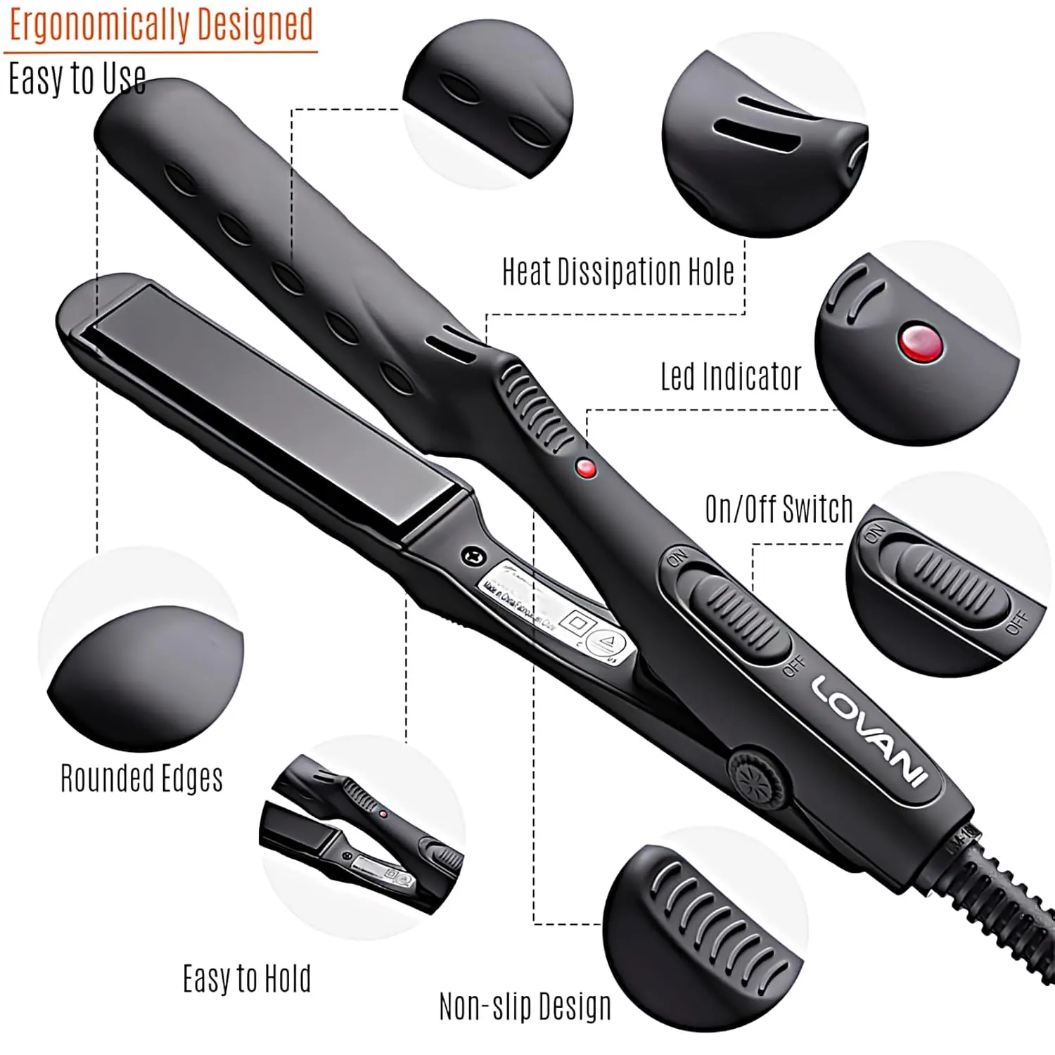 Achieve sleek, salon-worthy hair wherever you go with the Lovani Mini Travel Flat Iron. This compact and lightweight hair straightener is designed for the modern traveler, featuring a dual voltage design that allows for worldwide use. Say goodbye to frizzy or unruly hair on your adventures! Despite its small size, this mini hair iron packs a powerful punch, reaching a high heat of 410°F to deliver professional-quality results. The convenient Power ON indicator LED light lets you know when the iron is ready to use, while the included professional heat resistance bag ensures safe and easy storage. Whether you’re touching up your style on the go or creating a whole new look, the Lovani Mini Travel Flat Iron is your perfect travel companion. Its super mini size makes it easy to pack in any suitcase or carry-on, and its dual voltage compatibility means you can use it anywhere in the world. No more compromising on your hair care routine while traveling. Experience the convenience and performance of a full-size flat iron in a travel-friendly package. Get ready to turn heads with perfectly straightened hair, no matter where your travels take you!