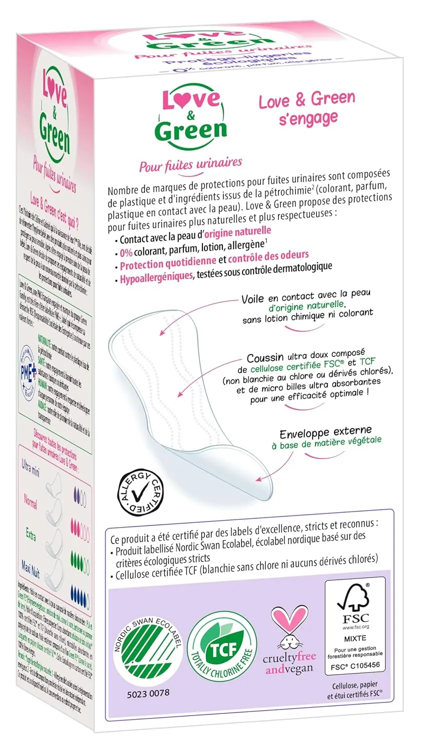 Experience ultimate comfort and confidence with Love & Green Incontinence Pads. Designed with your well-being in mind, these pads provide reliable protection without exposing you to harmful chemicals or irritants. Unlike most female hygiene products, Love & Green prioritizes natural and safe ingredients. Our pads contain absolutely no chlorine, perfume, dyes, lotion, allergens, petrolatum, or paraffin. We are committed to excluding any unwanted ingredients suspected of being carcinogenic or causing endocrine disorders. The veil in contact with your skin is made of 100% natural origin, ensuring a gentle and comfortable experience. These hypoallergenic pads are dermatologically tested, making them suitable for even the most sensitive skin. Trust Love & Green for exceptional absorbency and effective odour control, so you can feel fresh and secure throughout the day. Each pack contains 28 incontinence pads, offering long-lasting protection and peace of mind. Choose Love & Green for a healthier and more comfortable incontinence solution.
