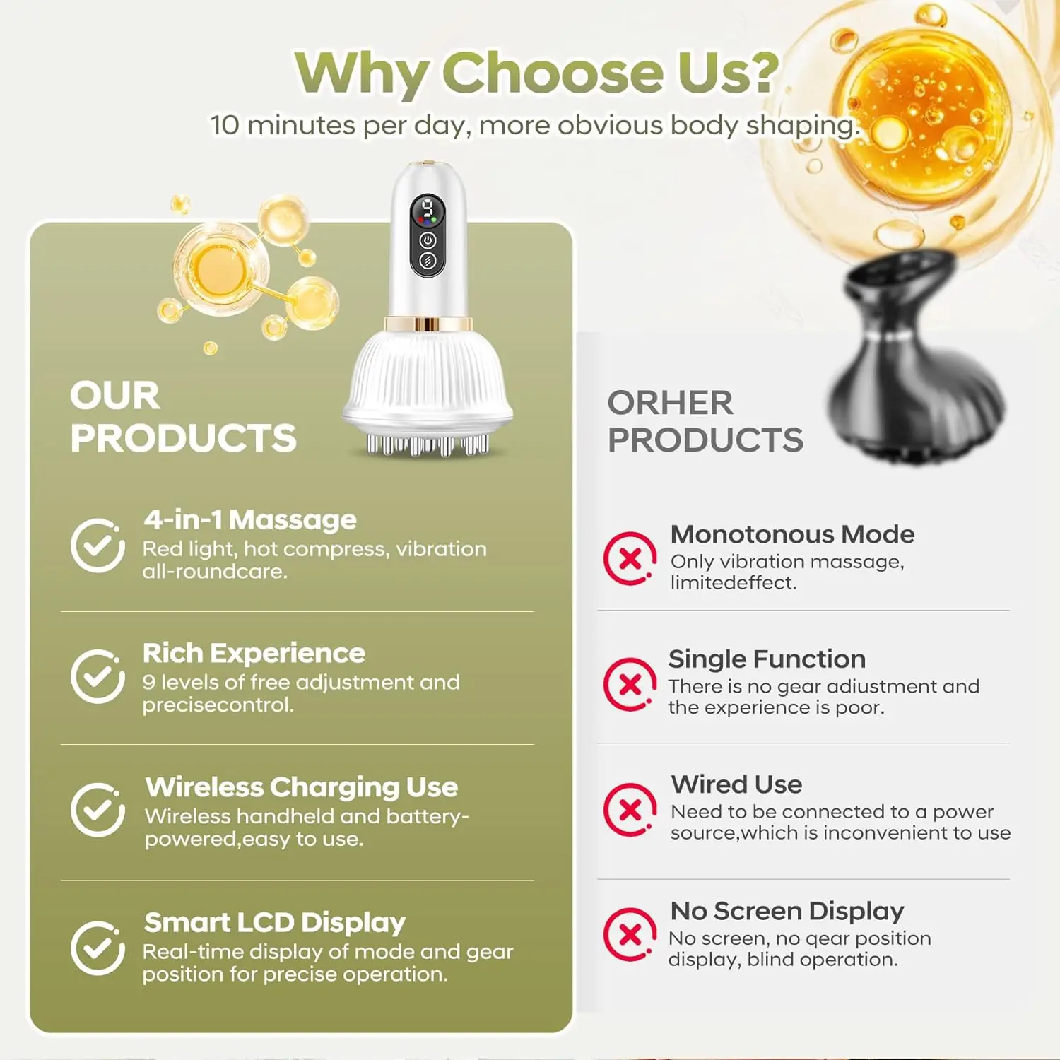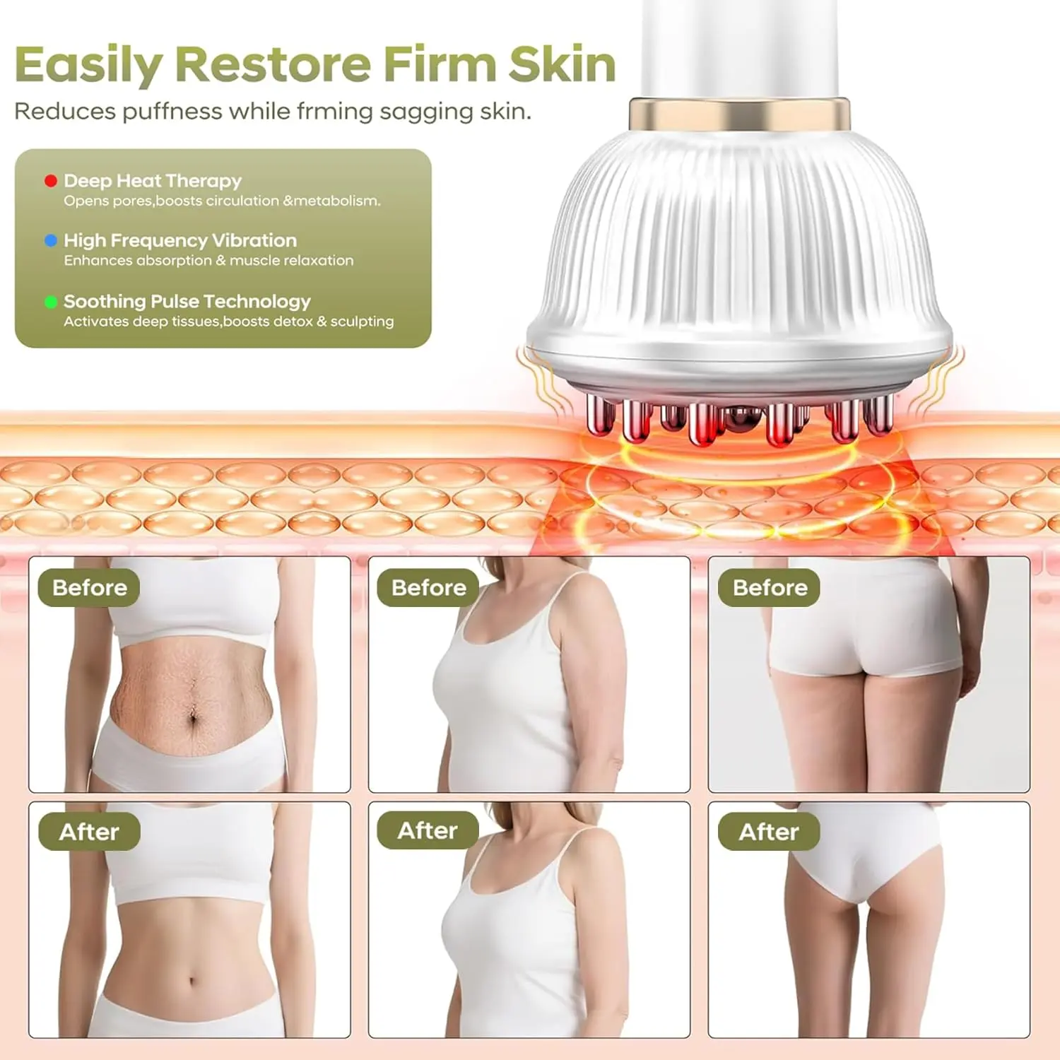 Experience the ultimate body transformation with our 3-in-1 Body Sculpt Machine! This innovative device combines precision massage, bioelectric soothing pulse technology, and red light therapy to deliver a comprehensive spa-like experience in the comfort of your own home. Effectively target cellulite, relieve muscle tension, and restore smooth, radiant skin. Our fascia blaster technology synergistically improves skin elasticity, helping you regain a firmer, more youthful appearance. The lymphatic drainage massager features 9 levels of intelligent temperature control, ranging from 45°C to 55°C, providing a soothing warm compress. This deep heat effectively relaxes tight muscles and tightens the skin, offering a double dose of relaxation and skin rejuvenation with every use. The portable cellulite machine’s powerful high-frequency vibrations reach deep tissues, stimulating target muscle groups in your legs, arms, and abdomen, accelerating movement and helping to awaken your body. Additionally, enjoy 9 levels of pulse skin care with adjustable intensity, which can help relieve discomfort caused by exercise or prolonged sitting, brighten body lines, and promote a healthy radiance from within. The smart and safe design includes a clear LED screen and 21 professional massage heads. With a one-touch start and 30-minute smart power-off function, it ensures safe and easy operation. Integrate this 5-10 minute daily routine into your lifestyle to maintain firmness and vitality for the long term.