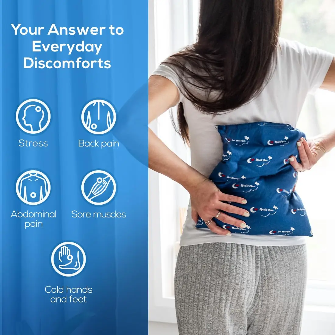 Experience soothing pain relief with the Magic Bag hot/cold compress. Made with comfortable cotton and filled with natural grains, its blue color promotes relaxation. Provides hot or cold therapy.