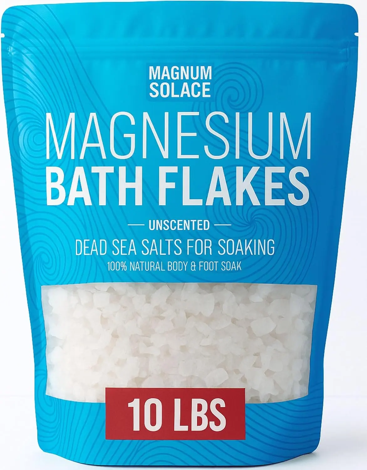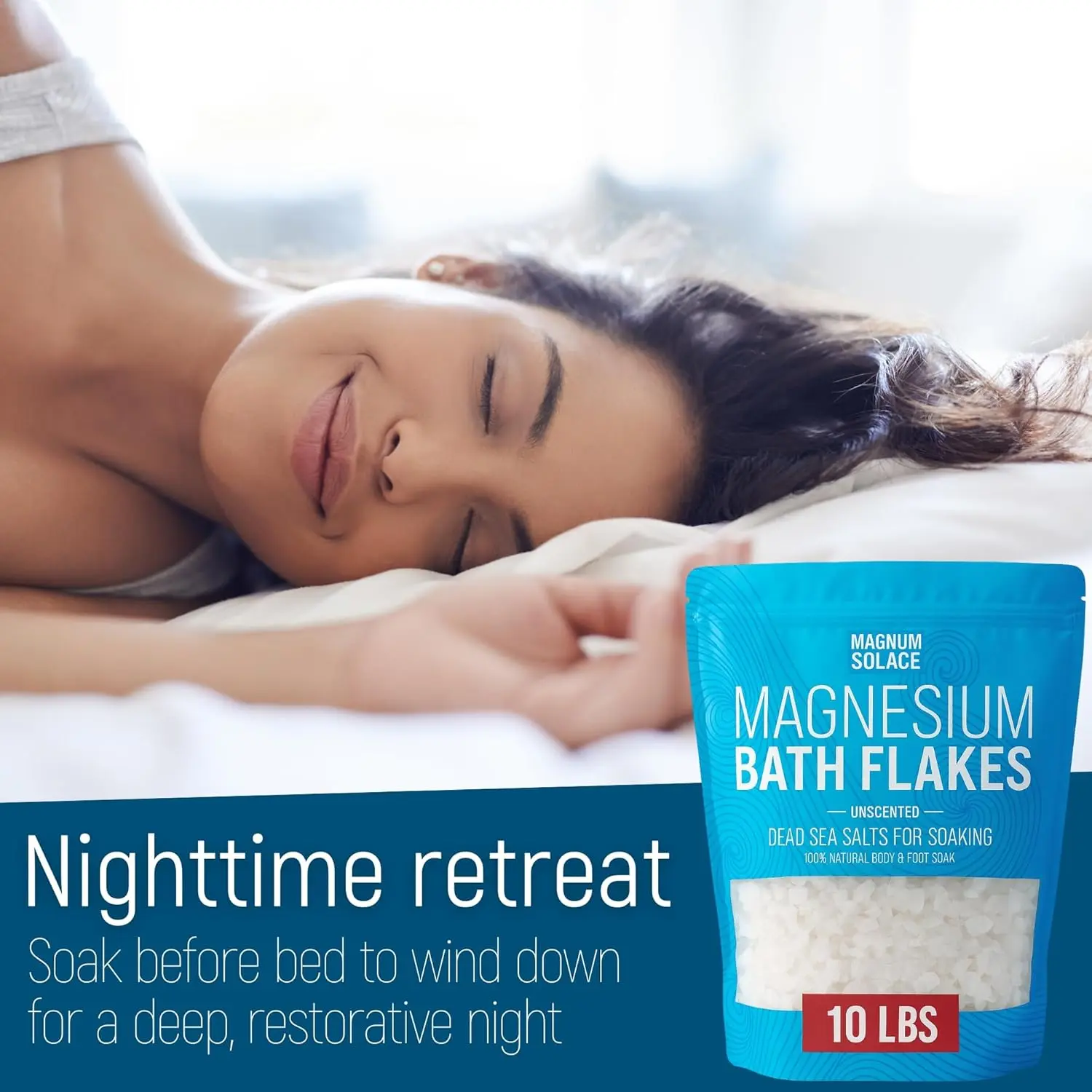 Immerse yourself in the therapeutic embrace of our Magnesium Flakes for Bath. Sourced directly from the mineral-rich Dead Sea, these pure magnesium chloride flakes offer a revitalizing and restorative experience. Unscented and completely natural, this 10-pound bag provides ample supply for countless soothing soaks. Experience the benefits of magnesium absorption through the skin, promoting relaxation, easing muscle tension, and supporting overall well-being. Our magnesium flakes dissolve quickly and completely in warm water, making them perfect for both full body baths and targeted foot soaks. Maximize your relaxation by incorporating our simple tips into your routine. We recommend soaking at nighttime, one to two times per week, to enhance sleep quality and promote a sense of calm. For optimal results, follow your bath or foot soak with Magnum Solace magnesium lotion to lock in moisture and extend the therapeutic effects. These flakes are ideal for anyone seeking a natural way to unwind, relieve sore muscles, and improve their overall health. Made with only one ingredient, you can trust the purity and quality of our Dead Sea magnesium flakes. Transform your ordinary bath into a luxurious spa experience and discover the power of magnesium for yourself! Feel the difference a truly restorative soak can make. Perfect for athletes, those with active lifestyles, or anyone seeking a little self-care.