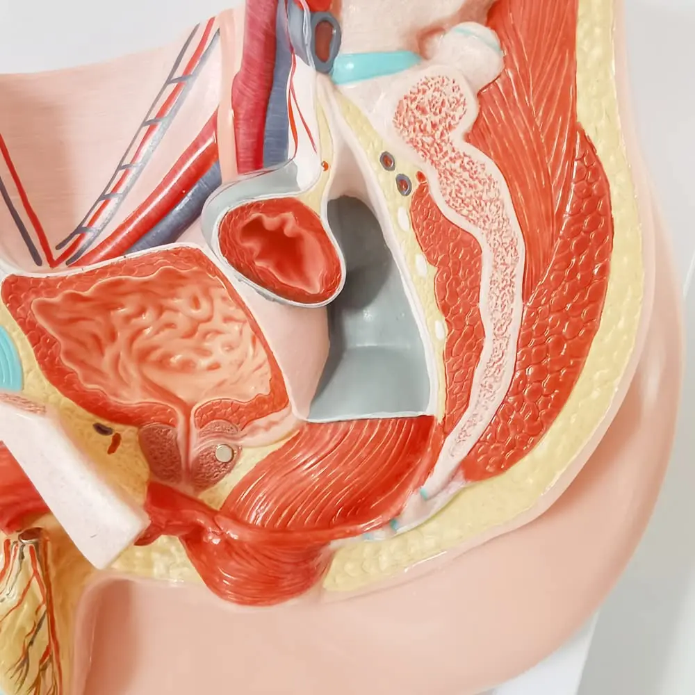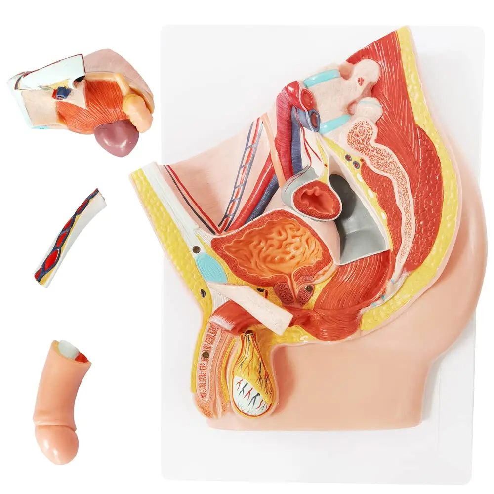 Explore the intricate details of the male anatomy with the Meriden Male Pelvis Anatomy Model. This life-size, 5-part model provides a comprehensive and anatomically accurate representation of the male pelvis, including the reproductive system, urinary system, and muscular anatomy. Painted in vivid detail, this model offers a clear and engaging way to study and understand the complex structures within the male pelvis. The removable bladder and magnetically connected parts allow for a hands-on learning experience. Designed by medical professionals with meticulous attention to detail, this high-quality model is an invaluable tool for medical students, educators, and healthcare professionals. It serves as an effective patient education tool, helping individuals understand their conditions and treatment plans with clear visual representation. The model comes with a display base and a detailed, colorful educational booklet that identifies all anatomical features. It can be easily mounted on a wall for display in classrooms or offices, making it a versatile and informative addition to any learning or professional environment. Use it as a teaching aid for classroom demonstrations or as a study tool for individual learning. This anatomically correct male pelvis model ensures a deep understanding of the complex internal structures and their interrelationships.