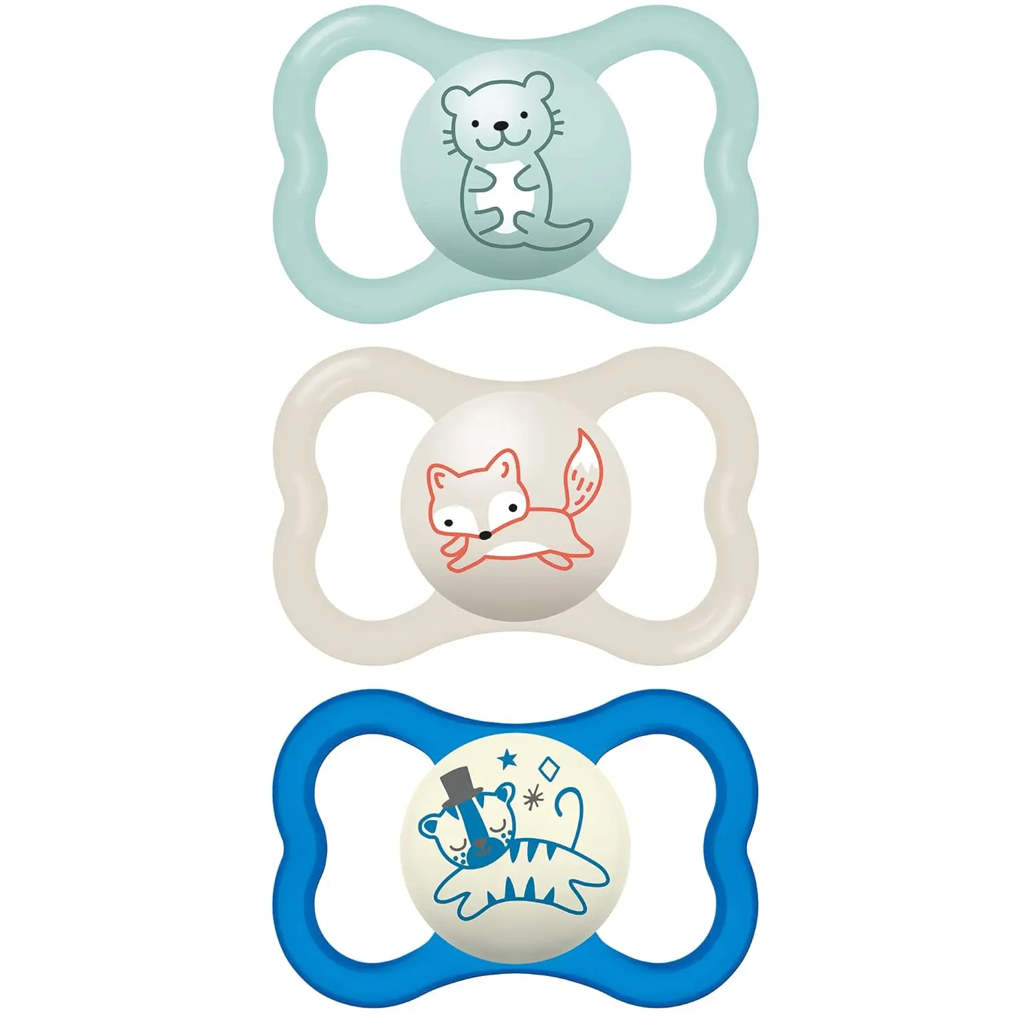 The MAM Air Night Pacifier, designed for sensitive skin & easy nighttime locating. Made for 6-16m babies, it features a glow-in-the-dark design, promoting healthy development & comfort.