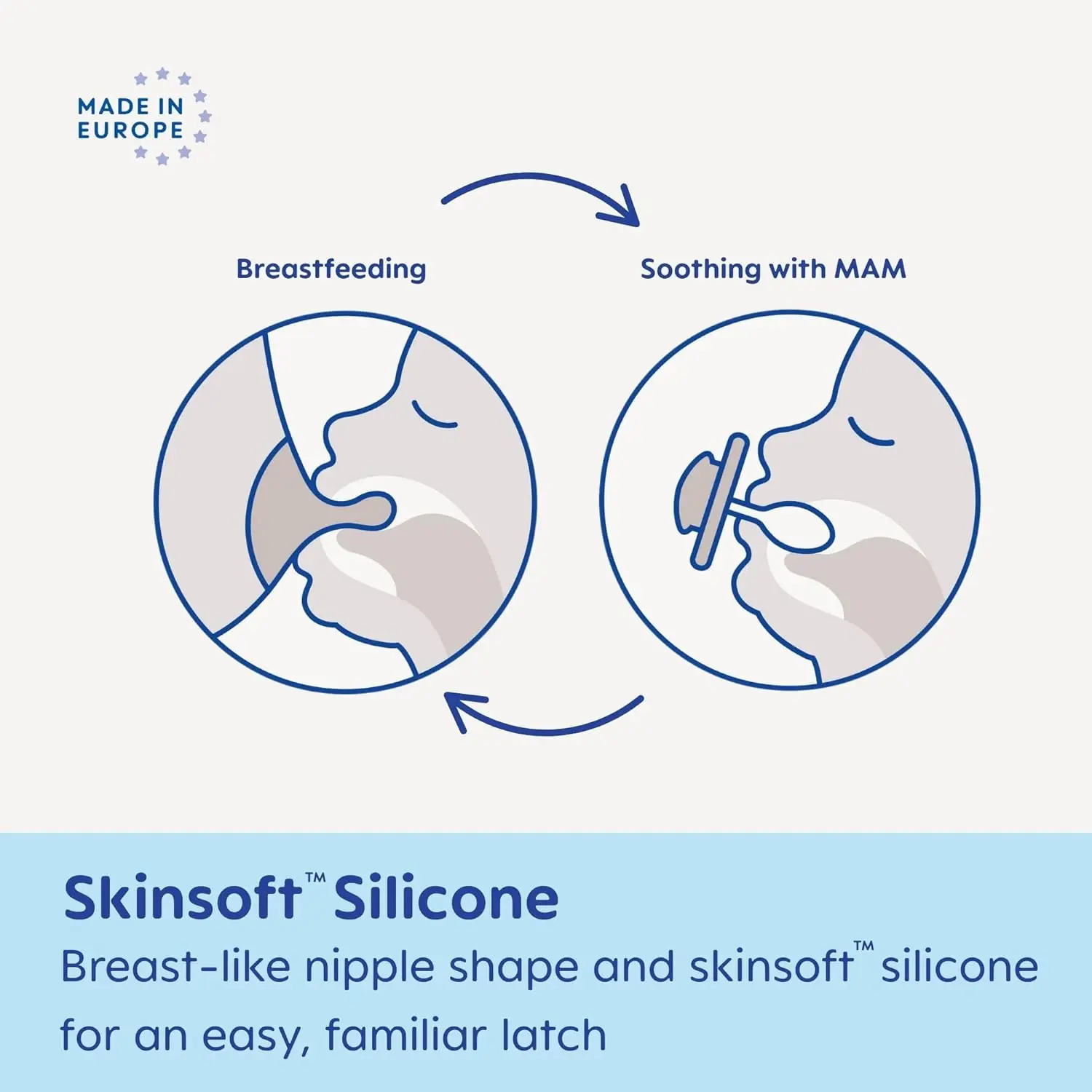 Soothe your little one with the MAM Matte Pacifier, designed for babies aged 0-6 months. This 2-pack of pacifiers combines innovative design with baby’s comfort in mind. The symmetrical shape ensures the pacifier always sits correctly in your baby’s mouth, eliminating fuss and frustration. Its design fits perfectly under the nose for easy breathing. Crafted from BPA-free and BPS-free silicone, the pacifier features MAM’s signature SkinSoft material, offering a familiar and comforting feel that babies love. The symmetrical nipple shape promotes healthy jaw and teeth development. The pacifiers come with a self-sterilizing case. Simply add water and microwave for 3 minutes to sterilize, making it convenient for both home and travel. The ventilated shield is designed with openings to prevent moisture build-up and allow the baby’s skin to breathe, ensuring optimal comfort. Available in a variety of neutral matte colors, these pacifiers are as stylish as they are functional. Meeting or exceeding US safety standards, you can trust MAM to provide safe and reliable products for your baby. These pacifiers are not only soothing but are also made with quality materials. They will help you take care of your little one. The SkinSoft material is smooth on your baby’s skin and provides a soothing sensation. This neutral color selection ensures these pacifiers will coordinate with any of your baby’s outfits. The MAM pacifiers are also a perfect baby shower gift for a mom-to-be. Each pack comes with 2 pacifiers, making it easy to have a spare on hand at home or in your diaper bag. MAM pacifiers can give parents peace of mind and give their baby the comfort they need.