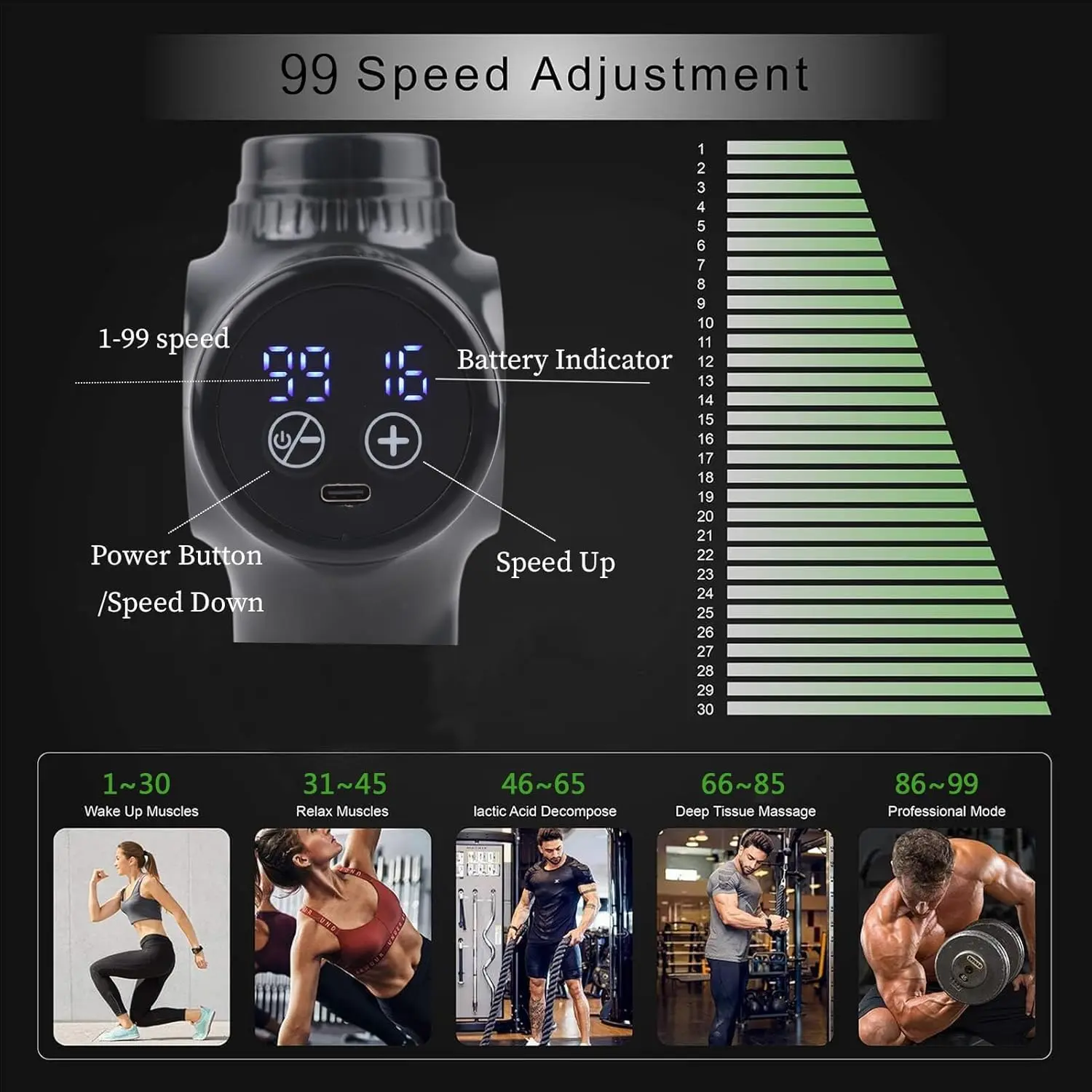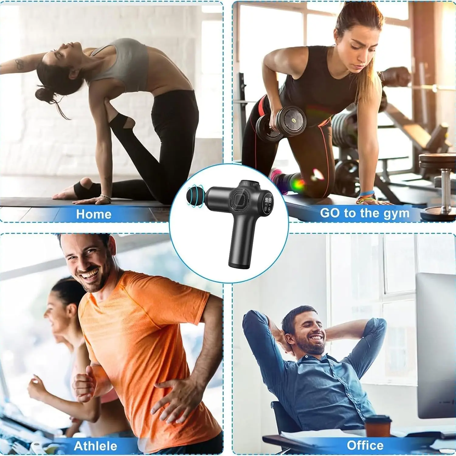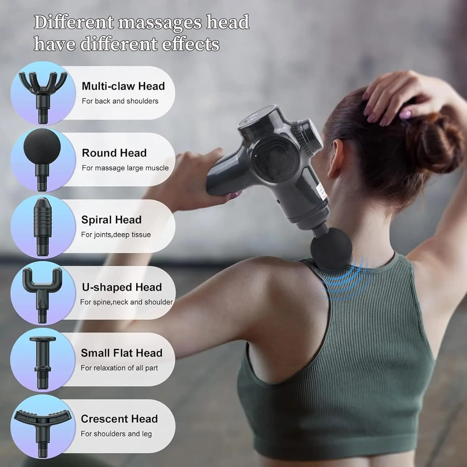 Experience deep muscle relief and enhanced recovery with our Massage Gun Deep Tissue! This powerful massager features 8 interchangeable heads and 99 adjustable speed settings to target various muscle groups with precision. Whether you’re an athlete recovering from intense training, an office worker battling chronic stiffness, or simply seeking relaxation, this massage gun provides a customized massage experience. It effectively alleviates muscle soreness and stiffness, promoting faster muscle recovery after workouts. The massage gun is engineered to reduce lactic acid build-up, encourage healthy blood flow, and improve joint flexibility. Enjoy a quiet and relaxing massage with our noise reduction technology (45dB), allowing for discreet use at home, in the office, or even at the gym. The built-in 2400mAh rechargeable battery provides up to 6 hours of continuous use. The lightweight design and included carrying case make it easy to transport your massage gun wherever you go. With its ergonomic handle, this massager is comfortable to hold and control, providing a stable grip for optimal results. It’s the perfect gift for anyone looking to improve their muscle health and well-being, offering relief from pain, tension, and fatigue. The automatic shut-off feature after 30 minutes of continuous use is a safety precaution to prevent overheating and ensure longevity. Get ready to experience the benefits of deep tissue massage in the comfort of your own home.
