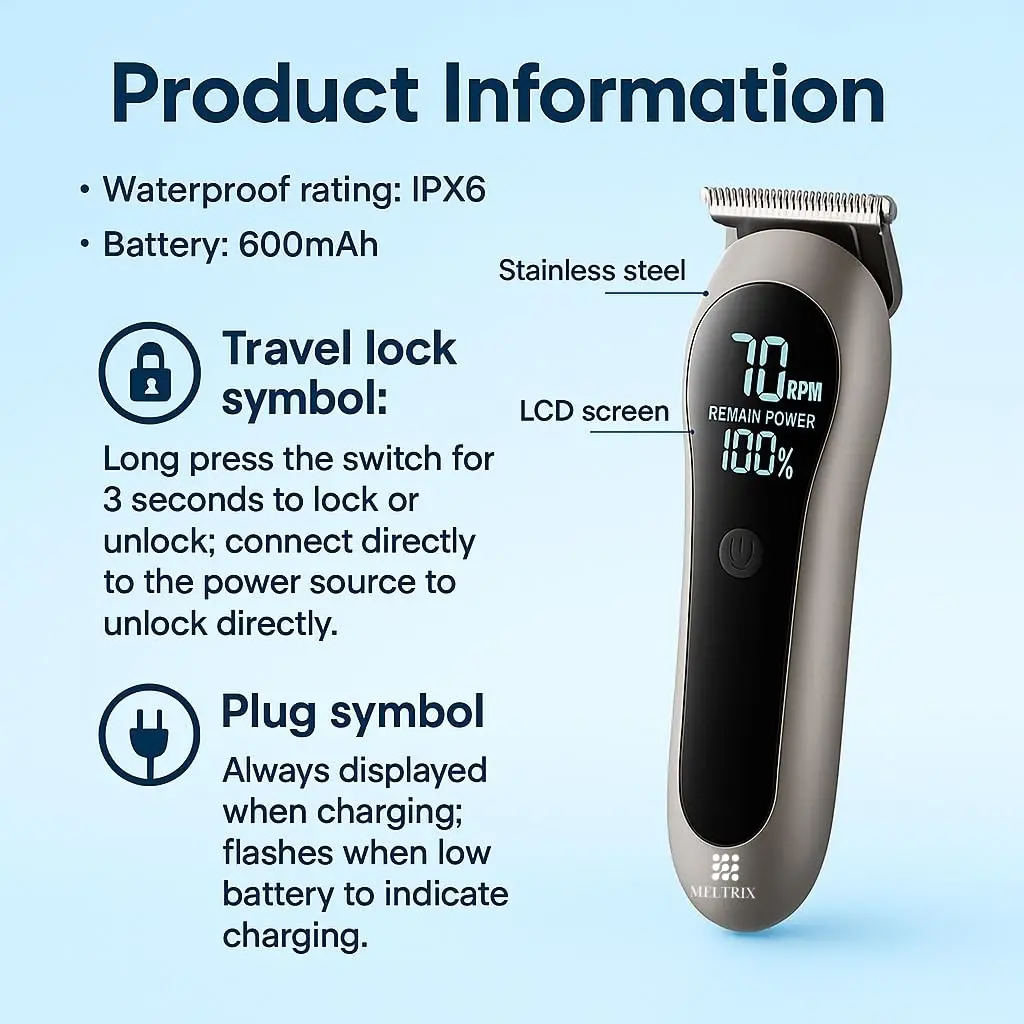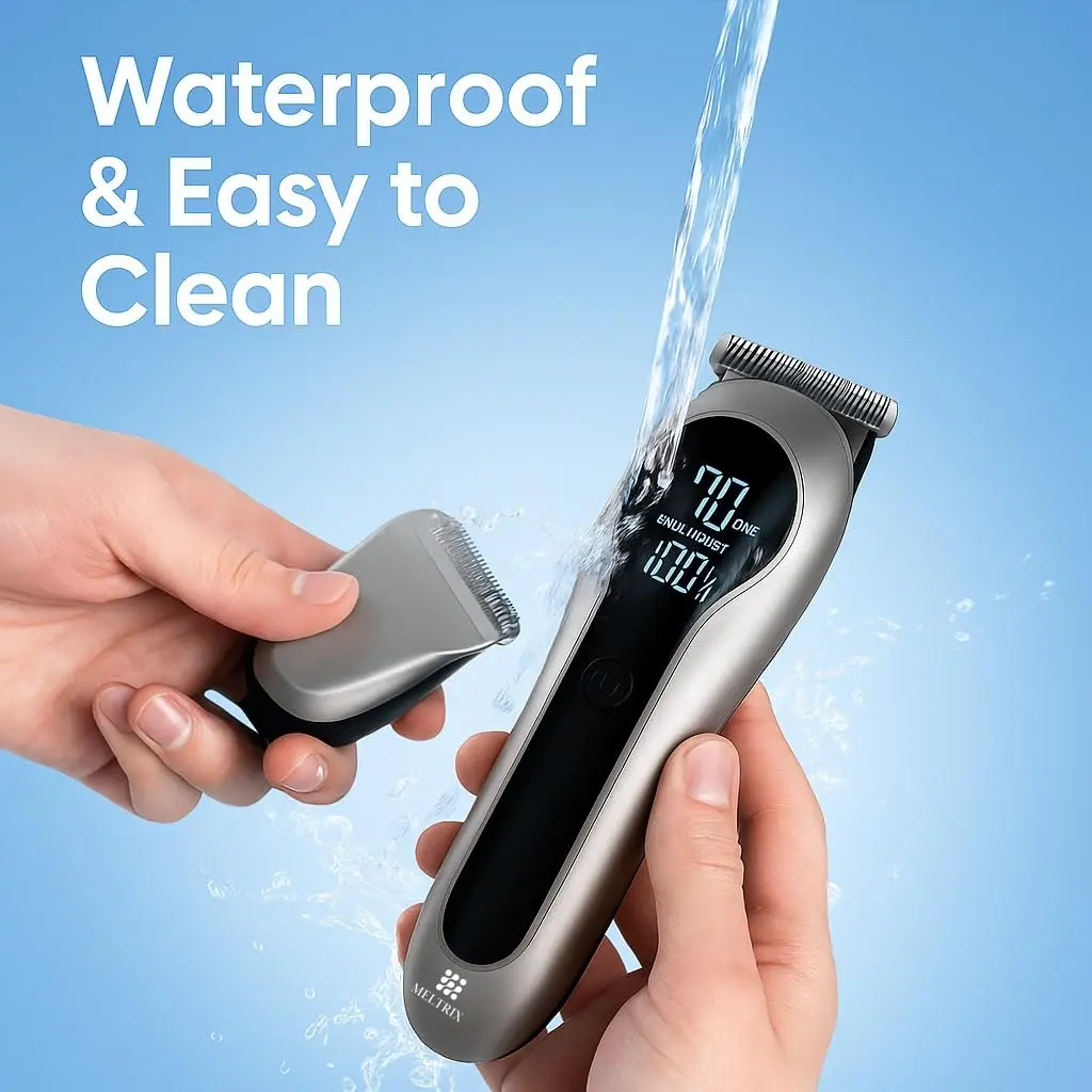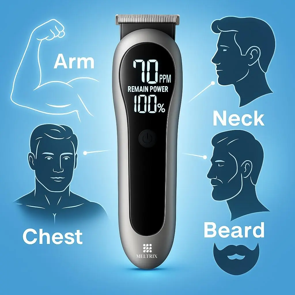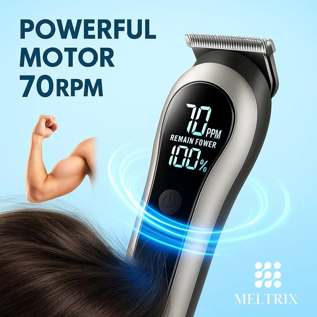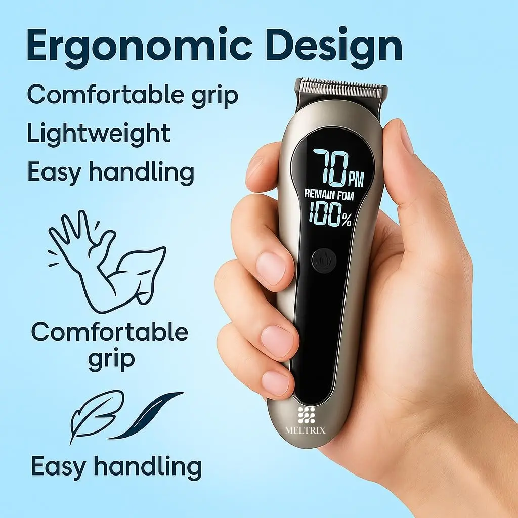 The Meltrix 14-in-1 Rechargeable Trimmer offers a complete grooming solution with multiple heads, long battery life, and a smart LCD display. Perfect for head-to-toe trimming at home or on the go.