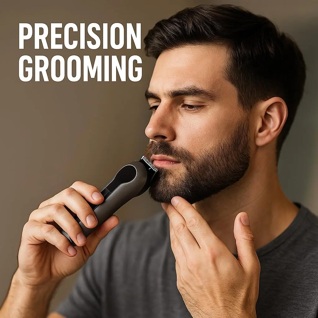 Experience the ultimate grooming versatility with the Meltrix 14-in-1 Rechargeable Body & Beard Trimmer. This comprehensive grooming kit equips you with everything you need for precise and comfortable trimming from head to toe. Unbox a full professional setup including the Meltrix T9 trimmer, featuring 5 specialized attachment heads. This includes a wide hair blade for haircuts, a beard blade for facial styling, a nose trimmer for safe grooming, and a detailing head for precision edging. A comprehensive set of guide combs for various lengths ensures you achieve your desired style with ease.