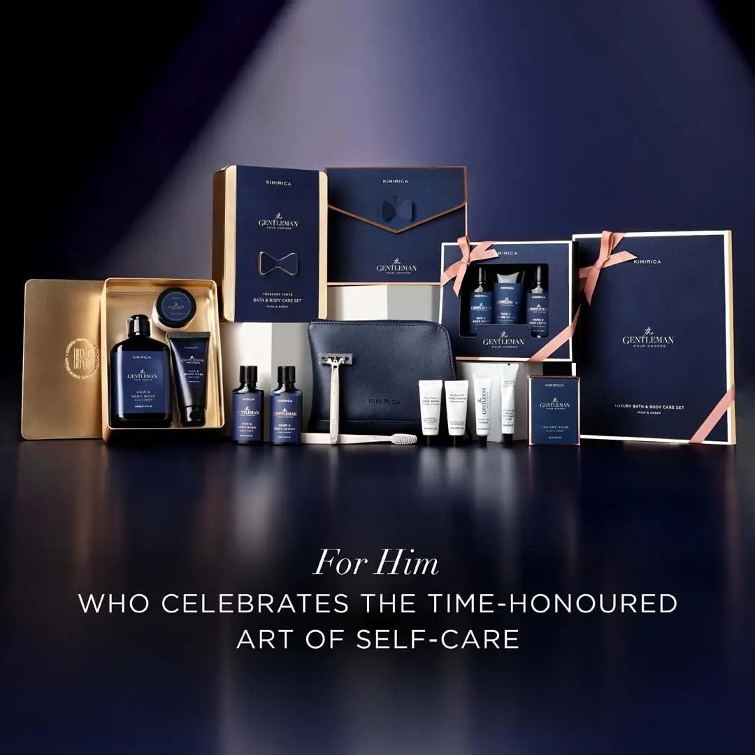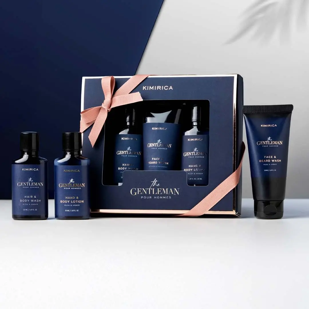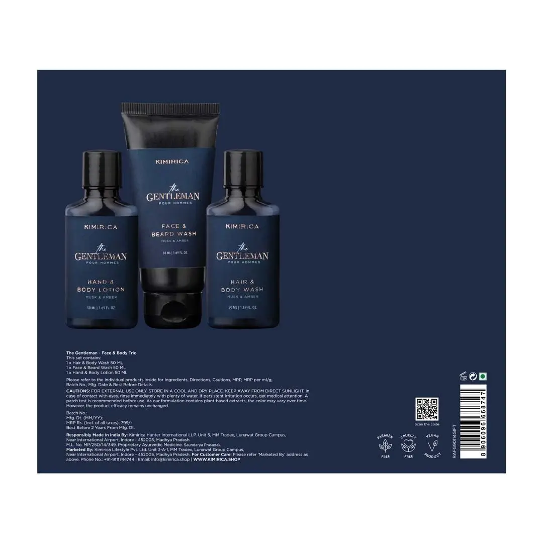Elevate your daily grooming with the Kimirica Gentlemen Trio, a collection of travel-friendly essentials designed for the modern man. This set provides a complete on-the-go grooming ritual, infused with classic notes of Musk & Amber, enriched with the soothing blend of Vetiver & Patchouli. Perfectly crafted for both your morning and evening routine, this trio will leave you feeling refreshed and confident. The Kimirica Gentlemen Trio includes a Gentlemen Hair & Body Wash (50 ml), Gentlemen Hand & Body Lotion (50 ml), and Gentlemen Face & Beard Wash (50 ml). Experience the invigorating top notes of Orange and Eucalyptus, followed by the refined middle notes of Elemi, Lavender, and Lily of Valley. Grounded by the deep and complex base notes of Musk, Incense, Patchouli, Amberwood, and Leather, this set offers a luxurious and sophisticated fragrance profile. Travel with ease and maintain your refined routine wherever you go.