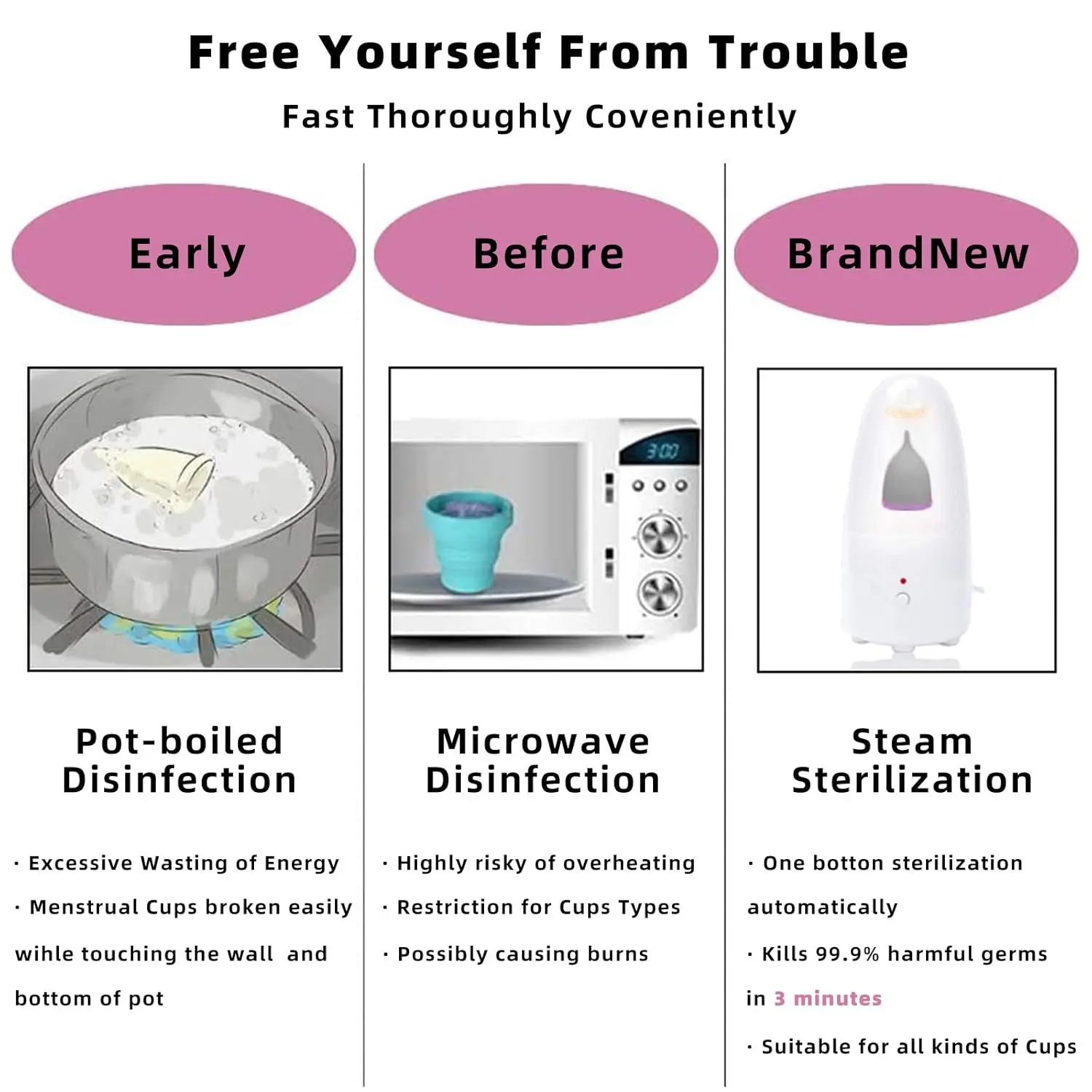 Experience ultimate period care with the Fliurich Menstrual Cup Steamer Cleaner Kit. This innovative kit provides a convenient and effective way to sterilize your menstrual cups, ensuring a clean and healthy period experience. Forget sneaking into the kitchen – sterilize your cup directly in your bathroom with our compact and easy-to-use steamer. The Fliurich Menstrual Cup Steamer utilizes steam to kill up to 99.9% of germs and bacteria in just 3 minutes, without the need for harsh chemicals. Protect yourself from menstrual odor, irritation, and dryness. Ditch tampons and pads and embrace a more comfortable and sustainable period.