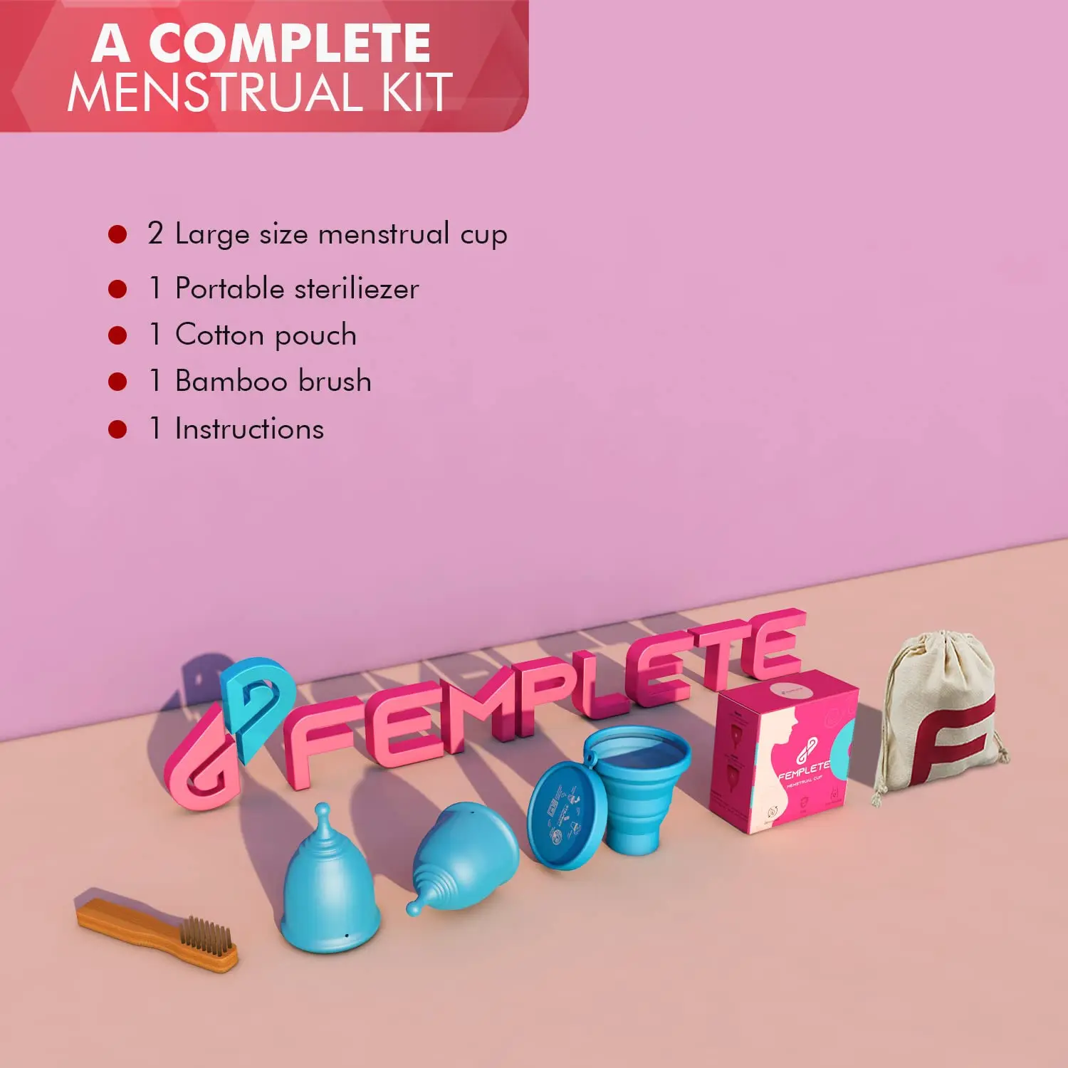 Experience comfortable, leak-free periods with Femplete Menstrual Cups. This set includes small & large cups, sterilizing cup, & brush for easy use & cleaning.