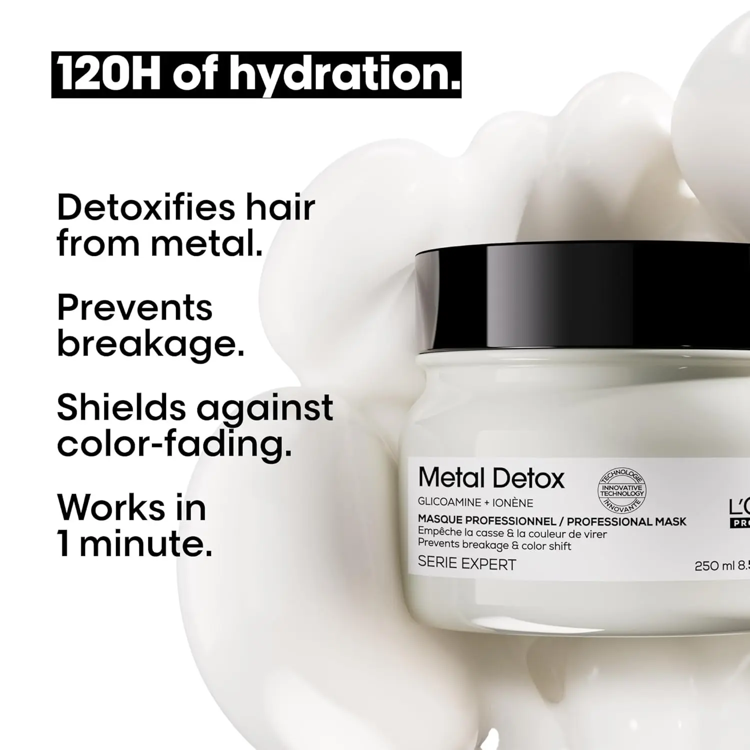 Combat hair damage caused by metals in water with the Metal Detox Mask. This revolutionary mask protects your hair from metals that lead to breakage and dull salon color. Enriched with Glicoamine, a small molecule that penetrates and neutralizes metal particles, this mask prolongs salon color vibrancy, preventing breakage and deeply moisturizing your hair for added shine. Experience 100% reliable color results, 97% less risk of breakage, and weightless nourishment when using the complete Metal Detox regimen. This mask repairs damage, leaving your hair feeling smoother, softer, and more vibrant. Unlike heavy masks, this formula provides deep nourishment and hydration without weighing your hair down. Protect your color-treated hair from harmful particles found in water. For best results, apply evenly on shampooed and towel-dried hair, leave on for just one minute, and rinse thoroughly. Unlock the full potential of your hair color by pairing with Metal Detox shampoo and conditioner. Restore your hairs vibrancy and health with the Metal Detox Mask.
