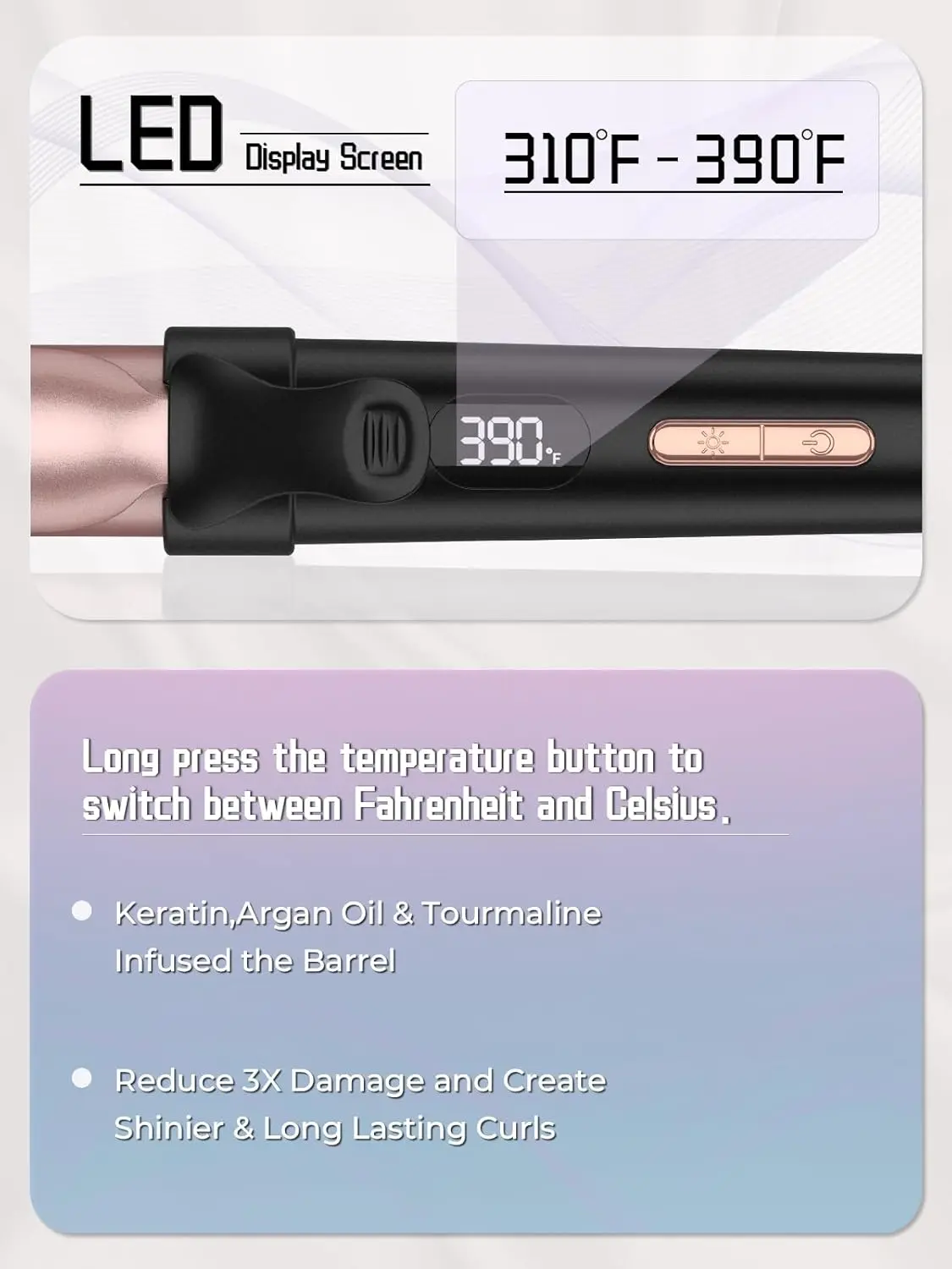 The ceramic-coated barrel minimizes frizz and static, leaving your hair soft, shiny, and healthy. The LCD display allows for precise temperature control, so you can easily monitor and adjust the heat to prevent damage. The user-friendly design includes a 360° rotating power cord for tangle-free styling, an insulated tip for added safety, and a built-in smart chip with auto shut-off for peace of mind.