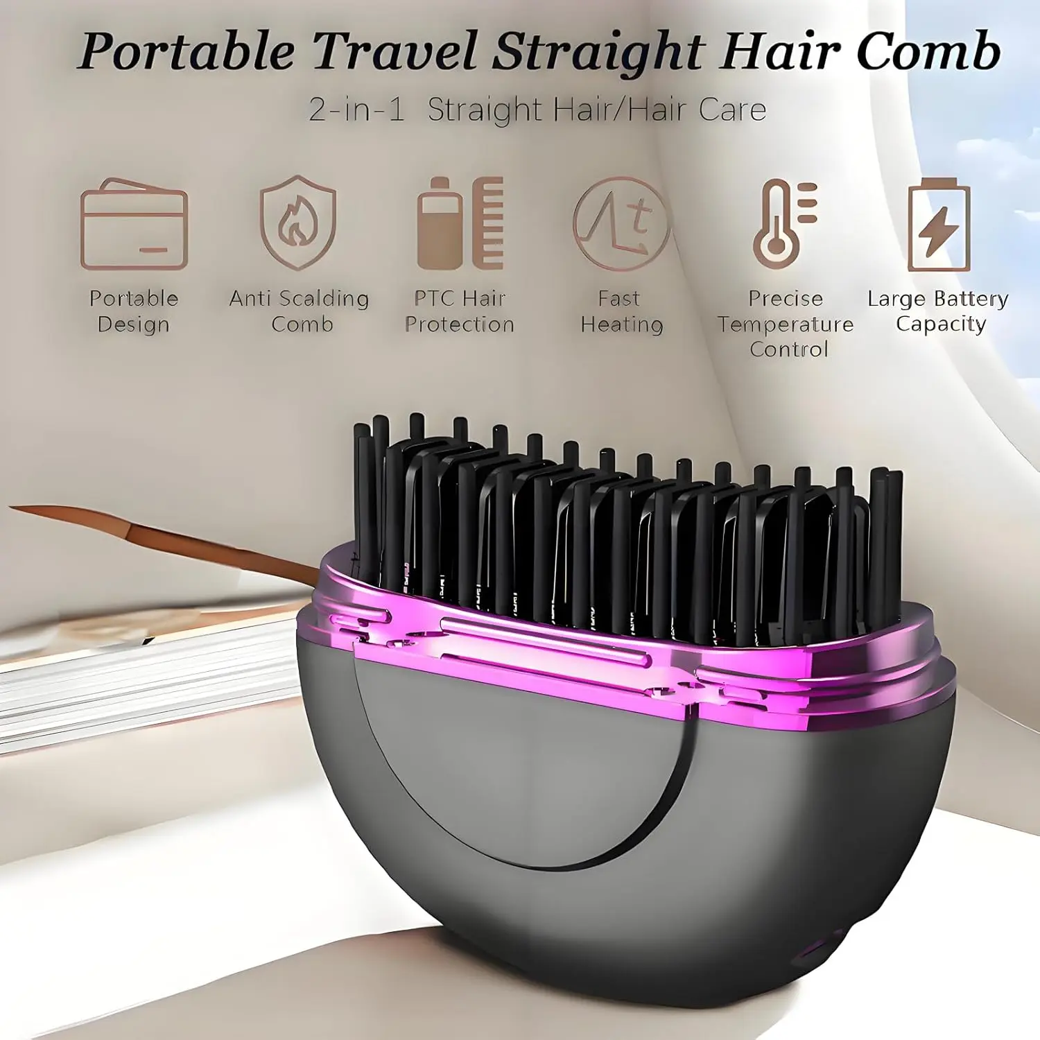Achieve salon-quality hair on the go with our Mini Hair Straightener Brush! This travel-friendly styling tool combines the convenience of a brush with the straightening power of ceramic plates and advanced ionic technology. Say goodbye to frizz and hello to smooth, sleek hair wherever you are. The compact design makes it perfect for tossing in your bag, ensuring you always have a quick and easy way to touch up your style. Whether you desire perfectly straight locks or soft, flowing waves, this versatile hair brush straightener delivers effortless results. Its user-friendly design makes it ideal for beginners, while the ergonomic handle provides a comfortable grip for effortless styling. Experience the difference of ionic technology that reduces static and creates long-lasting smoothness. The evenly heated ceramic plates glide smoothly through your hair, preventing damage and promoting a healthy shine. With this portable hair straightener, a flawless hairstyle is always within reach.