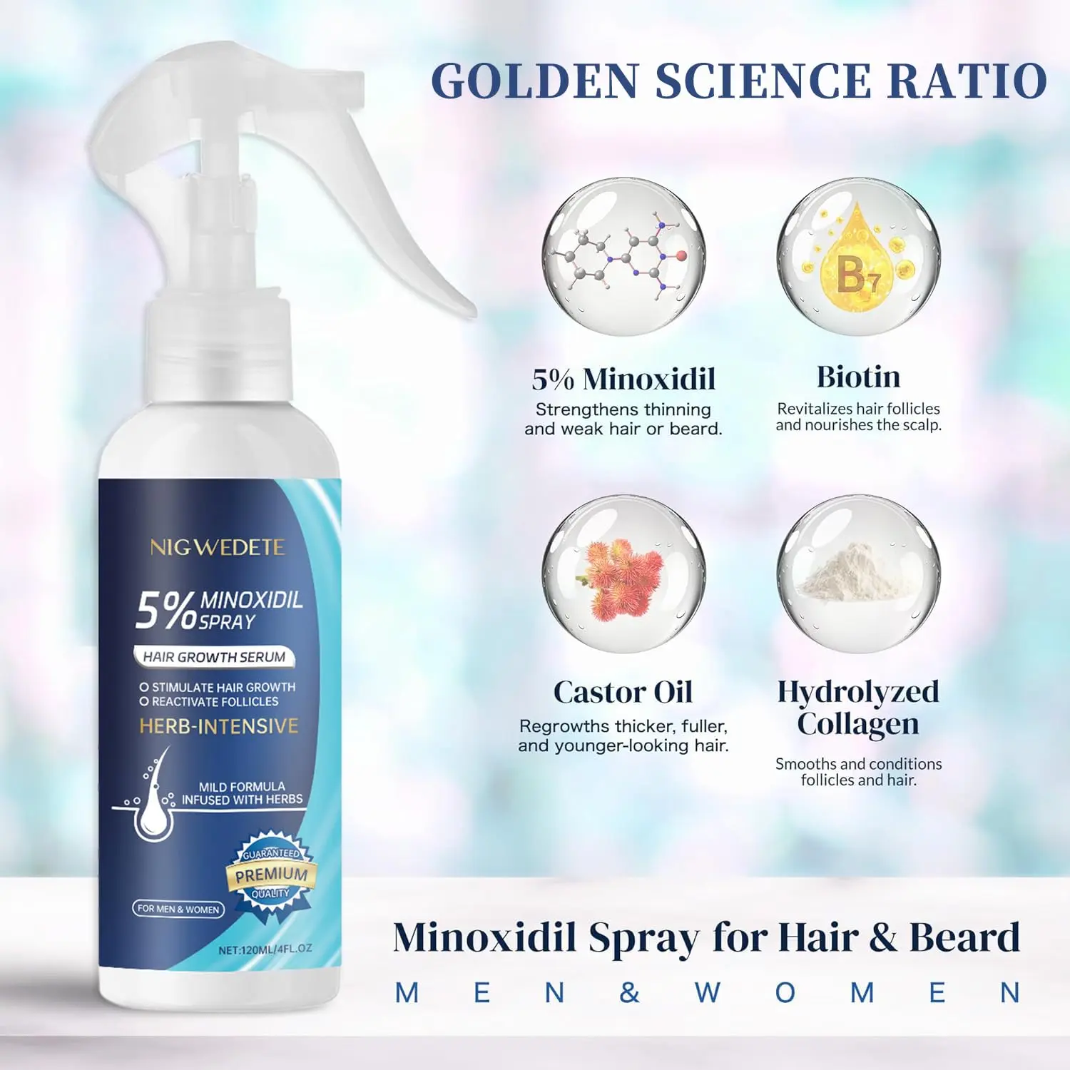 Nigwedete Minoxidil 5% Hair Growth Spray is an advanced hair growth solution designed to revitalize hair follicles and combat hair loss in both men and women. This powerful formula features 5% minoxidil, a clinically proven ingredient that stimulates hair regrowth and strengthens weak, thinning hair. Enriched with provitamin B5, this serum enhances hair growth for faster, more sustainable results.