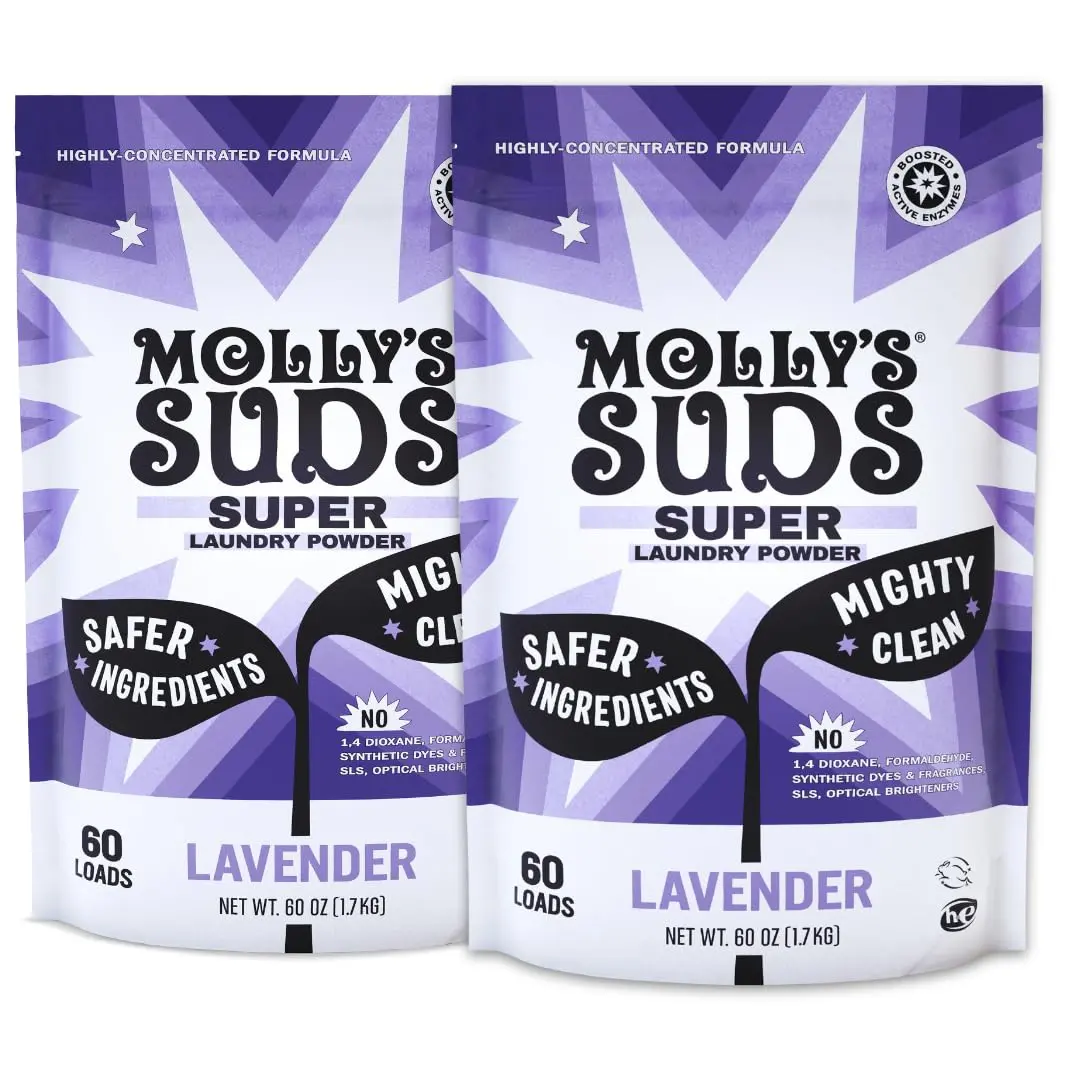 Molly’s Suds Super Powder is a natural, gentle laundry detergent perfect for sensitive skin. Includes 120 loads of lavender-scented, enzyme-powered cleaning in an extra-concentrated, septic-safe formula.