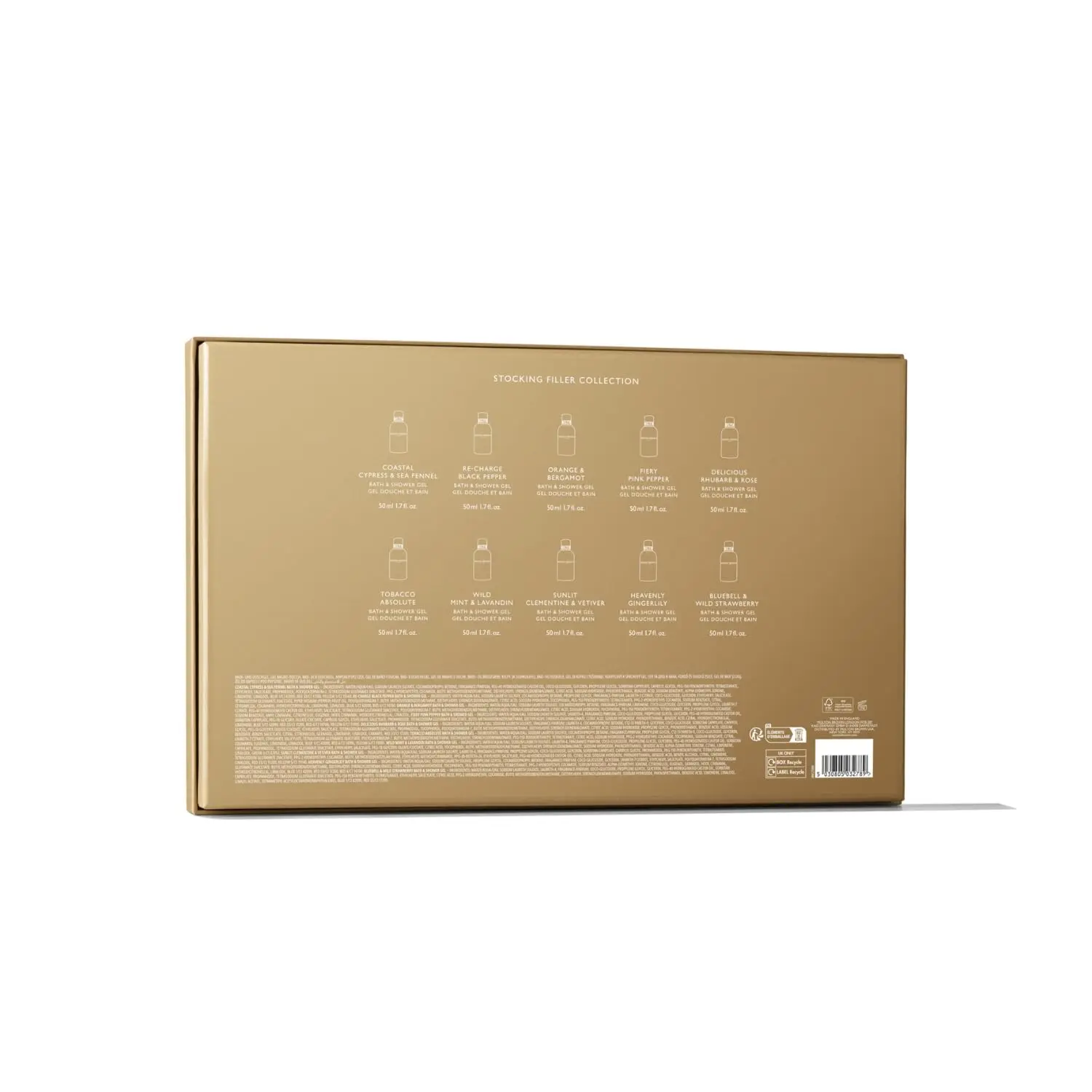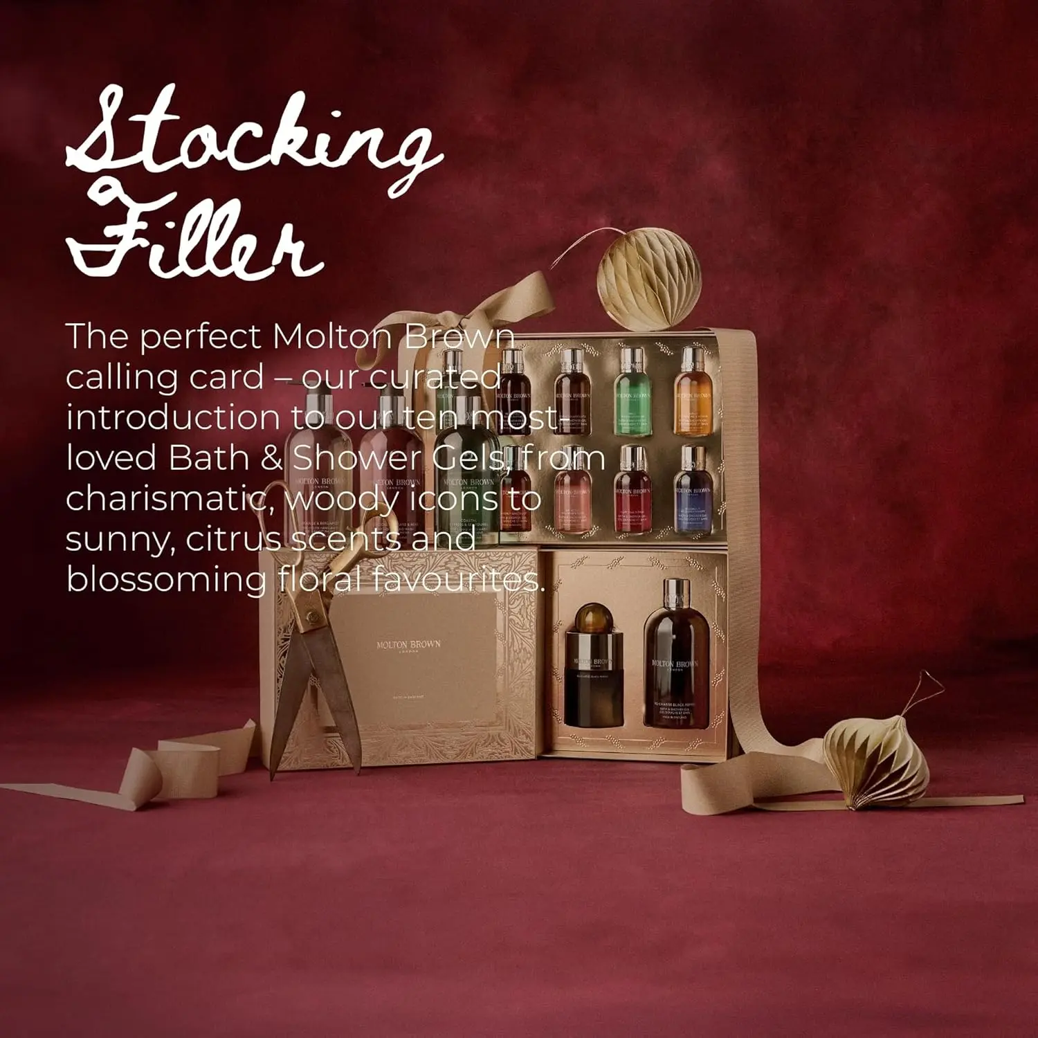 Discover the perfect introduction to Molton Brown’s exquisite world of bathing with our curated Bath & Shower Gel Stocking Filler Gift. This set showcases ten of our most beloved bath and shower gels, offering a sensory journey from charismatic, woody classics to invigorating citrus scents and delicate blooming florals. Whether you’re marking a special occasion, expressing gratitude, or simply treating yourself, this thoughtfully crafted collection is an ideal choice. Explore iconic fragrance rituals and convenient travel sizes, all presented in our opulent limited-edition packaging. Inspired by festive extravagance and the lavish interiors of iconic British art galleries, our in-house design exudes sophistication. We collaborate with expert perfumers to create long-lasting, distinctive fragrances that elevate your everyday routine. From Eau de Parfum & Toilette to Bath, Body, Hair & Hand collections, all our products are proudly made in England and are never tested on animals. Indulge in a luxurious bathing experience with our signature scents and pamper your skin with our gentle formulas. This set includes ten 50ml bath and shower gels, providing a delightful variety to suit your every mood. Experience the art of bathing with Molton Brown and transform your daily shower into a moment of pure indulgence. From refreshing citrus bursts to comforting woody notes, our diverse range of fragrances caters to every preference. Treat yourself or a loved one to the ultimate bathing experience with our meticulously crafted gift set. Molton Brown is committed to quality and sustainability, ensuring that our products are both luxurious and environmentally conscious.