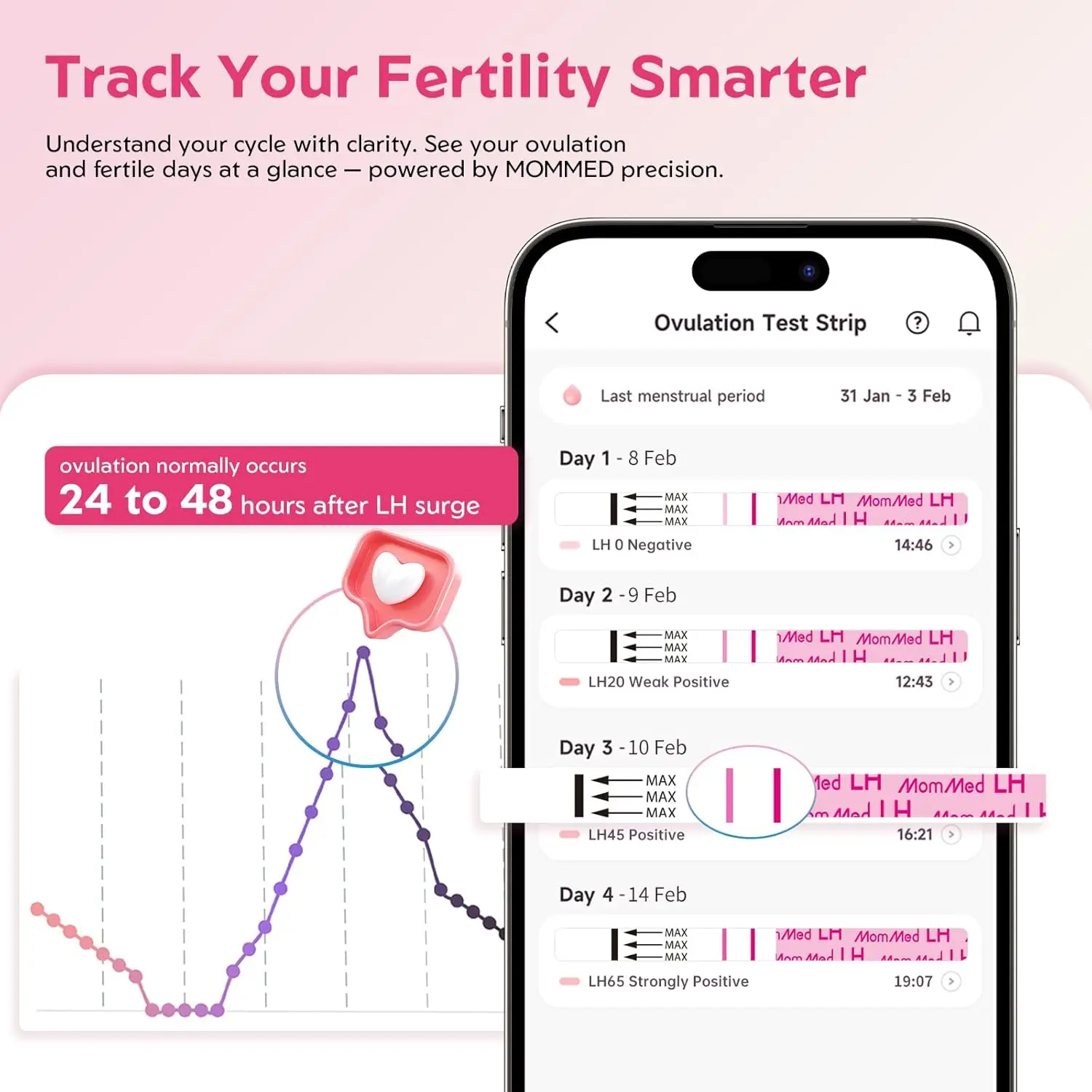 Unleash the power of accurate ovulation prediction with the MomMed 50 LH Ovulation Test Kit. Planning for a family can be an exciting yet sensitive journey, and understanding your ovulation cycle is key. Our ovulation tests offer a reliable and convenient way to pinpoint your most fertile days, empowering you to take control of your reproductive health from the comfort of your own home. With over 99% accuracy, you can trust the high-precision results to guide you in making informed decisions. Each test is safely packaged and meticulously tested for hygiene and safety, ensuring your peace of mind. The kit includes convenient collection cups, simplifying the testing process. Don’t leave your family planning to chance – choose MomMed and embark on your journey with confidence and clarity. We understand the importance of accuracy and convenience during this time, and our tests are designed to provide both. The MomMed Ovulation Test Kit is your reliable partner in family planning, offering a safe, accurate, and easy-to-use solution. Begin your journey to parenthood with the confidence that comes from knowing your body and your cycle.