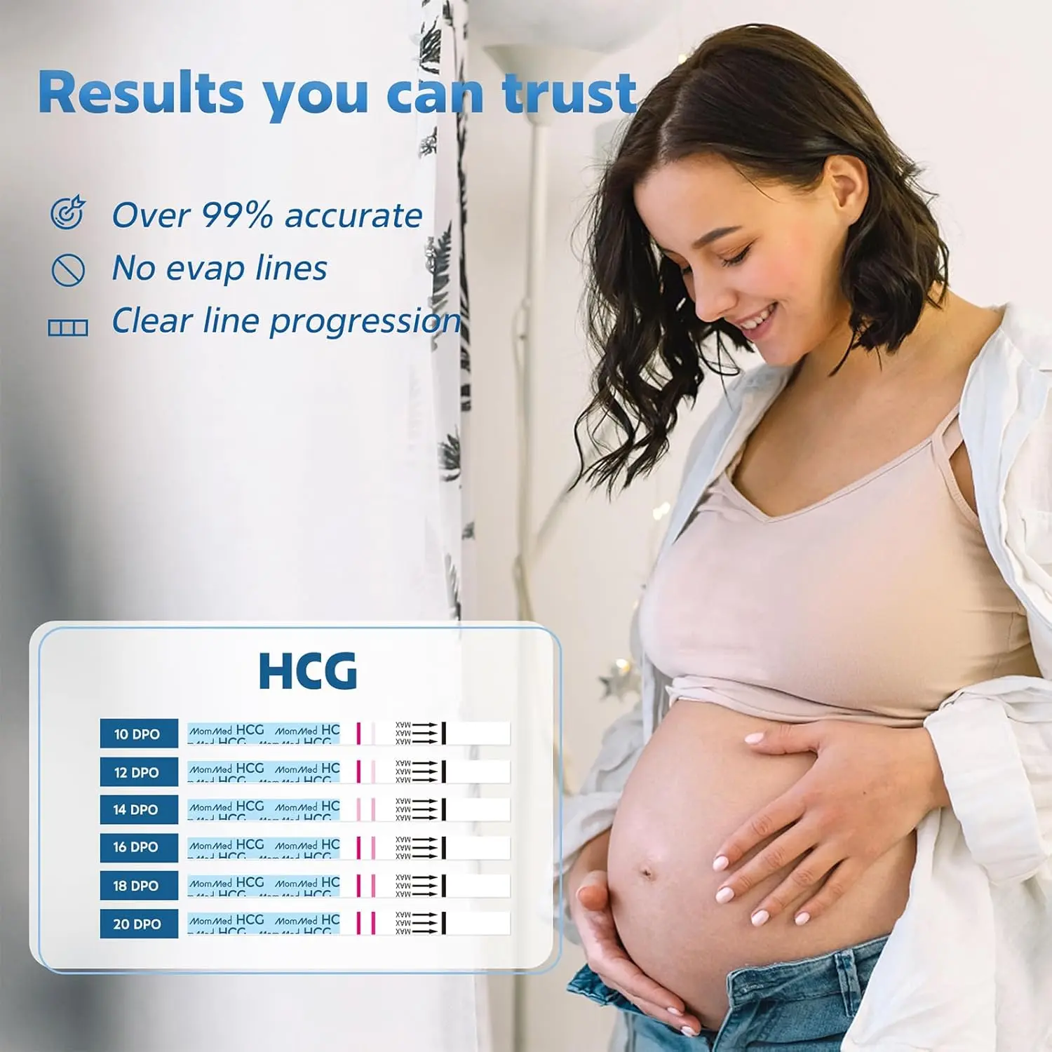 Experience unparalleled accuracy and peace of mind with MomMed Pregnancy Test Strips. Designed for clarity and reliability, our test strips boast over 99% accuracy from the day of your expected period. We understand the importance of precise results during this sensitive time, which is why MomMed utilizes medical-grade materials, ensuring consistent performance you can trust. Our standard 25mIU sensitivity is carefully calibrated to provide precise detection while minimizing the risk of false positives caused by natural hormonal fluctuations. Avoid the confusion of early, unreliable signals and gain confidence in your results. MomMed test strips deliver quick results in just 3-5 minutes, allowing you to check with confidence at any time. The easy-to-use strip design features a clear control line, guaranteeing the test is functioning correctly. Each strip is individually sealed for optimal hygiene and maintained accuracy. The compact and portable packaging seamlessly fits into your lifestyle, whether you’re at home, at work, or on the go. Join millions of women worldwide who trust MomMed for accurate and reliable results. We’re committed to supporting every woman through her unique journey with scientific quality, care, and unwavering compassion. Choose MomMed and embark on this journey with confidence. Get the reliable answer you deserve, quickly and hygienically. With MomMed, you’re not just taking a test; you’re taking a step towards informed decision-making. MomMed is more than a test; it is a trusted partner.