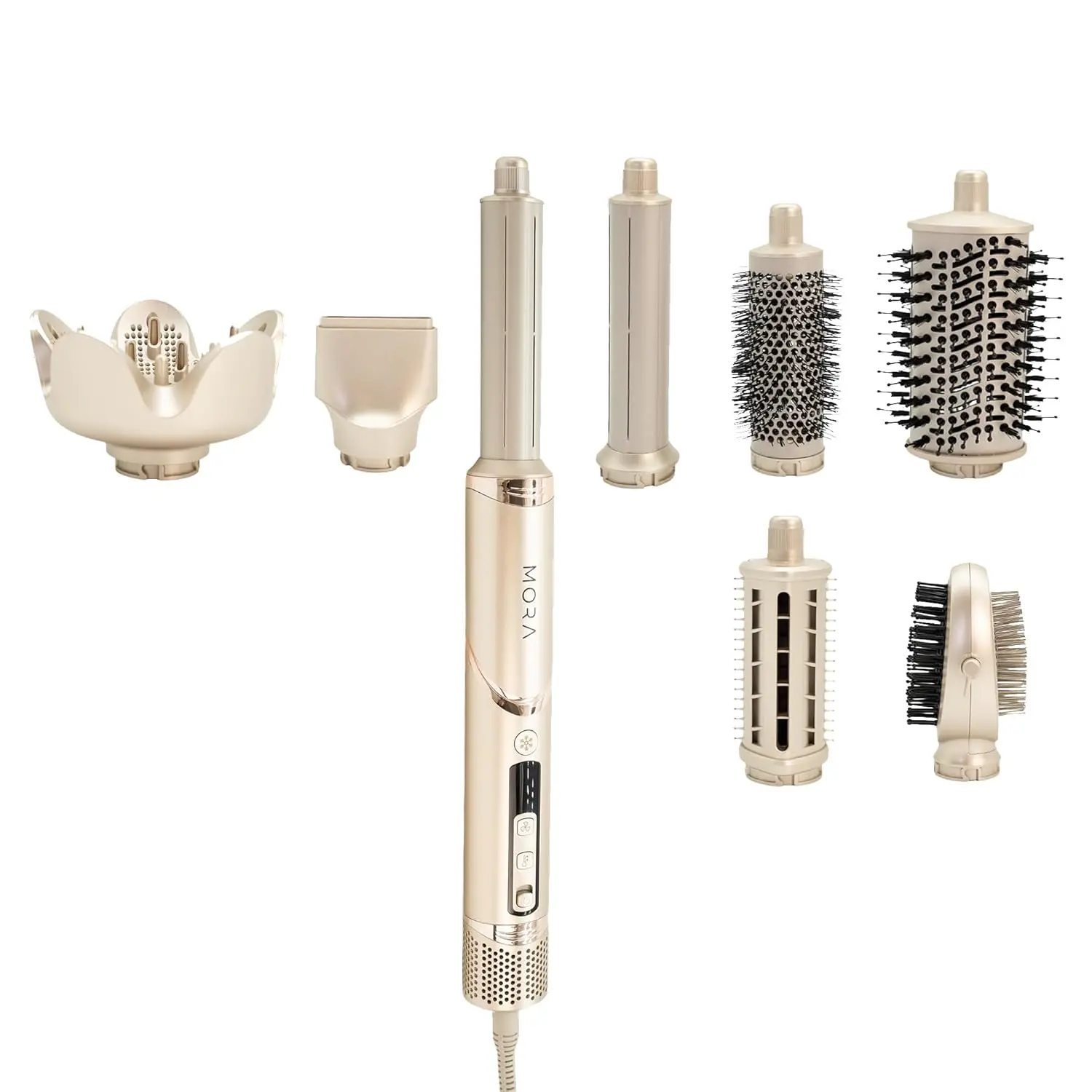 Unleash your hair’s full potential with the MORA StylerPro 8-in-1 Hair Styler & Dryer! This revolutionary tool allows you to achieve salon-quality results in the comfort of your own home, all while protecting your precious locks from heat damage. Forget complicated routines and multiple styling devices; the MORA StylerPro offers customized control with adjustable heat and power settings to perfectly suit your hair type and desired style. Experience the transformative power of ionic technology, which eliminates frizz and leaves your hair looking healthier, smoother, and radiantly shiny. Whether you have fine, thick, curly, or straight hair, the MORA StylerPro is designed to deliver exceptional results every time. With eight versatile styling attachments, the possibilities are endless. Create bouncy curls with the Airflow Curler (Left & Right), define your natural texture with the Defining Diffuser, achieve sleek and straight styles with the Coanda Smoothing Dryer, or add volume and lift with the Volumizing Brush. The included Styling Concentrator allows for precise drying and styling, while the Controllable Air Cushion Massage Comb gently detangles and massages your scalp. Say goodbye to bad hair days and hello to endless styling possibilities with the MORA StylerPro! Its intuitive design and user-friendly features make it easy to create professional-looking styles without the need for salon appointments. Embrace the freedom to experiment and discover your signature look with this all-in-one styling solution. Invest in the health and beauty of your hair with the MORA StylerPro – the ultimate tool for achieving flawless results without compromising the integrity of your strands.