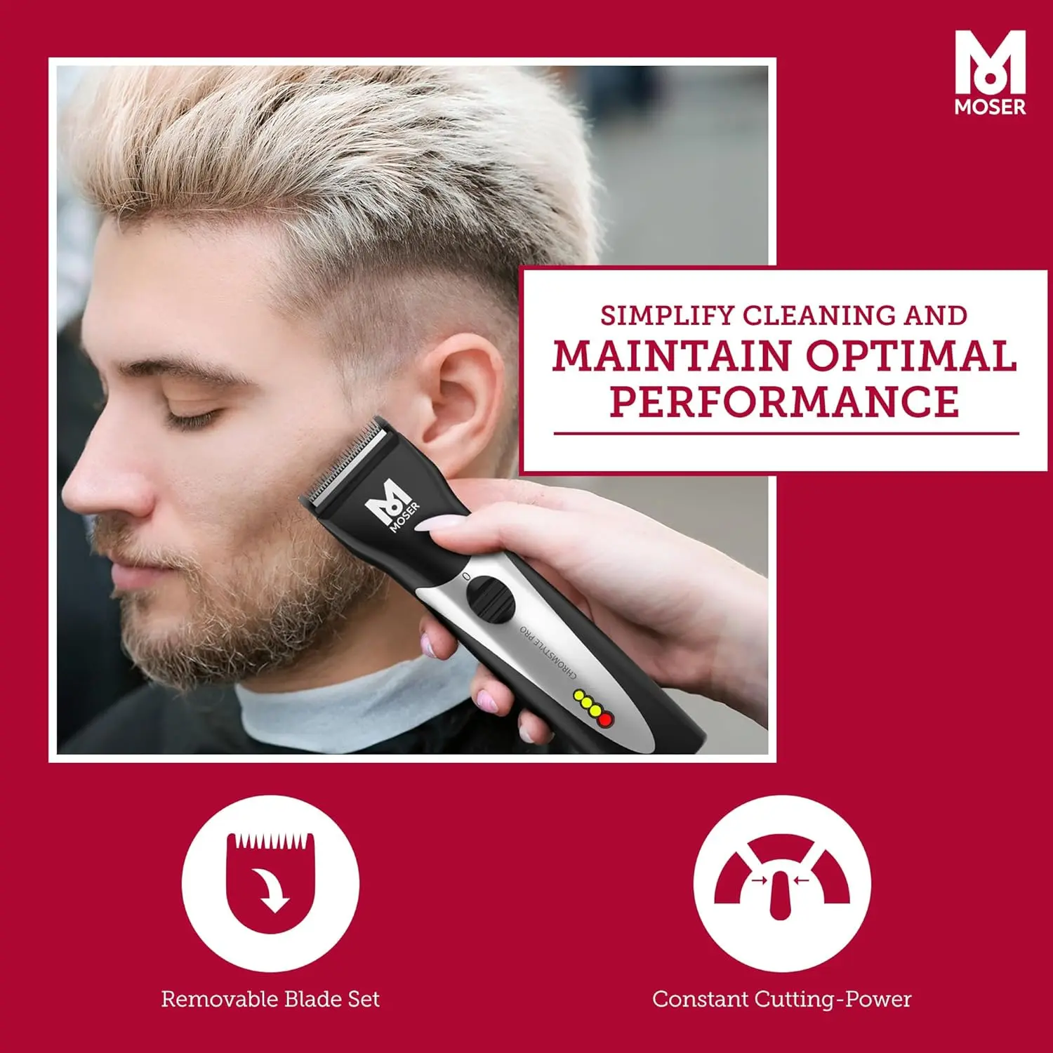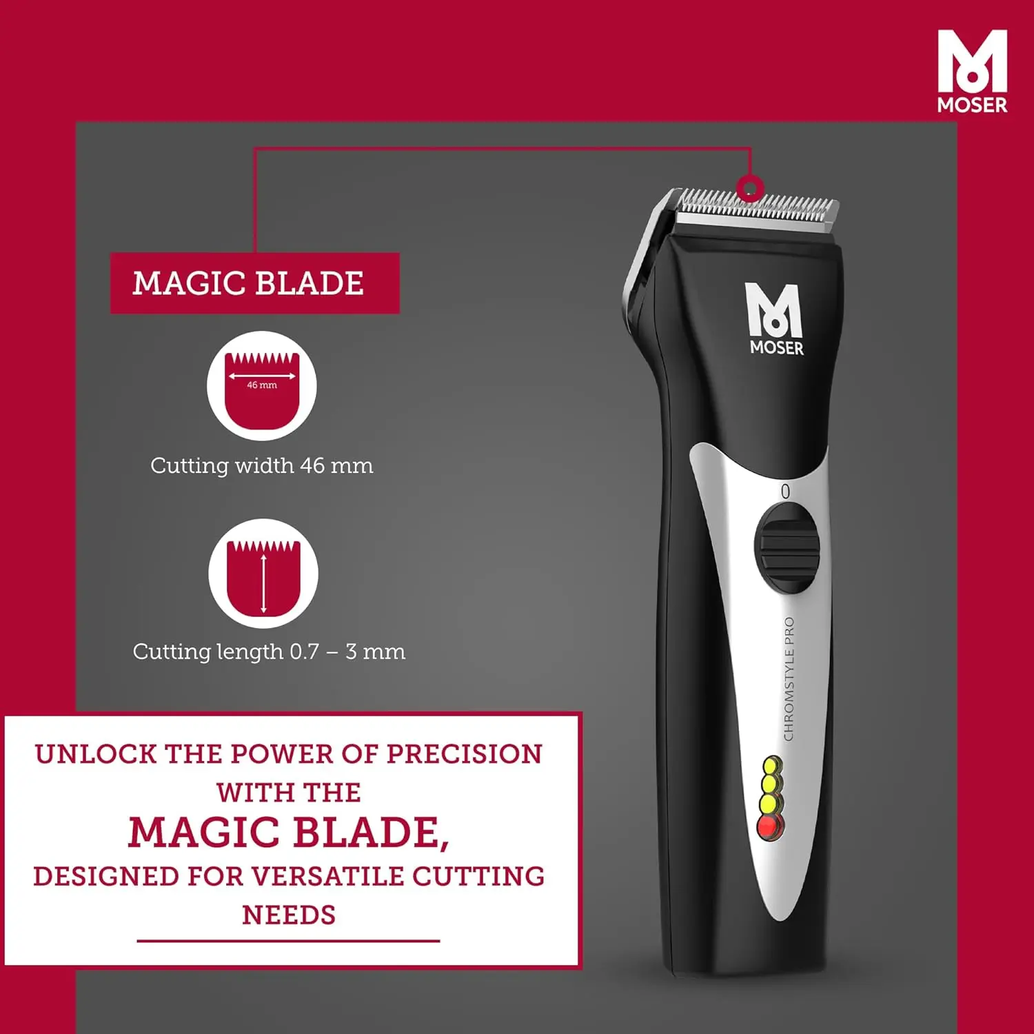 Experience the pinnacle of grooming precision with the Moser ChromStyle Pro Cordless Hair Clipper. Engineered in Germany with over 75 years of expertise, Moser is a globally renowned brand synonymous with high-quality, precision-engineered grooming tools. This clipper combines exceptional performance with unparalleled convenience, making it the perfect choice for professional stylists and home users alike. The ChromStyle Pro boasts a German-engineered, high-grade steel “Magic Blade” that delivers exceptional cutting performance. The adjustable cutting lengths (0.7–3 mm) and a cutting width of 46 mm offer versatility for various hair types and styles. Enjoy the freedom of cordless operation with up to 90 minutes of runtime on a single 60-minute quick charge. A chip-controlled DC motor ensures consistent power for smooth, effortless cutting, while noise reduction technology guarantees a quiet and comfortable experience. Safety and longevity are paramount, with an acoustic warning system preventing overload and a quick-change blade system for easy cleaning and maintenance. Stay informed with four LED indicators displaying battery-charge level and charging status. This clipper includes four slide-on attachment combs (3 mm, 6 mm, 9 mm, and 12 mm), a charging stand, charger, cleaning brush, and oil, everything you need for professional-grade grooming at your fingertips. Backed by a 1-year warranty and certified for GCC use, the Moser ChromStyle Pro ensures reliable performance and peace of mind.