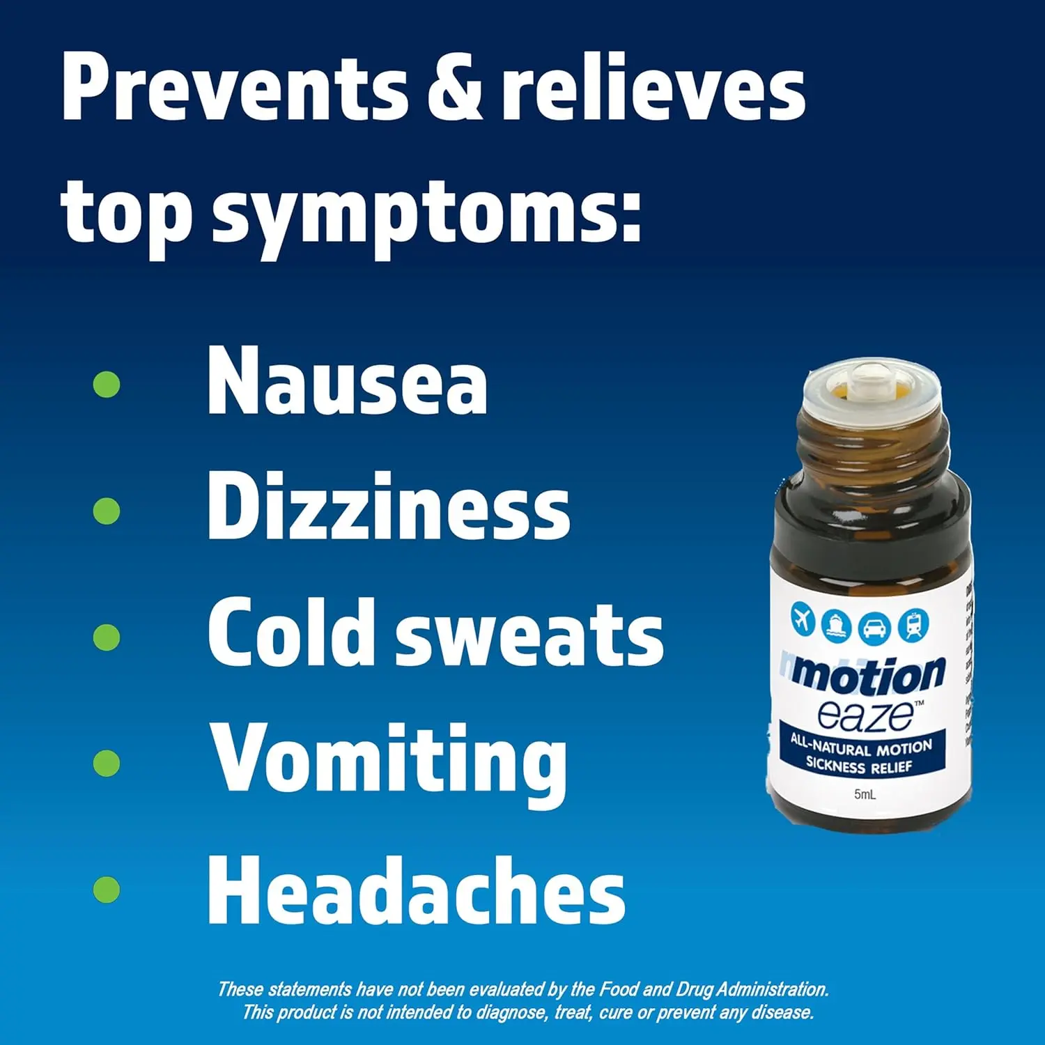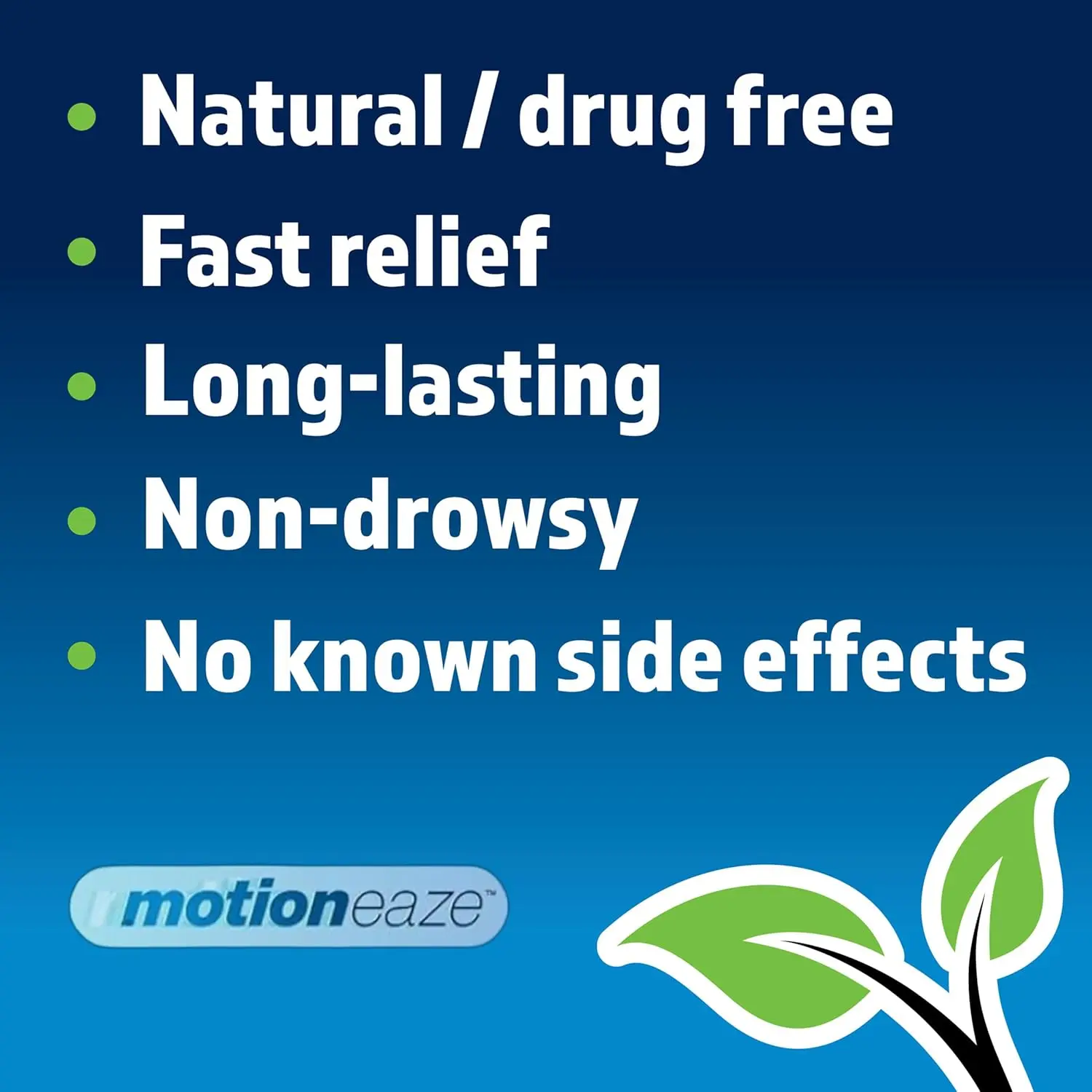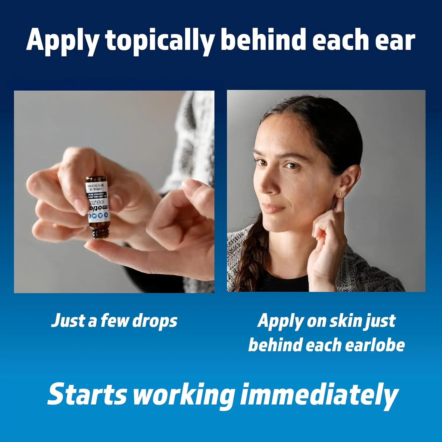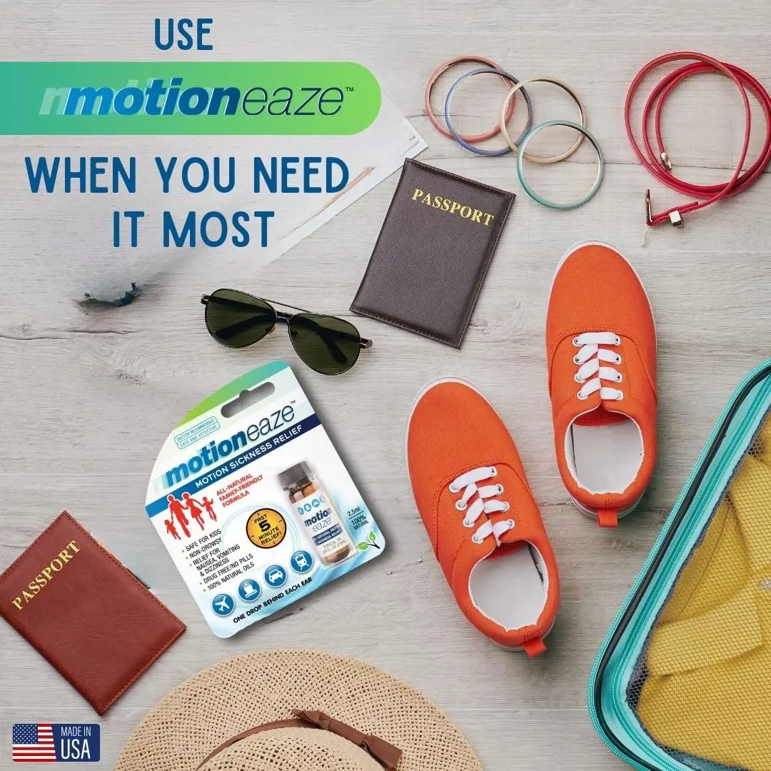 MotionEaze provides fast, all-natural relief from motion sickness. Apply behind the ear for a non-drowsy, drug-free way to feel better in minutes. Portable and easy to use!