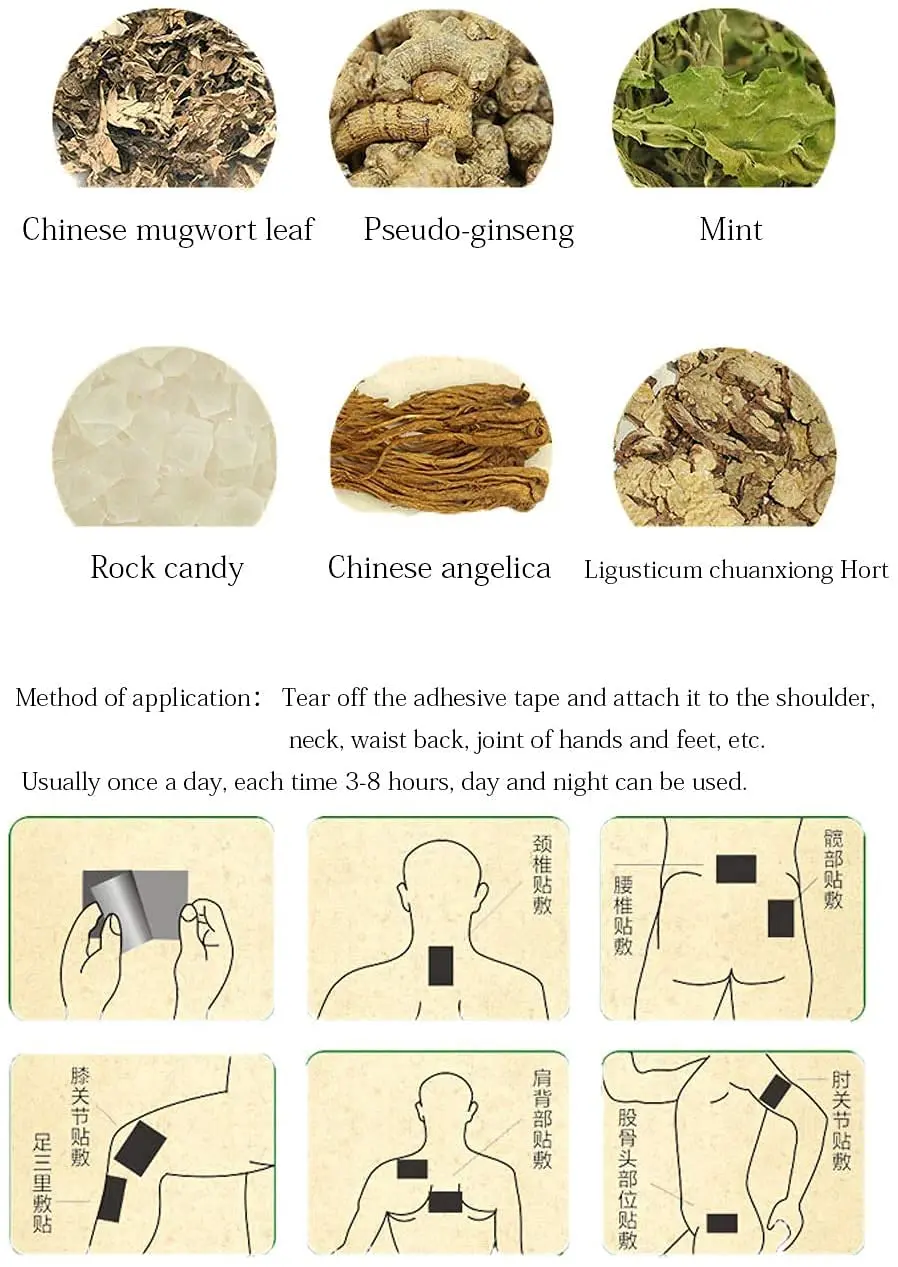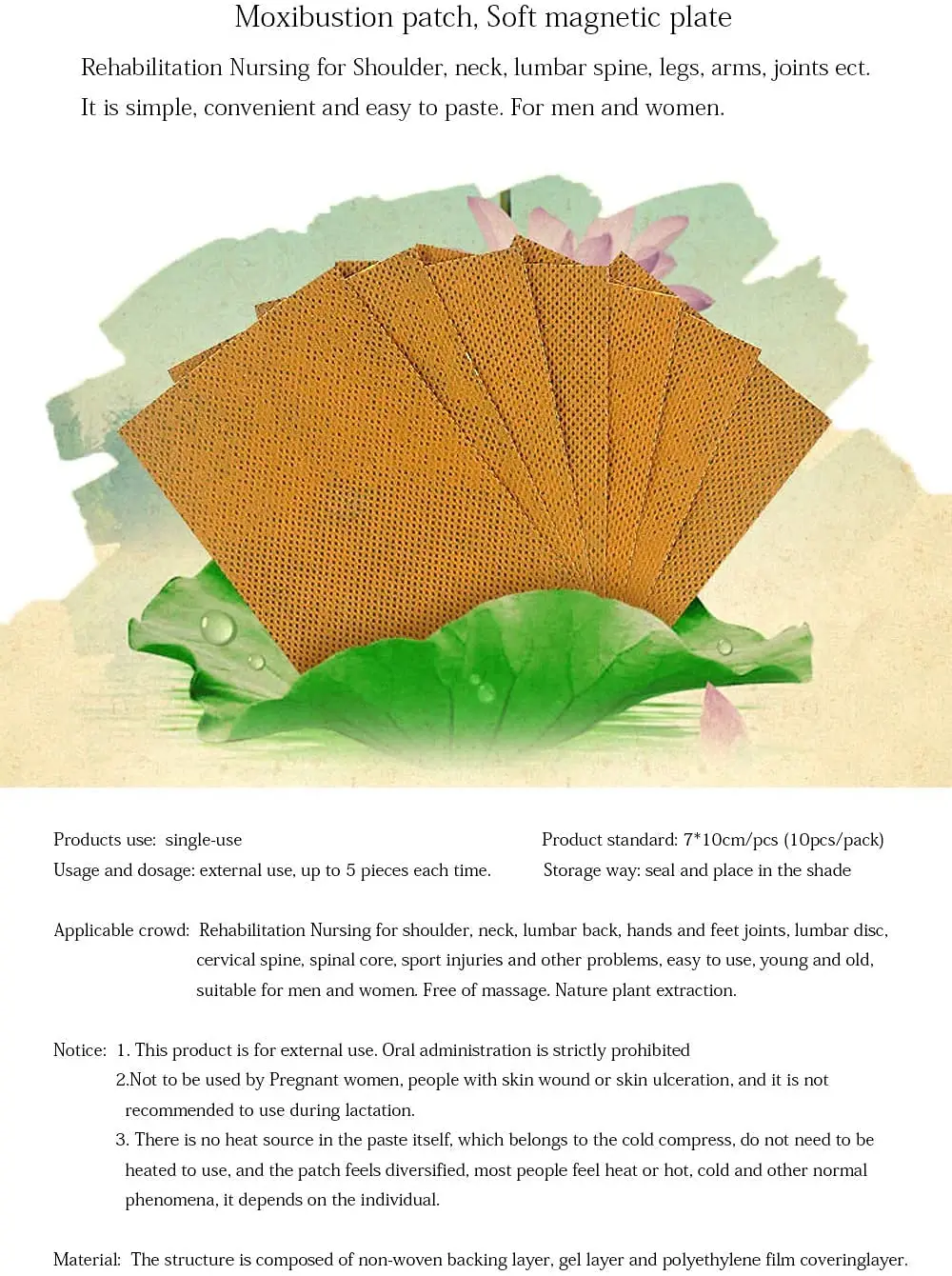Experience natural pain relief and relaxation with our Moxibustion Patch Moxa Stickers. These patches utilize pure natural plant extraction, specifically 艾叶贴 (Ai Ye Tie), to dispel discomfort and relieve fatigue. Simple, convenient, and efficient, these moxibustion patches are designed for use on your neck, shoulder, back, waist, hands, feet, and joints. Enjoy the benefits of traditional moxibustion without the smoke. Our smokeless design allows you to use them anytime, anywhere. The self-healing properties of the patch enable deep penetration into the muscle, targeting the source of your pain. The gentle heat helps to stretch soft tissues and relax muscles, promoting flexibility and decreasing stiffness. Each pack contains 60 patches, providing long-lasting relief. Remember to read the detailed instructions carefully before use. Discover the power of natural healing with these convenient and effective moxibustion patches. Whether you suffer from chronic pain, muscle stiffness, or simply need to unwind after a long day, these patches offer a soothing and therapeutic experience. Apply them easily to the affected area and let the natural ingredients work their magic. The combination of heat and plant extracts helps to stimulate blood flow, reduce inflammation, and promote overall well-being. Embrace a holistic approach to pain management and experience the difference that natural remedies can make. These patches are a perfect addition to your self-care routine, providing a quick and easy way to alleviate discomfort and promote relaxation. Don’t let pain hold you back – try our Moxibustion Patch Moxa Stickers today and rediscover the joy of movement and comfort.