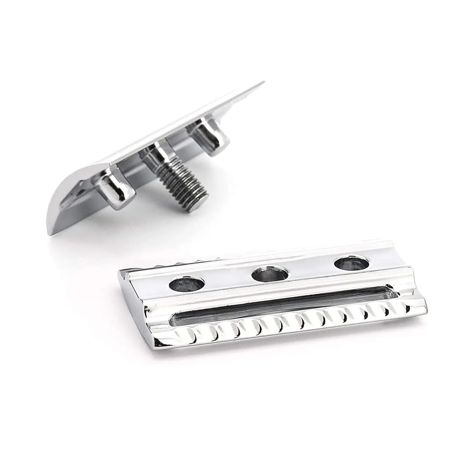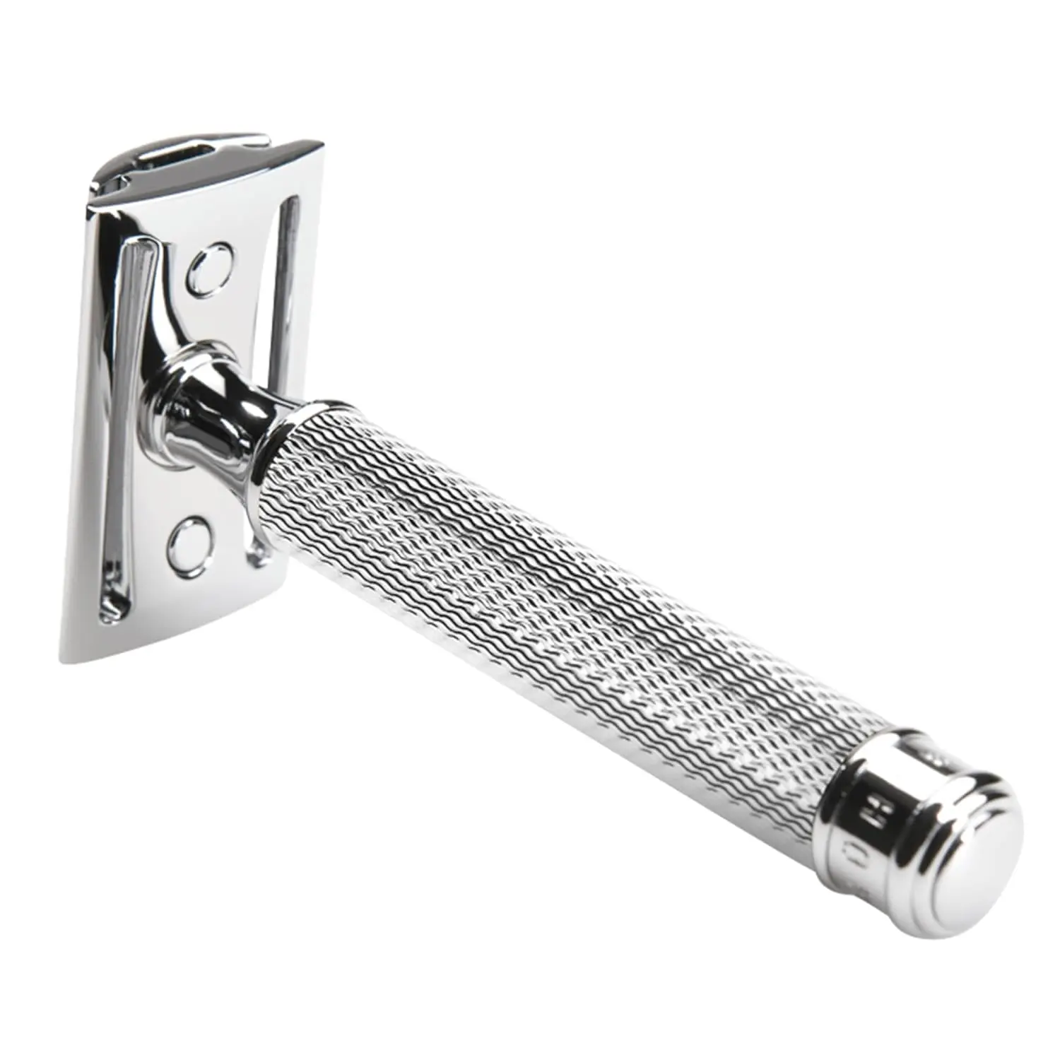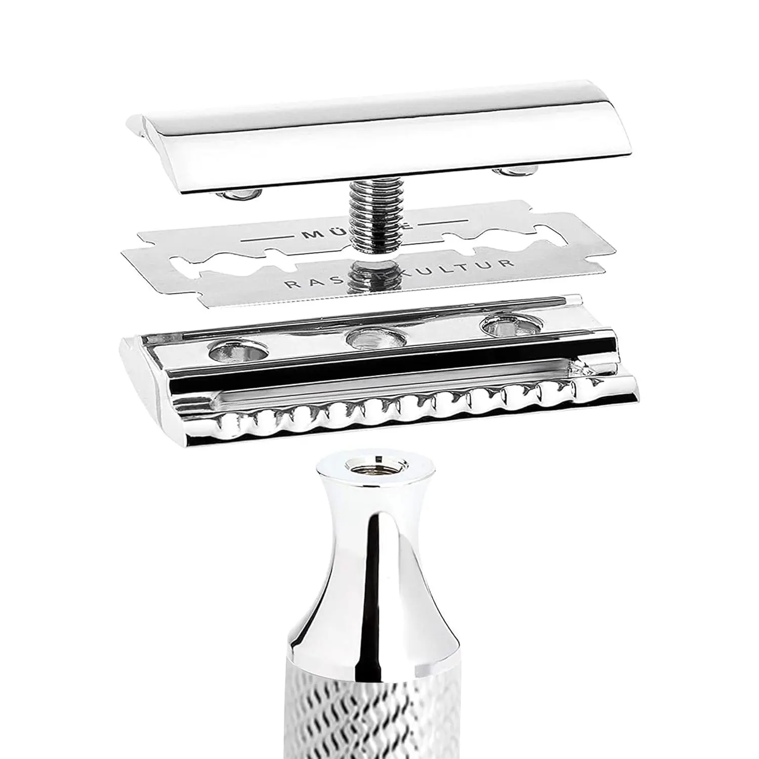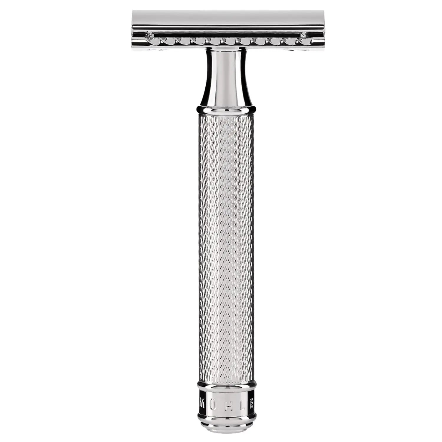 Experience the closest, most comfortable shave with the MÜHLE R89 Safety Razor. This meticulously crafted razor combines classic design with modern precision, delivering a shaving experience that is both nostalgic and incredibly effective. The R89 features a closed comb head, a time-tested design known for its gentleness and ability to prevent build-up, ensuring a smooth glide and minimizing irritation. The specially designed blade angle optimizes cutting performance for a remarkably close shave. Choose from a range of stylish handle options, including classic chrome, luxurious rose-gold metal, sophisticated faux tortoiseshell, and sleek black chrome, to personalize your grooming routine. MÜHLE is committed to sustainability, using no plastic in our products and partnering with suppliers who share our dedication to environmental responsibility. Rediscover the art of traditional wet shaving with the MÜHLE R89 and enjoy a superior shave that’s kind to your skin and the planet. Remember to keep your skin taut and let the weight of the razor do the work, shaving with the grain for the best results. Our commitment to quality and sustainability ensures that every MÜHLE product, from handcrafted masterpieces to serially produced goods, reflects our passion for excellence and our respect for the environment.