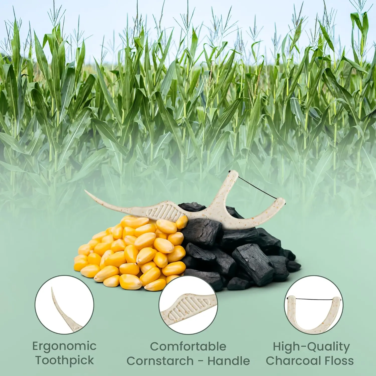 Experience a superior and eco-conscious teeth cleaning with Beautiful Mind Natural Dental Floss Picks. These plant-based floss picks ensure no accidental ingestion of microplastics. The strong, shred-resistant floss, made from bamboo ashes, effectively removes food particles from hard-to-reach areas. The pointy tip acts as a toothpick for thorough cleaning. Durable and designed for maintaining healthy teeth, these natural floss sticks are perfect for daily use. Handles are made from corn starch that fully biodegrades. Ideal for eco-conscious individuals and suitable for both kids and adults, these vegan dental floss picks are a sustainable choice. Each pack contains 75 individual flossers in an eco-friendly kraft paper box. Made from premium quality organic materials, these floss picks offer a 100% risk-free customer satisfaction guarantee. Contribute to the sustainability movement by choosing these environmentally friendly floss sticks.