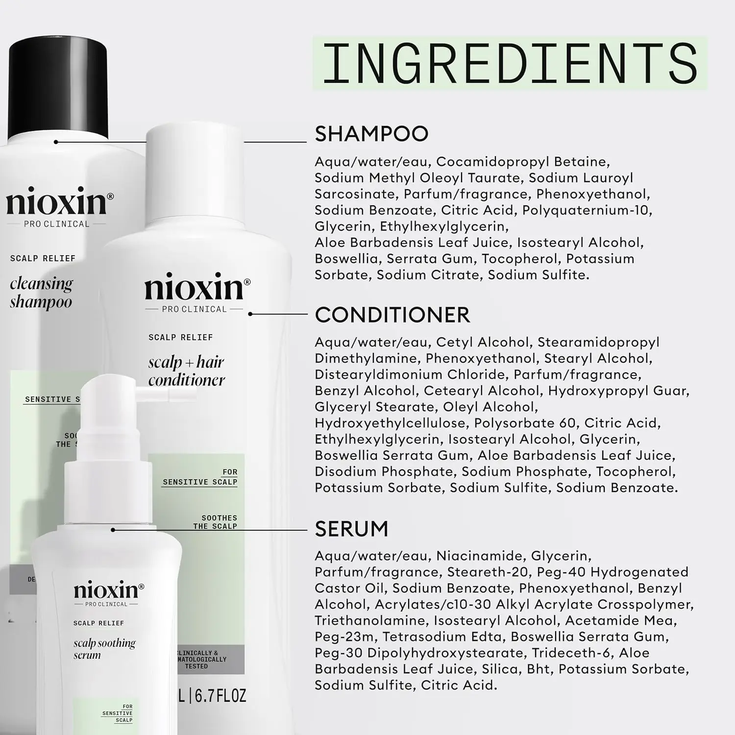 Suffering from an itchy, irritated scalp? Find soothing relief with the Nioxin Scalp Relief System! This specially formulated system is designed to calm irritation, cleanse impurities, and nourish your scalp for long-lasting comfort and a healthier head of hair. The Nioxin Scalp Relief Shampoo gently yet effectively removes excess oil, buildup, and environmental pollutants that can contribute to scalp discomfort. Its unique blend of ingredients works to restore the natural moisture balance of your scalp, reducing dryness and itchiness. Experience the refreshing and revitalizing sensation as the shampoo purifies your scalp, creating a clean and balanced environment for healthy hair growth. Say goodbye to constant scratching and hello to a soothed, refreshed, and healthy scalp with the Nioxin Scalp Relief System. Regular use will provide continuous relief from irritation and dandruff, promoting overall scalp wellness and leaving you feeling confident and comfortable in your own skin. It provides soothing relief to an irritated scalp, reducing itchiness and discomfort. The cleansing and purifying action of the shampoo removes impurities, excess oil, and buildup from the scalp, creating a clean and refreshed scalp environment. With its nourishing ingredients, the Scalp Relief System helps to restore moisture balance and nourish the scalp, promoting a healthier scalp and hair. Regular use of the Scalp Relief System provides long-lasting relief from scalp irritation and dandruff, supporting overall scalp health.
