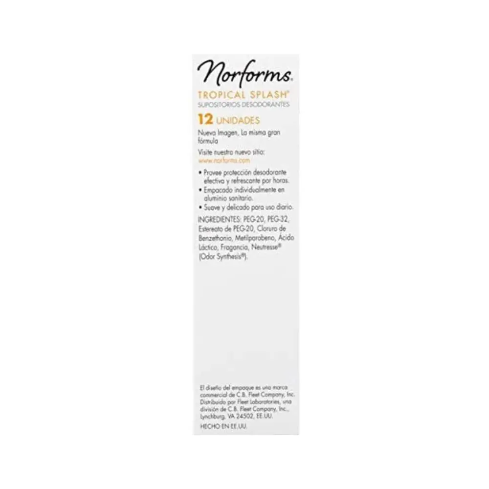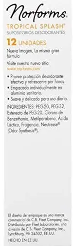 Experience long-lasting freshness and confidence with Norforms Tropical Splash Suppositories. This box contains 12 individually wrapped suppositories, offering a discreet and effective solution for internal odor control. Each suppository is designed to combat odor safely and gently, providing refreshing deodorant protection that lasts for hours. The included applicator ensures easy and comfortable insertion. Norforms suppositories are pH-balanced and have been rigorously tested by both dermatologists and gynecologists to be safe for everyday use. The hypoallergenic formula is gentle on sensitive skin. Enjoy the light, fresh fragrance reminiscent of a tropical rain shower, leaving you feeling clean and confident all day long. Don’t let odor hold you back; choose Norforms for discreet, reliable, and long-lasting odor control. These suppositories work internally to neutralize odor at its source, providing a level of freshness that external washes and sprays simply can’t match. Incorporate Norforms into your daily hygiene routine for a boost of confidence and a feeling of all-day freshness. The subtle tropical splash fragrance adds a touch of paradise to your day, ensuring you feel refreshed and revitalized. Norforms is committed to providing women with safe and effective solutions for their feminine hygiene needs. These suppositories are designed to be gentle on your body while providing maximum odor protection. Take control of your freshness and experience the Norforms difference. With Norforms Tropical Splash, you can face each day with confidence, knowing you have discreet and reliable odor protection on your side.