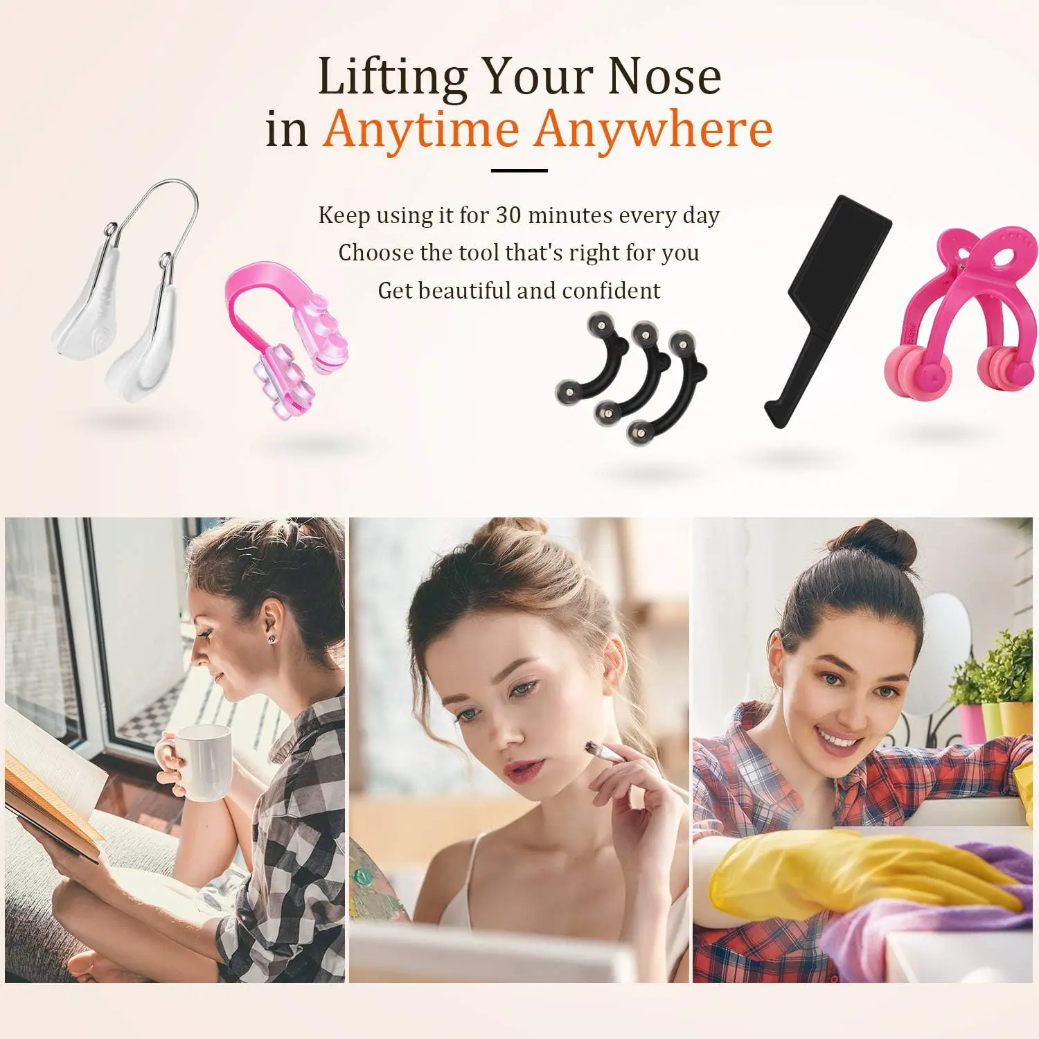 Achieve your desired nose shape with our Nose Up Lifting Clips! This set of 5 nose slimming shapers offers a non-surgical solution for refining your nose’s appearance. These clips are designed for convenience, allowing you to use them while watching TV, reading, or doing chores – easily fitting into your busy schedule. The package includes 4 different styles of clips, providing options to find the perfect fit and comfort for your nose. Remember to avoid using them while sleeping or bathing. Crafted from soft silicone and plastic, these nose lifters are durable, non-toxic, and safe for regular use. Their small size ensures they are easily portable, allowing you to maintain your beauty routine wherever you go. Consistent use of these nose up lifting tools can help to beautify your nose and enhance your overall appearance. For optimal results, we recommend wearing the clips for less than half an hour each day and discontinuing use if you experience any discomfort. Start your journey towards a more refined nose and a more confident you! These Nose Up Lifting Clips are your affordable and convenient solution to reshape your nose without expensive and invasive surgery.