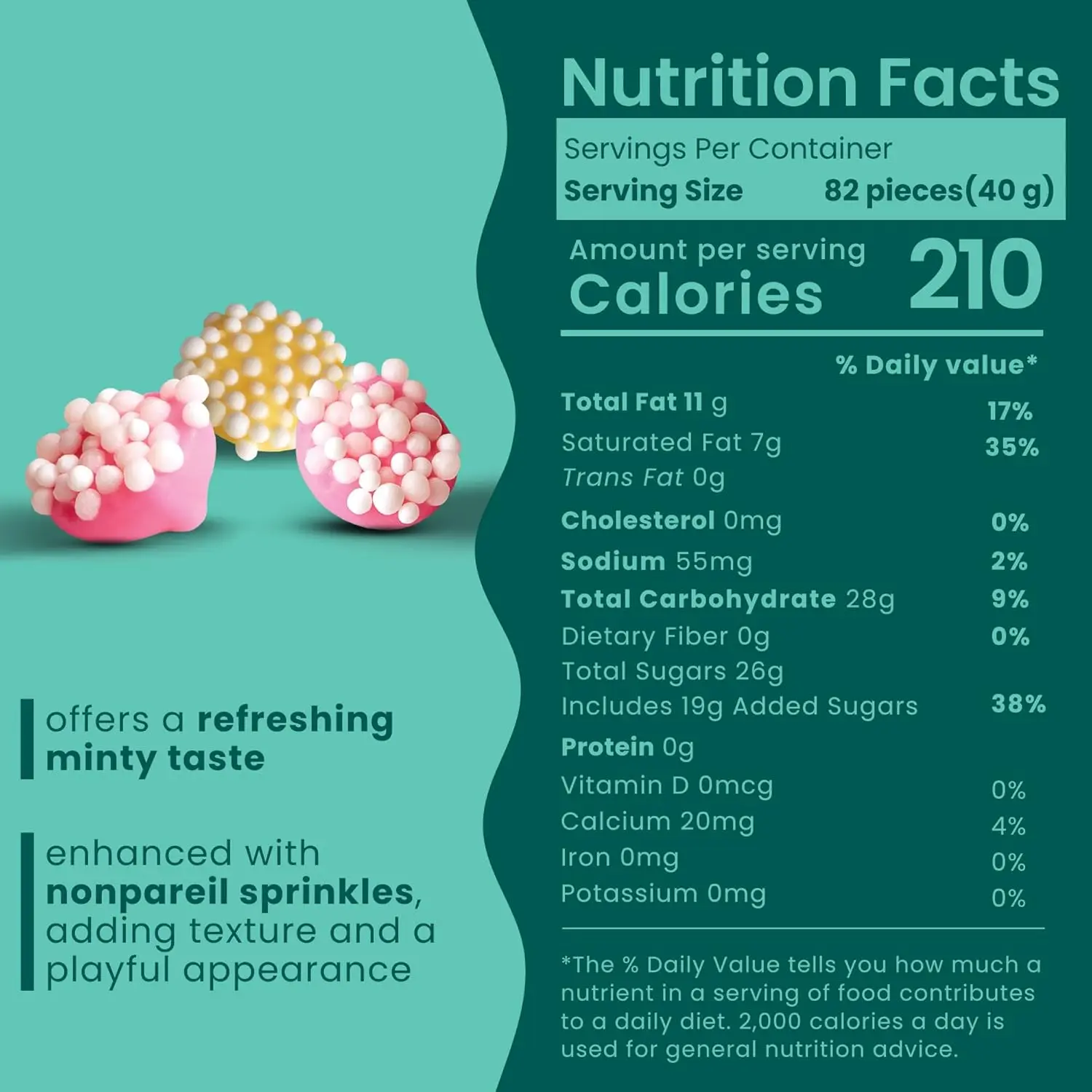 Experience the nostalgic joy of these miniature mints, perfect for satisfying your sweet cravings, adding a touch of elegance to your dessert table, or simply enjoying as a refreshing pick-me-up throughout the day. The vibrant colors and unique texture of the nonpareils make them a visually appealing treat that’s sure to delight both young and old.