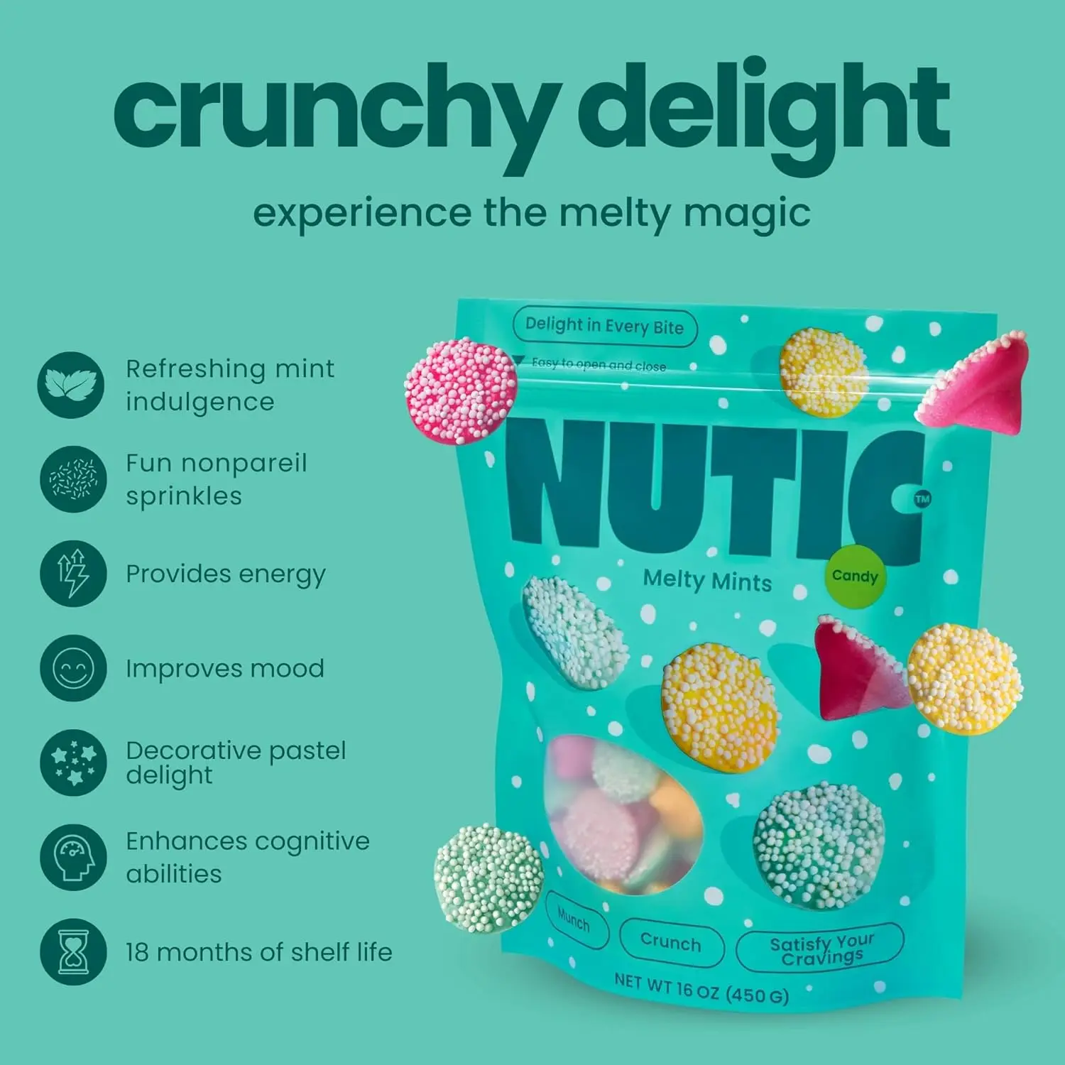 Delight in Nutic Pastel Mints! Refreshing mint flavor, decorative pastel colors with nonpareil sprinkles. Perfect for parties, holidays, and sweet treats. Made in the USA.