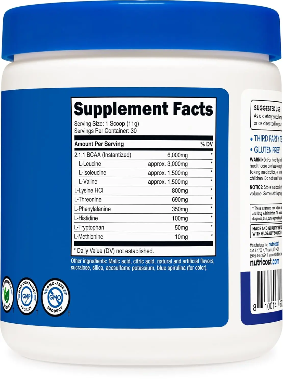 • Includes 2:1:1 Instantized BCAAs (L-Leucine, L-Isoleucine, L-Valine)