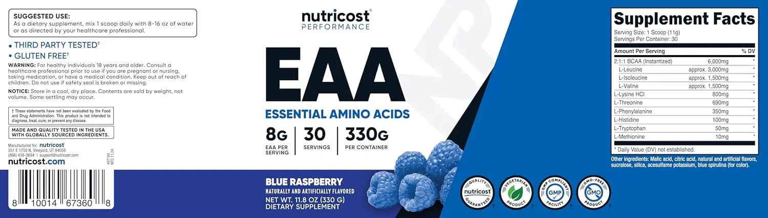 Fuel your fitness journey with Nutricost Blue Raspberry EAA Powder! This delicious and refreshing supplement provides a potent blend of essential amino acids to support muscle recovery, growth, and overall performance. Each serving delivers 8g of EAAs, including a 2:1:1 ratio of instantized BCAAs (L-Leucine, L-Isoleucine, L-Valine) for optimal muscle protein synthesis. We’ve also included L-Lysine HCl, L-Threonine, L-Phenylalanine, L-Histidine, L-Tryptophan, and L-Methionine to ensure you’re getting a complete amino acid profile. Nutricost is committed to quality, so every batch of our EAA powder is rigorously tested by independent, ISO-accredited laboratories to guarantee safety and purity. Our essential amino acids are manufactured in a GMP Compliant and FDA Registered Facility, giving you peace of mind knowing you’re consuming a product made to the highest standards. Plus, it’s non-GMO and gluten-free, making it suitable for a wide range of dietary needs. With 30 servings per container, you’ll have plenty of fuel to power through your workouts and support your fitness goals. Enjoy the delicious Blue Raspberry flavor and experience the Nutricost difference! Elevate your training with this essential supplement and unlock your full potential.