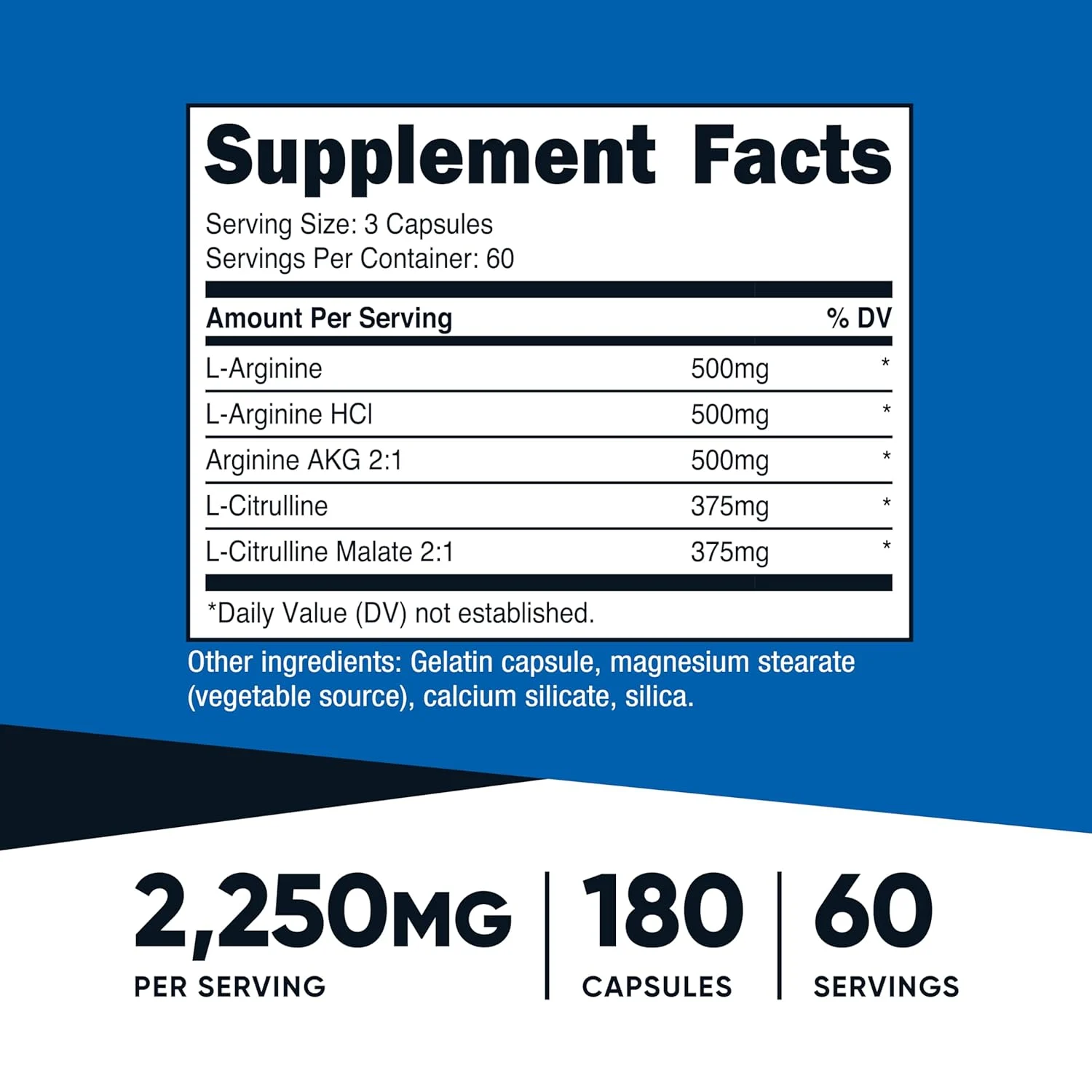 Boost your workouts and support overall wellness with Nutricost Nitric Oxide Booster! Each serving delivers a potent 2250mg of nitric oxide boosting ingredients, helping to enhance blood flow and nutrient delivery to your muscles. This bottle contains 180 capsules, providing a generous 60-serving supply, lasting you for two full months when taken as directed. Nutricost is committed to quality. This product is Non-GMO, Soy Free, and Gluten Free, making it suitable for a variety of dietary needs. For your peace of mind, every batch is 3rd party tested, ensuring purity and potency. Our Nitric Oxide Booster is manufactured in an NSF Certified and GMP Compliant facility, registered with the FDA, adhering to the highest standards of quality and safety. Experience the Nutricost difference and unlock your potential! Fuel your body with the best, and achieve your fitness goals more effectively. Whether you’re an athlete, fitness enthusiast, or simply looking to improve your overall health, Nutricost Nitric Oxide Booster is a great addition to your daily regimen. Increase your energy, enhance your endurance, and support your cardiovascular health with this premium supplement.