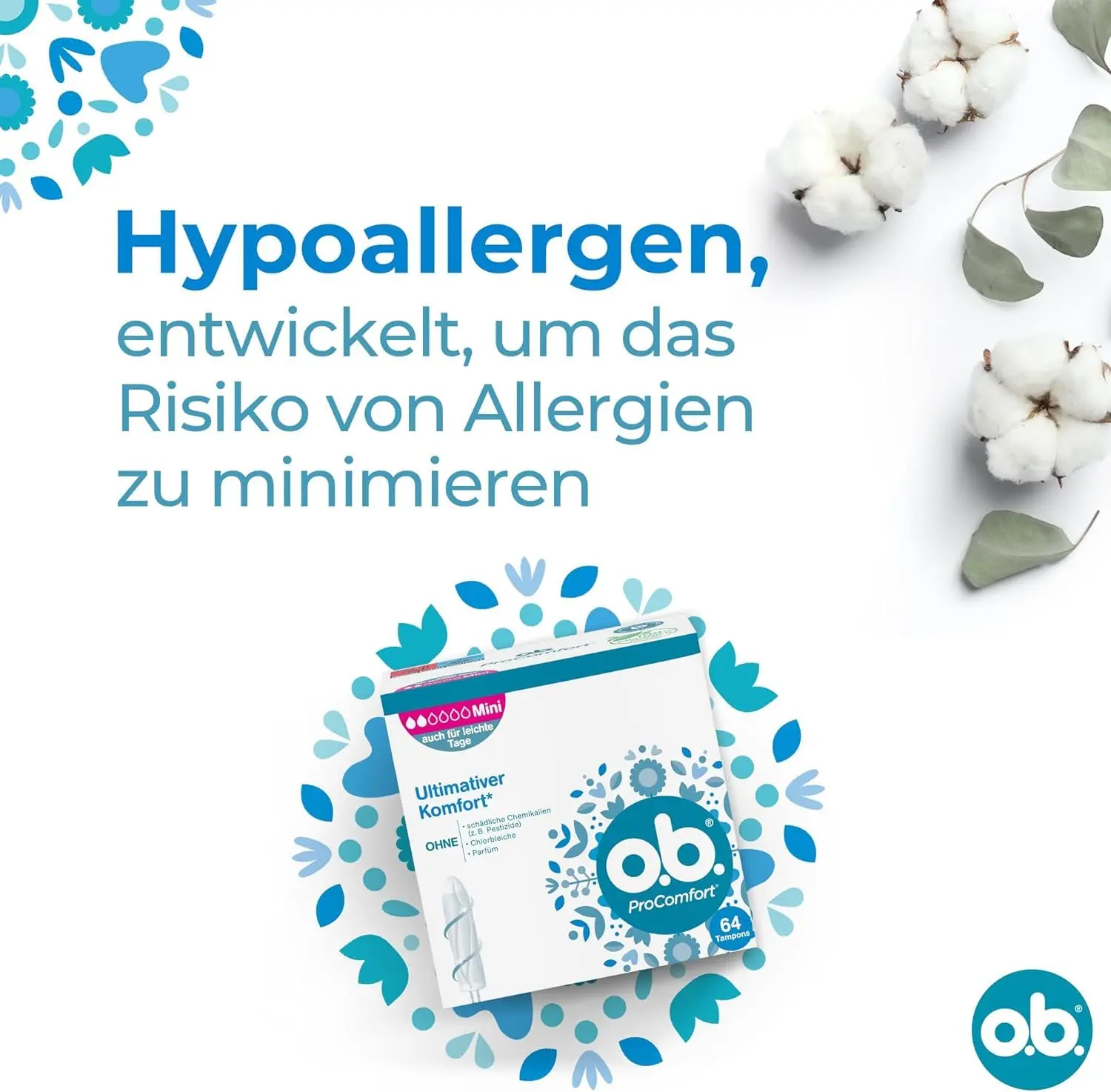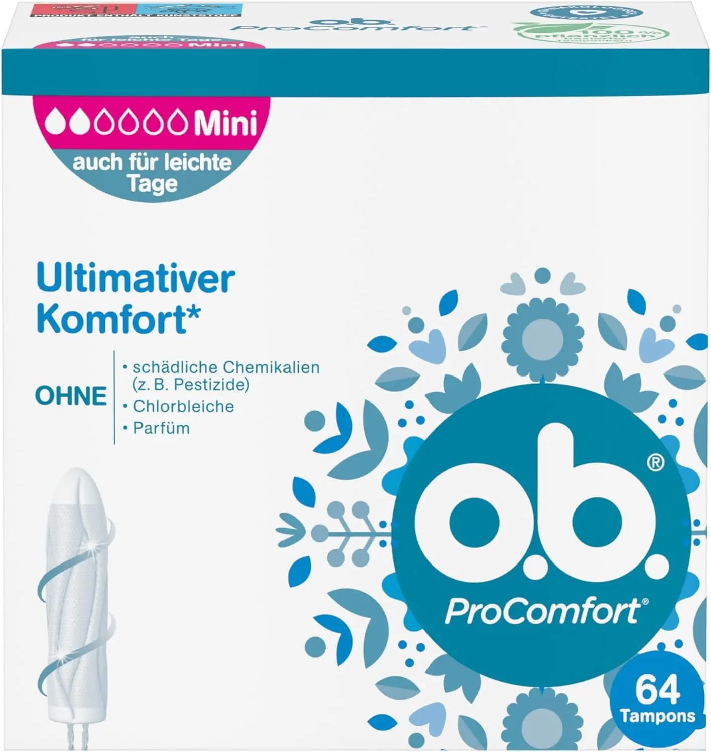 o.b. ProComfort Mini Tampons deliver ultimate comfort* (*within o.b. assortments) & reliable protection. With SilkTouch & Dynamic Fit. 100% plant-based core. 64 count.