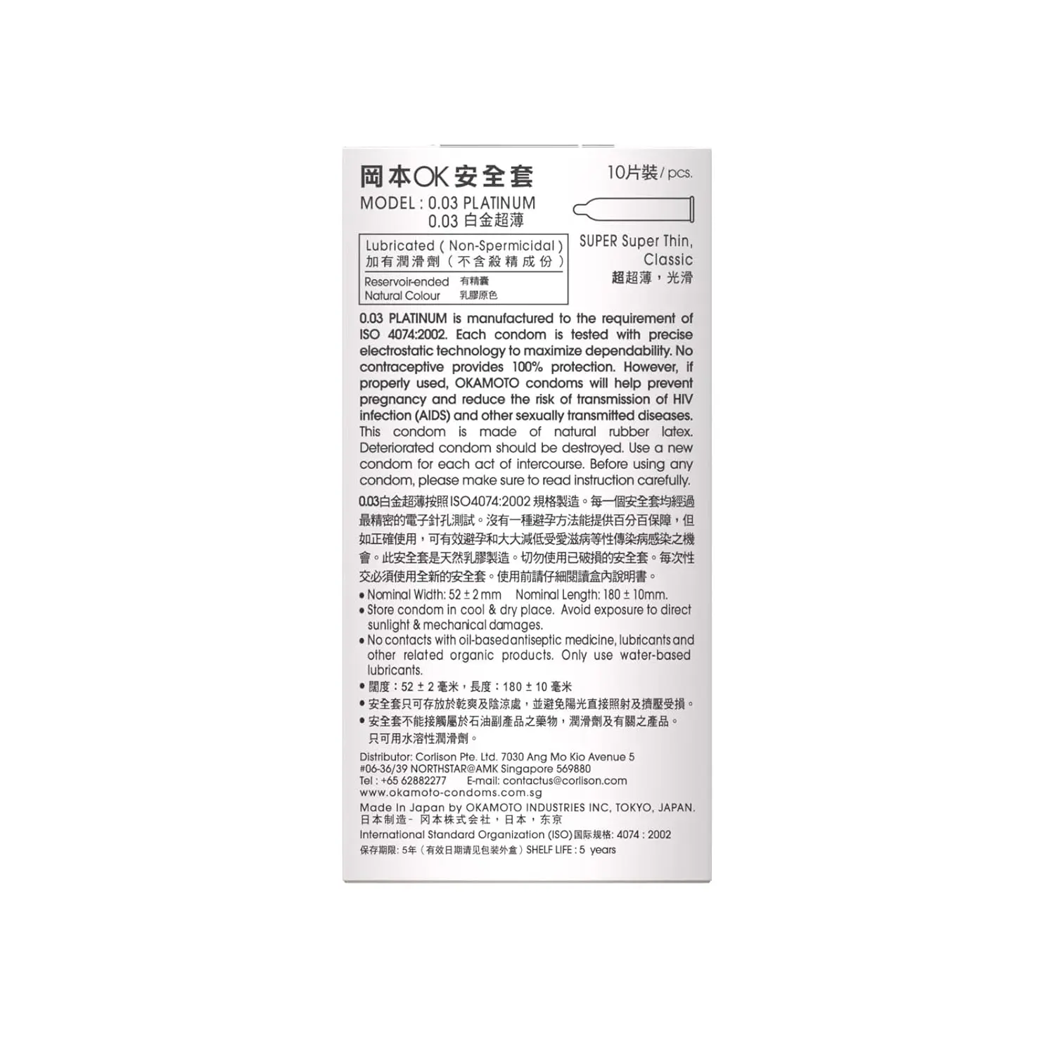 Experience unparalleled sensitivity and protection with Okamoto 0.03 Platinum Ultra Thin Condoms. Crafted with advanced technology, these condoms offer a barely-there feel, allowing you to connect with your partner on a deeper level. Made from Sheerlon, Okamoto’s specially formulated latex, these condoms are incredibly thin yet remarkably strong and reliable. Enjoy peace of mind knowing you’re protected without sacrificing pleasure. The ultra-thin design enhances natural sensations, making intimacy more satisfying for both partners. Each condom is rigorously tested to ensure the highest standards of quality and safety. Discover the difference that ultra-thin can make and elevate your intimate experiences. These condoms are designed for maximum comfort and sensitivity. With Okamoto 0.03 Platinum, you can prioritize both pleasure and protection, ensuring a worry-free and fulfilling intimate life.