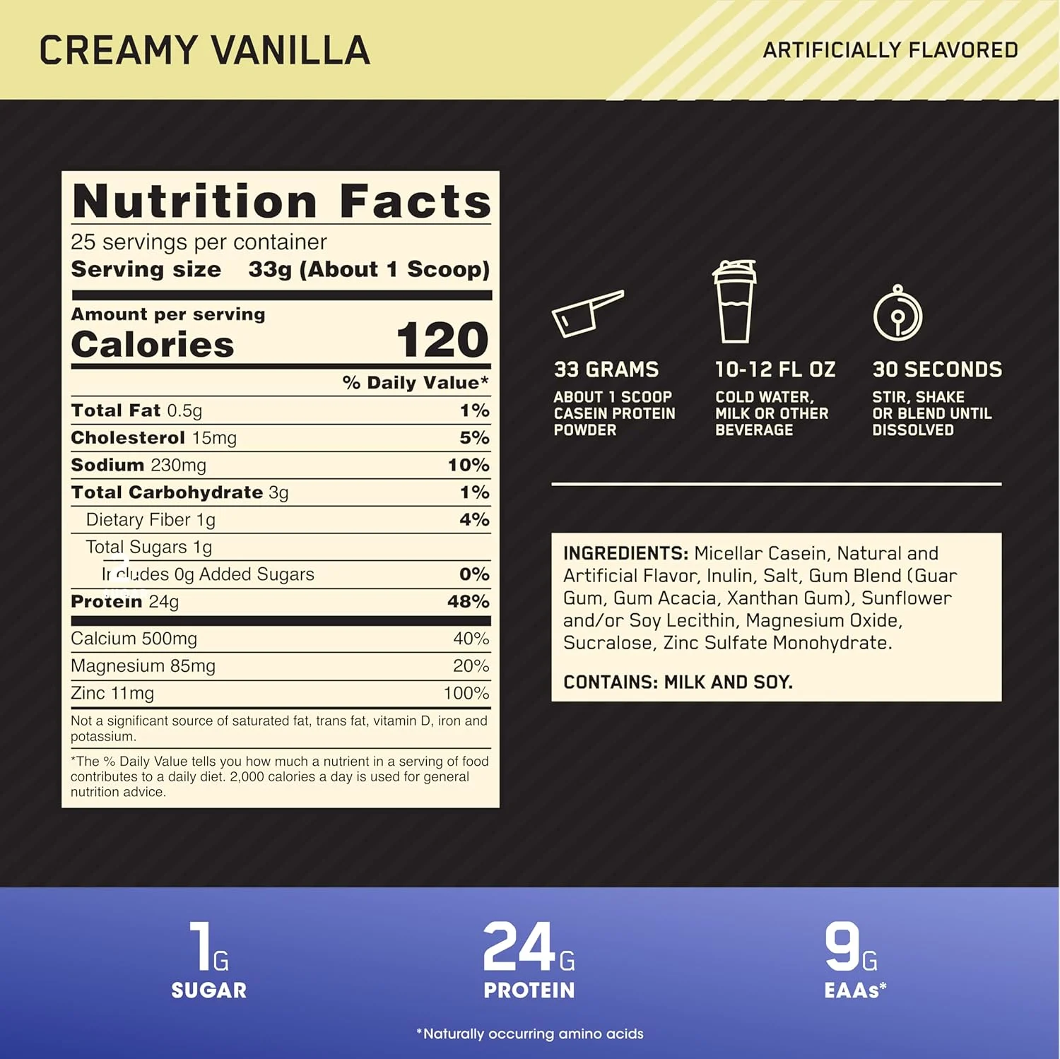 ON Gold Standard Casein Protein Powder delivers 24g of slow-digesting protein with naturally occurring BCAAs and Glutamine to support muscle recovery while you sleep. Vanilla flavor.
