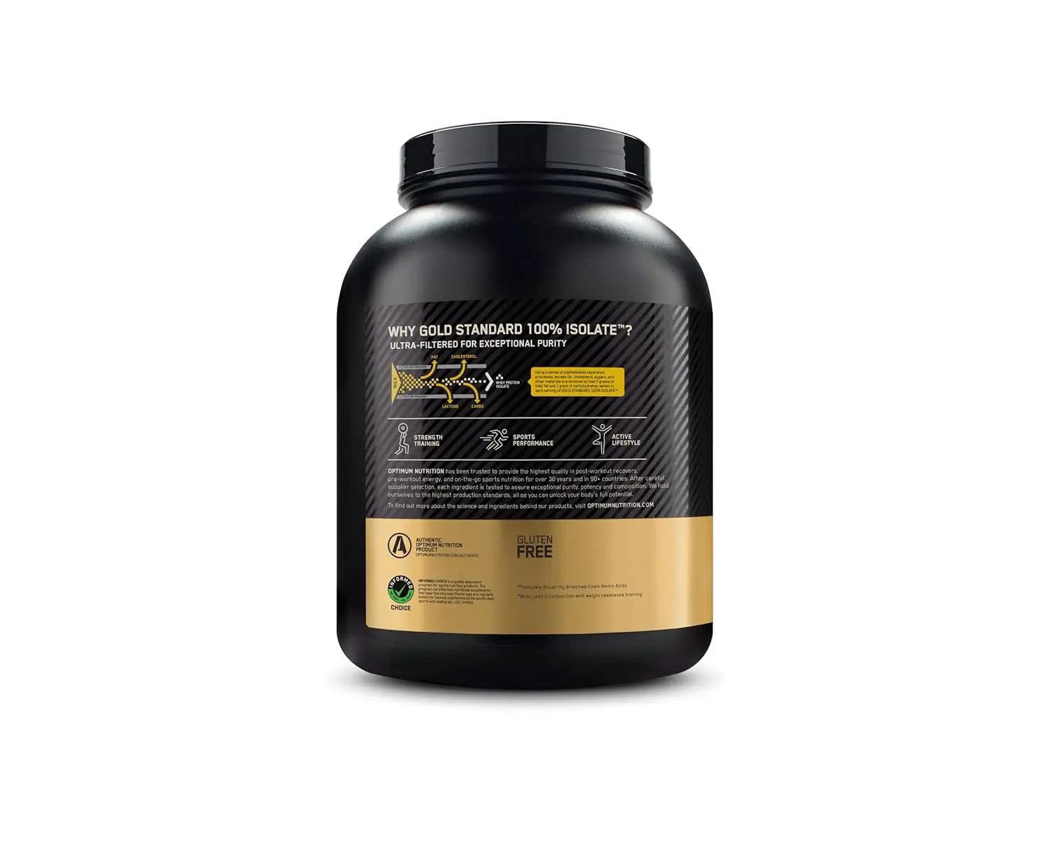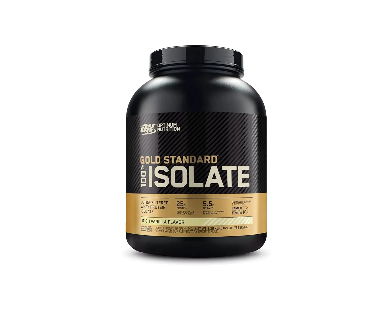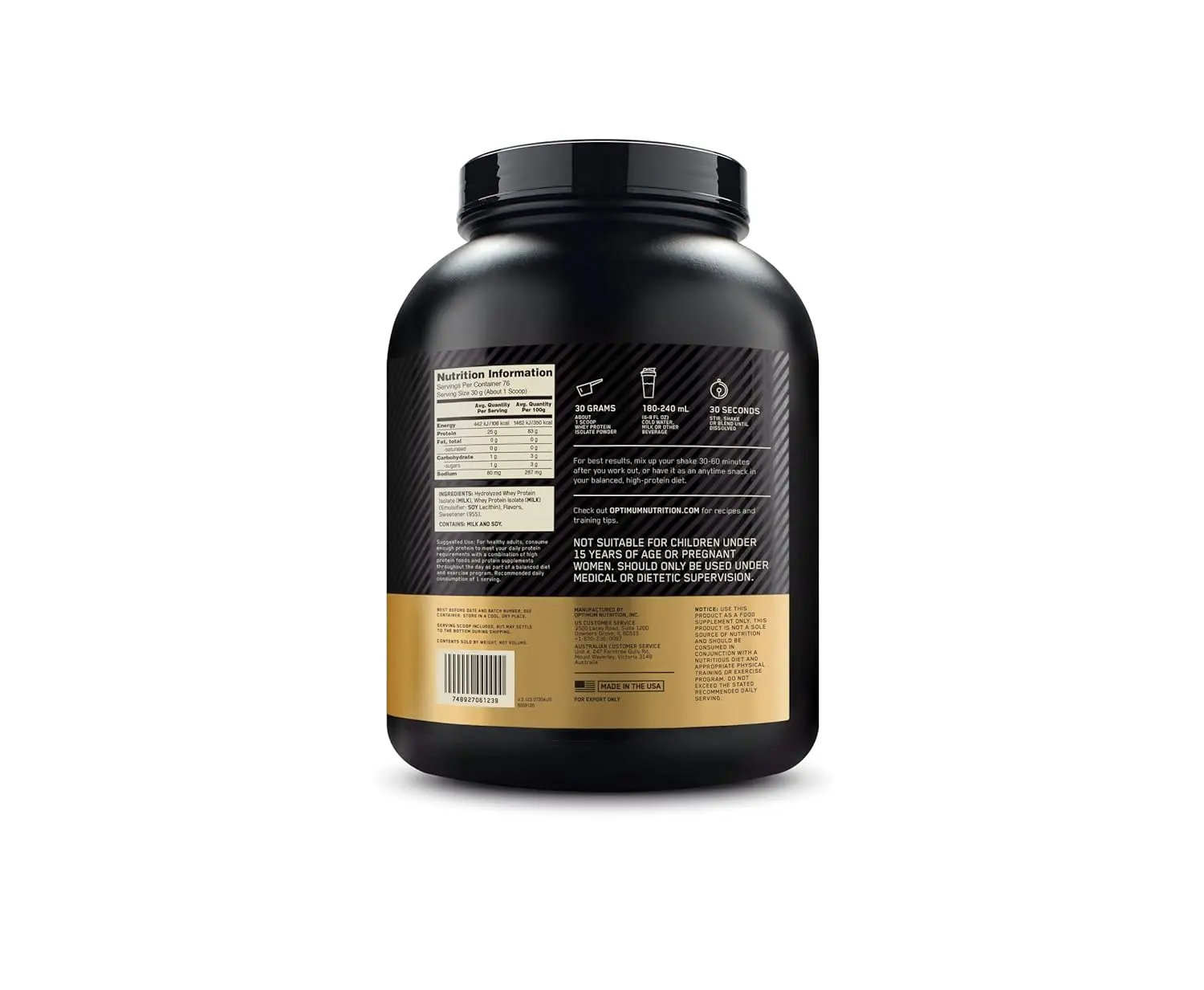 Fuel your muscles with ON Gold Standard Isolate Vanilla Whey Protein, the pinnacle of protein purity and delicious flavor! This exceptional protein powder delivers 25 grams of high-quality protein per serving, derived from hydrolyzed and ultra-filtered whey protein isolate. The advanced filtration process removes excess fat, cholesterol, and lactose, leaving you with a lean and clean protein source. Each serving contains only 1 gram of carbs, making it perfect for those watching their carbohydrate intake. Experience the smooth and creamy vanilla flavor by simply mixing one scoop with 6 to 8 fl. oz. of cold water. ON Gold Standard Isolate also boasts an impressive amino acid profile, including 5.5 grams of naturally occurring BCAAs to support muscle recovery and growth, 4.3 grams of naturally occurring Glutamine & Glutamic Acid to aid in immune function and muscle repair, and 11.4 grams of Naturally Occurring Essential Amino Acids which is critical for overall muscle health and performance. Whether you’re an athlete striving for peak performance or simply looking to increase your daily protein intake, ON Gold Standard Isolate Vanilla Whey Protein is the ideal choice to help you reach your fitness goals. This product allows you to have fast recovery from tough workouts and ensures that your muscles are getting the nutrients they need to grow and develop. Enjoy your protein shake and feel good knowing you’re giving your body the very best. This high-quality isolate ensures that you are optimizing your protein intake for the maximum benefits that are possible.