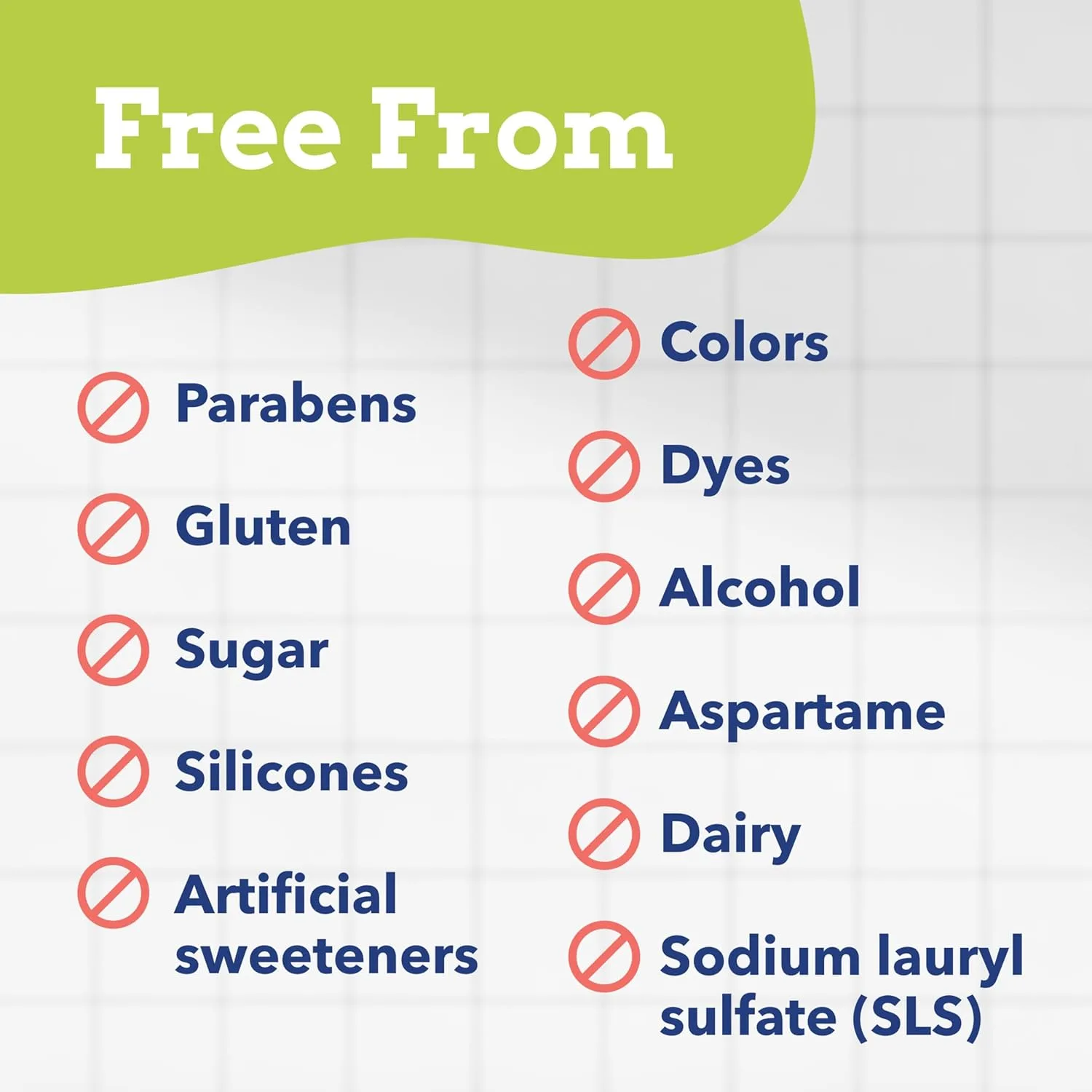 • Free From: Parabens, Sugar, Gluten, Silicones, Alcohol, SLS, Dairy, Aspartame, Artificial Preservatives, Colors, Dyes & Sweeteners