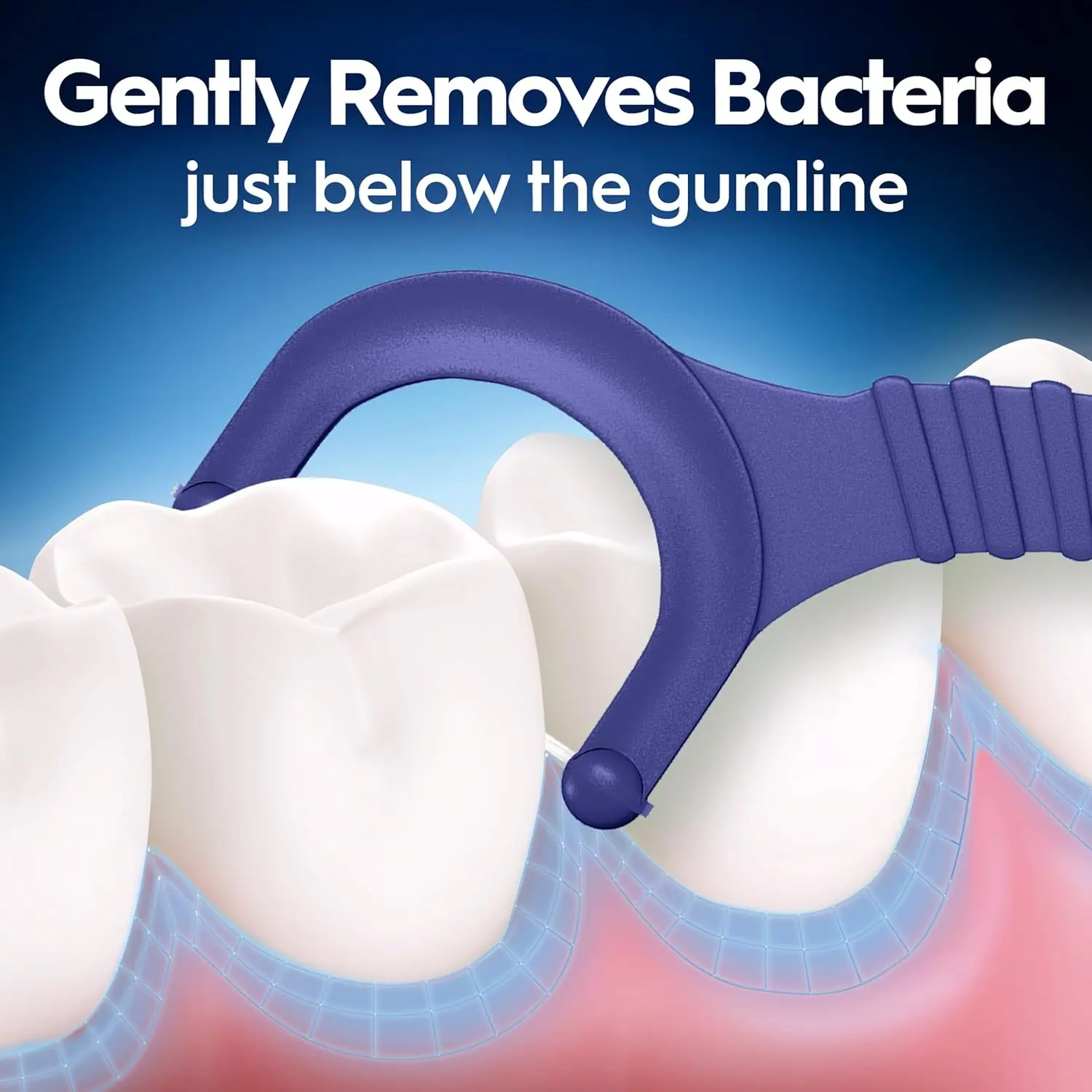 • Cleans between teeth and below the gumline