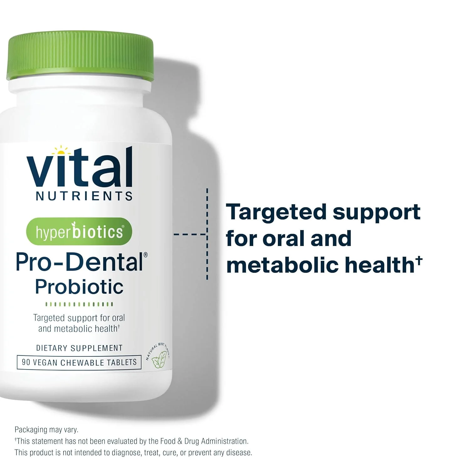 Fight bad breath and support optimal oral health with our premium oral probiotics! This research-backed formula features 4 targeted, clinically studied probiotic strains, including BLIS K12 and M18, plus chelated zinc. These delicious mint chewable tablets help replenish the good bacteria in your oral microbiome, promoting healthy teeth and gums. Maintaining a balanced oral microbiome benefits your ears, nose, and throat, which are essential for a robust immune system. Our pro-dental oral probiotic introduces beneficial bacteria to your mouth, nose, throat, ears, and sinuses, helping to decrease bad bacteria and plaque buildup throughout your mouth and digestive tract. These well-studied, dairy-free BLIS probiotic strains, specifically Streptococcus salivarius K12 and M18, have been clinically proven to crowd out harmful bacteria that cause tooth decay and bad breath. We’re the first to deliver dairy-free BLIS strains! Our unique strains have more scientific research backing their oral health benefits than other strains like Lactobacillus salivarius. Enjoy an easy 1-per-day regimen with our clean, shelf-stable, vegan formula. No refrigeration required! It’s free from gluten, dairy, peanut, tree nut, fish, shellfish, soy, sesame, egg, and active yeast. Non-GMO and made without artificial fillers, coatings, binders, or colors. Vital Nutrients Hyperbiotics supplements are manufactured in an NSF-certified facility. Our rigorous quality assurance program includes third-party independent laboratory testing of raw ingredients and finished products for purity and potency, ensuring what’s on the label is what’s in the bottle. Vital Nutrients has been trusted by healthcare practitioners and health-conscious consumers for over 30 years.