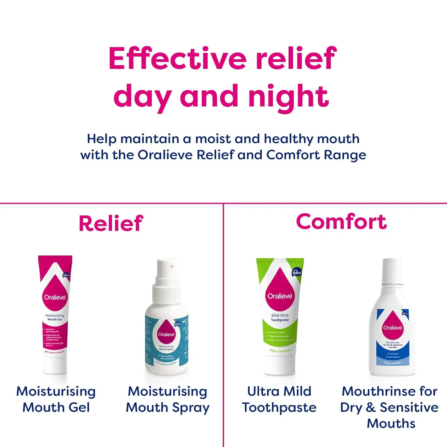 Oralieve Dry Mouth Relief Spray provides instant and long-lasting relief from dry mouth discomfort. Its gentle, sugar-free formula moisturizes and lubricates oral tissues.
