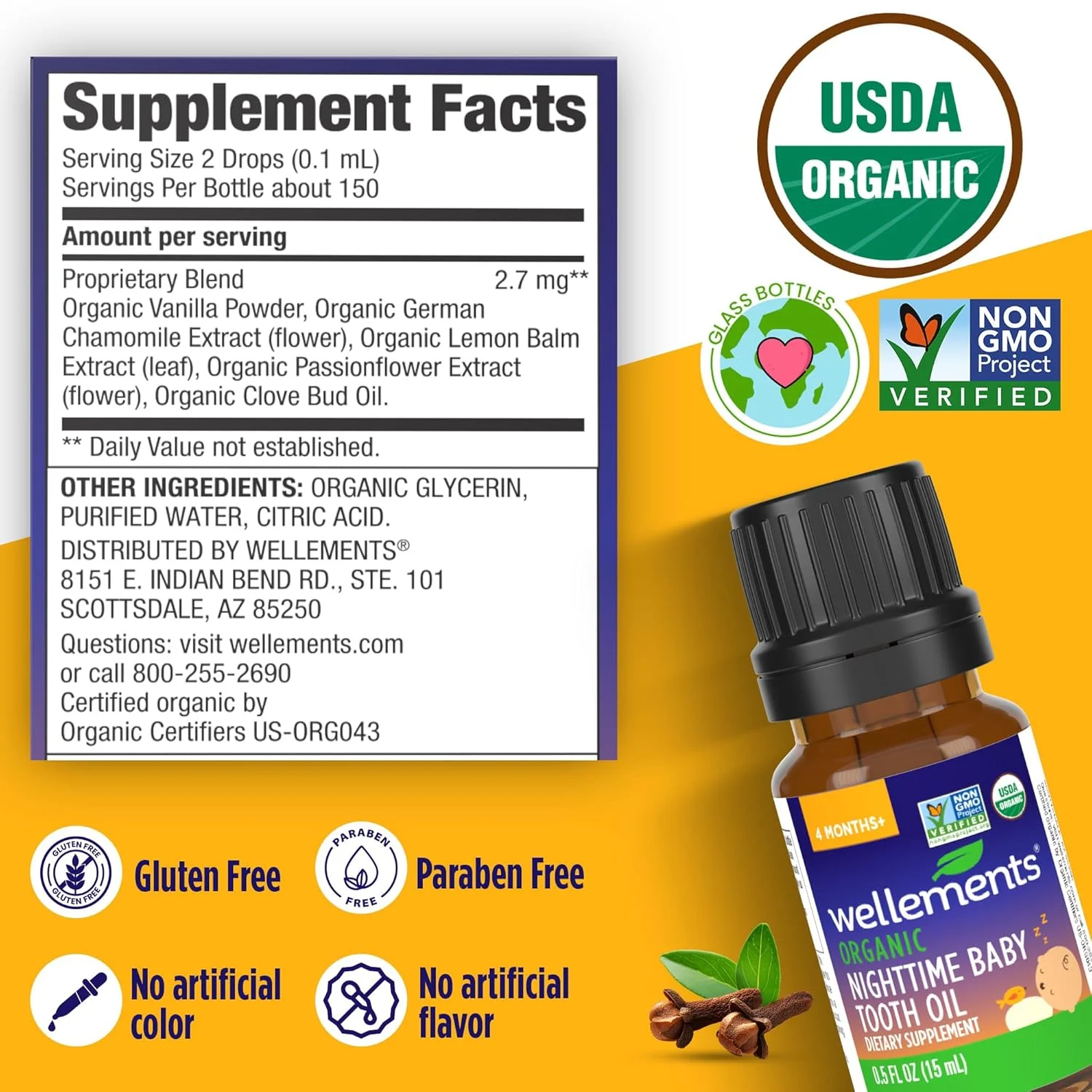 Our Organic Nighttime Tooth Oil is USDA Certified Organic, Non-GMO Project Verified, and Vegan Action Certified. You can rest assured that you’re using a product that meets the highest standards of quality and purity. Plus, it’s FREE FROM artificial colors, artificial flavors, belladonna, benzocaine, parabens, gluten, and the top 9 most common allergens, making it a safe and worry-free choice for your little one.