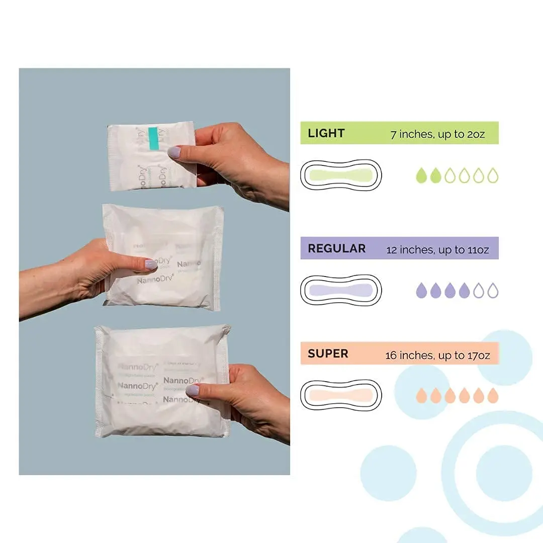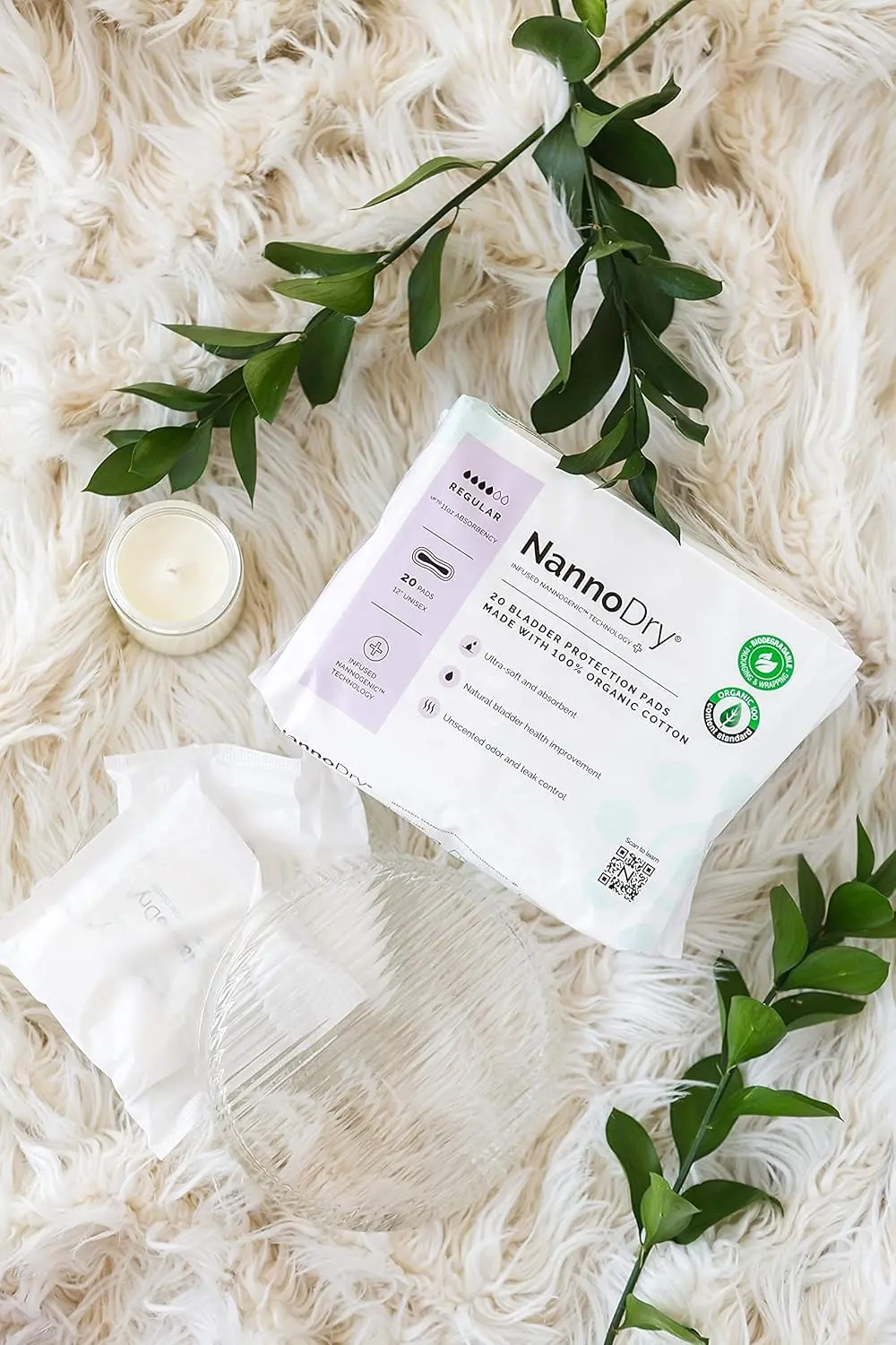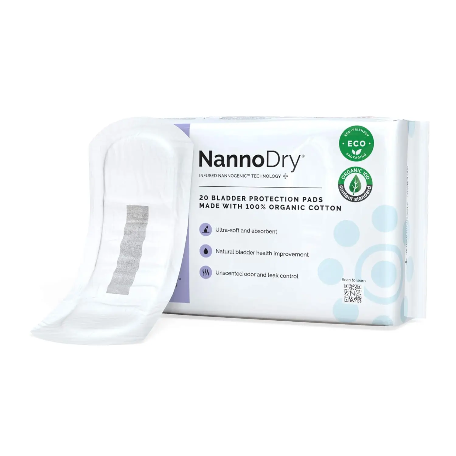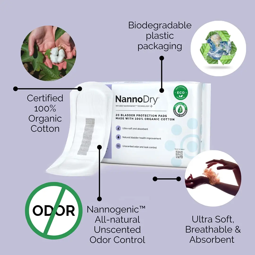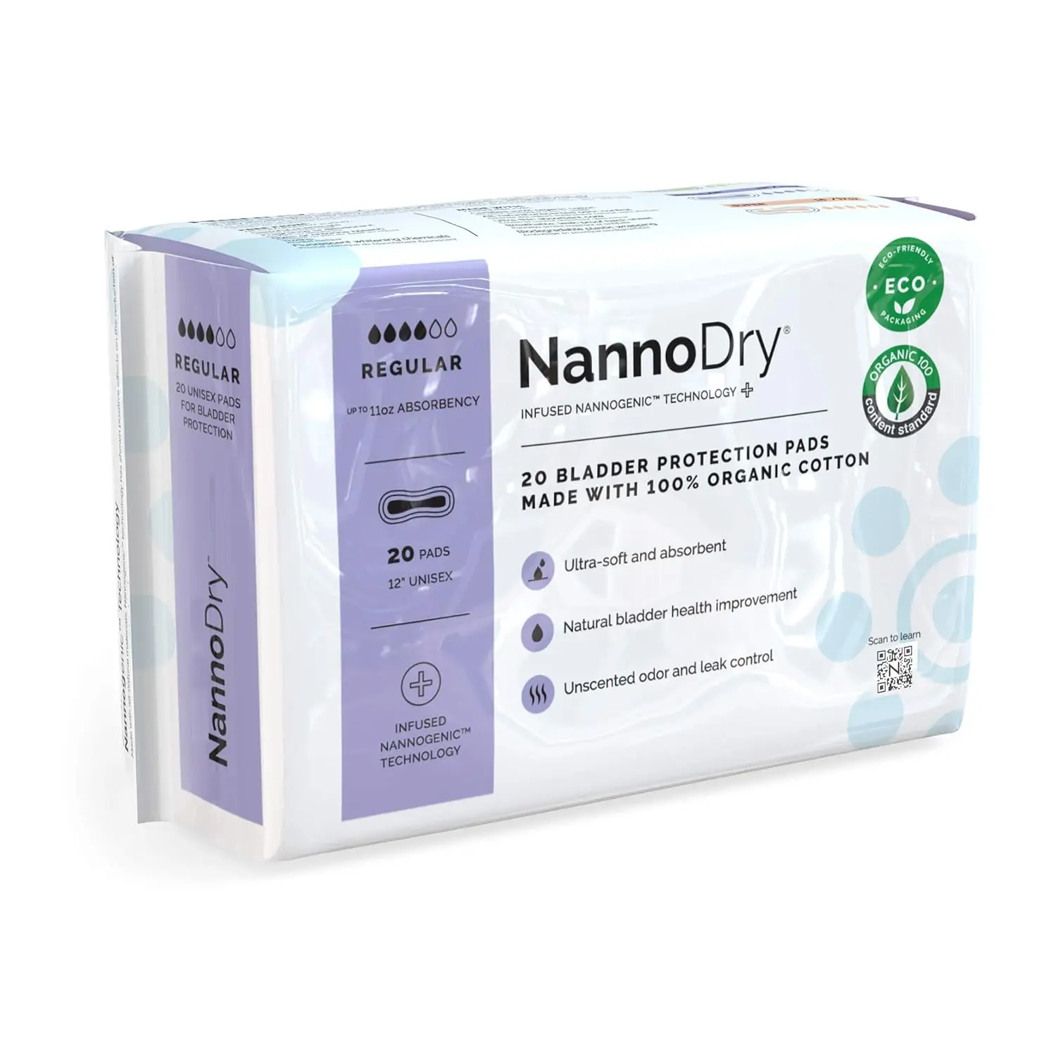 Experience discreet and reliable bladder protection with NannoDry Organic Incontinence Pads. Designed for both women and men, these pads offer exceptional absorbency and comfort, allowing you to confidently manage leaks throughout your day. NannoDry pads utilize a thin, highly absorbent core capable of holding up to 11 oz of fluid, ensuring maximum dryness without added bulk. Made with 100% OCS organic cotton, these pads are gentle on sensitive skin and free from harsh chemicals like fragrances, dyes, toxins, and chlorine bleach, promoting optimal bladder health. The breathable, leak-proof back sheet provides an extra layer of security, preventing embarrassing accidents and keeping you feeling fresh and dry. NannoDry pads are individually wrapped in eco-friendly, biodegradable packaging, reflecting our commitment to sustainability. Recommended by dermatologists and urogynecologists, NannoDry pads are a safe and effective solution for managing stress incontinence, light bladder leakage during pregnancy, postpartum, menopause, or BPH-related leakage. The fragrance-free and unscented design ensures discreet odor control, while the all-natural materials promote breathability and comfort. Choose NannoDry for reliable protection and peace of mind. Use the NannoDry Regular pad as needed for daytime use, spurts, or moderate leaks.