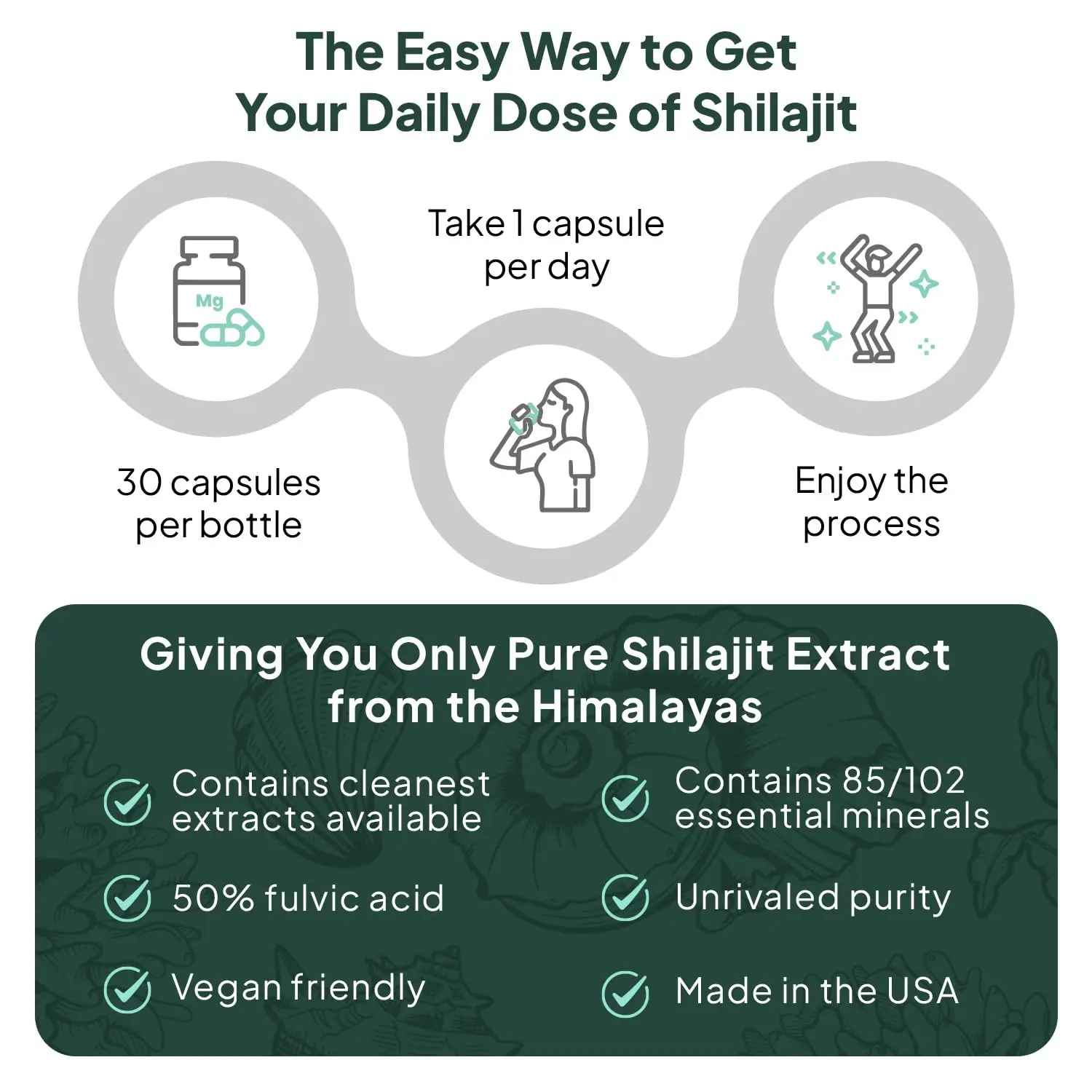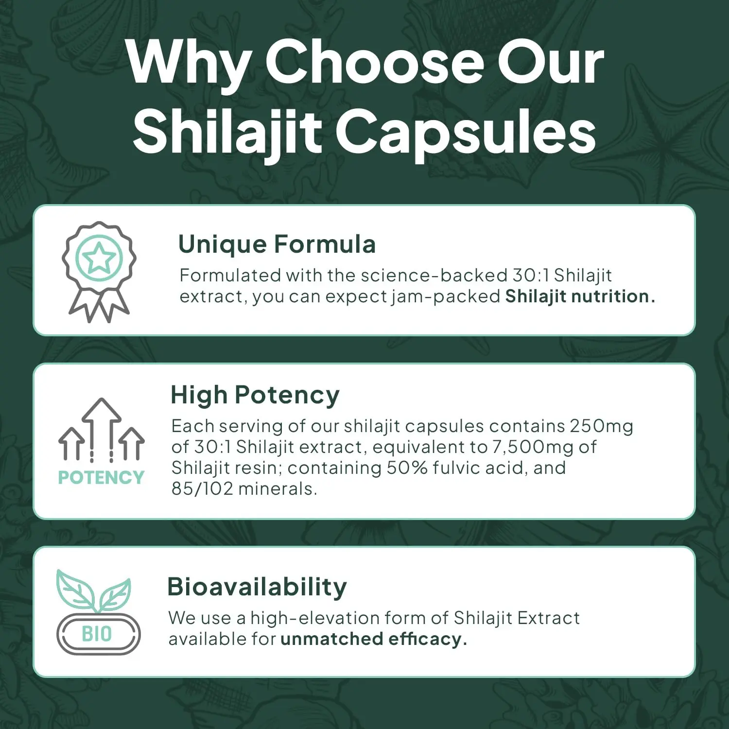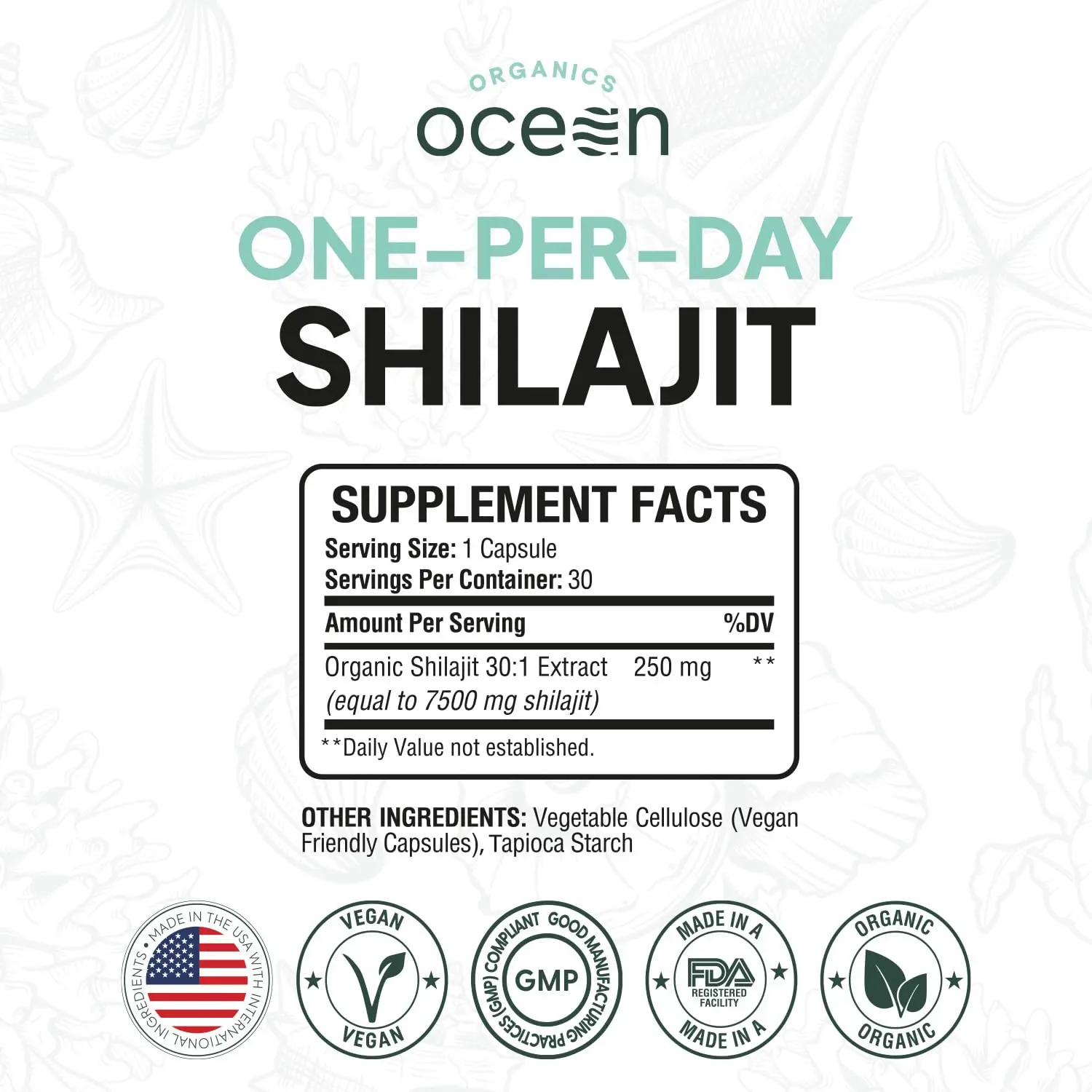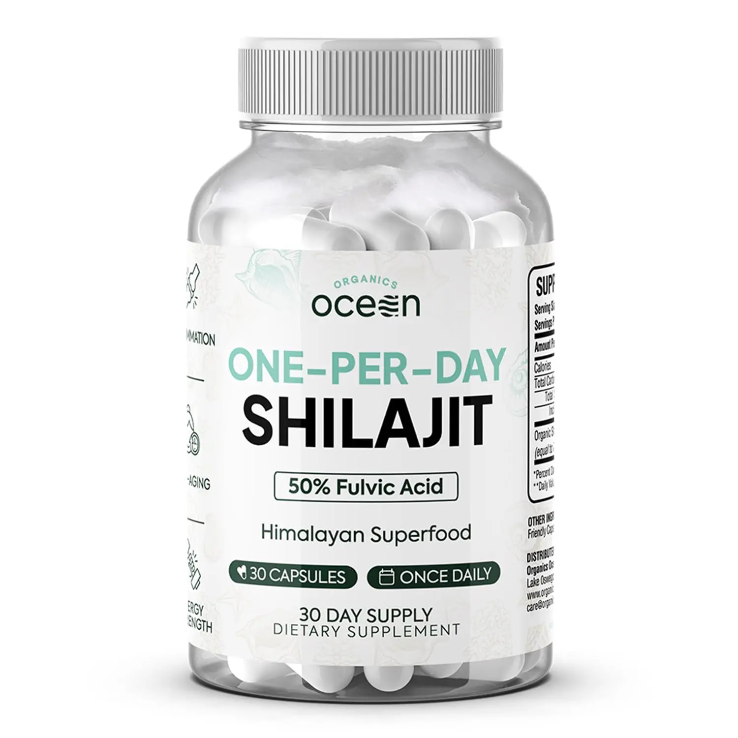 Experience the power of Organics Ocean Shilajit, a premium, all-natural supplement sourced directly from the pristine Himalayan mountains. Our meticulously crafted Shilajit capsules offer a potent and convenient way to harness the age-old benefits of this remarkable substance. Unlike traditional shilajit resin, our capsules deliver a standardized dose of 250mg of a patent-protected, extensively studied, hyper-refined organic shilajit extract, equivalent to 7500mg of organic shilajit resin. This ensures you receive consistent and reliable results with every serving. Rich in over 50% fulvic acid and 85 trace minerals, Organics Ocean Shilajit supports healthy aging, boosts immunity, and promotes hormonal balance for both men and women. Sourced from elevations above 12,000 feet, our shilajit is significantly purer than alternatives sourced from China. We prioritize your well-being by formulating our capsules with only one additive, ensuring a clean and natural experience. Say goodbye to messy jars and unpleasant tastes – our one-per-day capsule offers a clean, convenient, and potent solution for incorporating shilajit into your daily routine. Unlock the potential for healthier skin, balanced hormones, and a strengthened immune system with Organics Ocean Shilajit. Embrace the natural power of the Himalayas and experience the difference that quality and purity can make. Choose Organics Ocean for a science-backed, vegan-friendly shilajit supplement that delivers exceptional results.